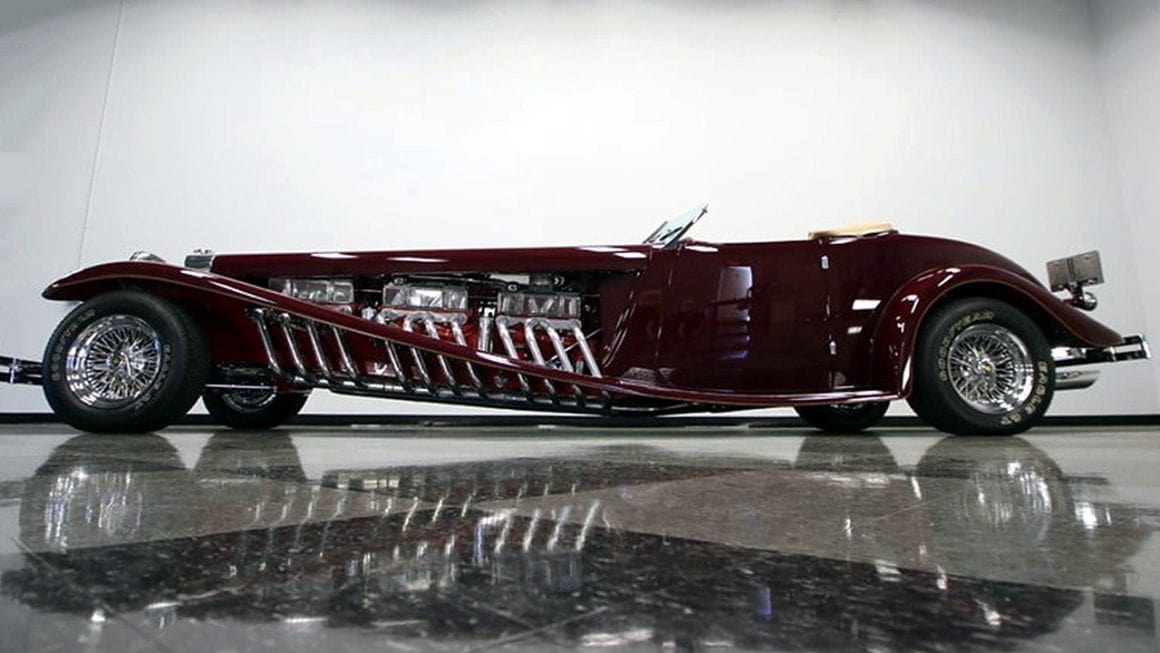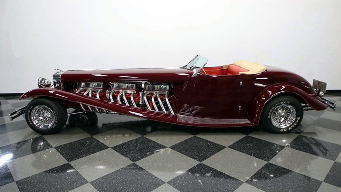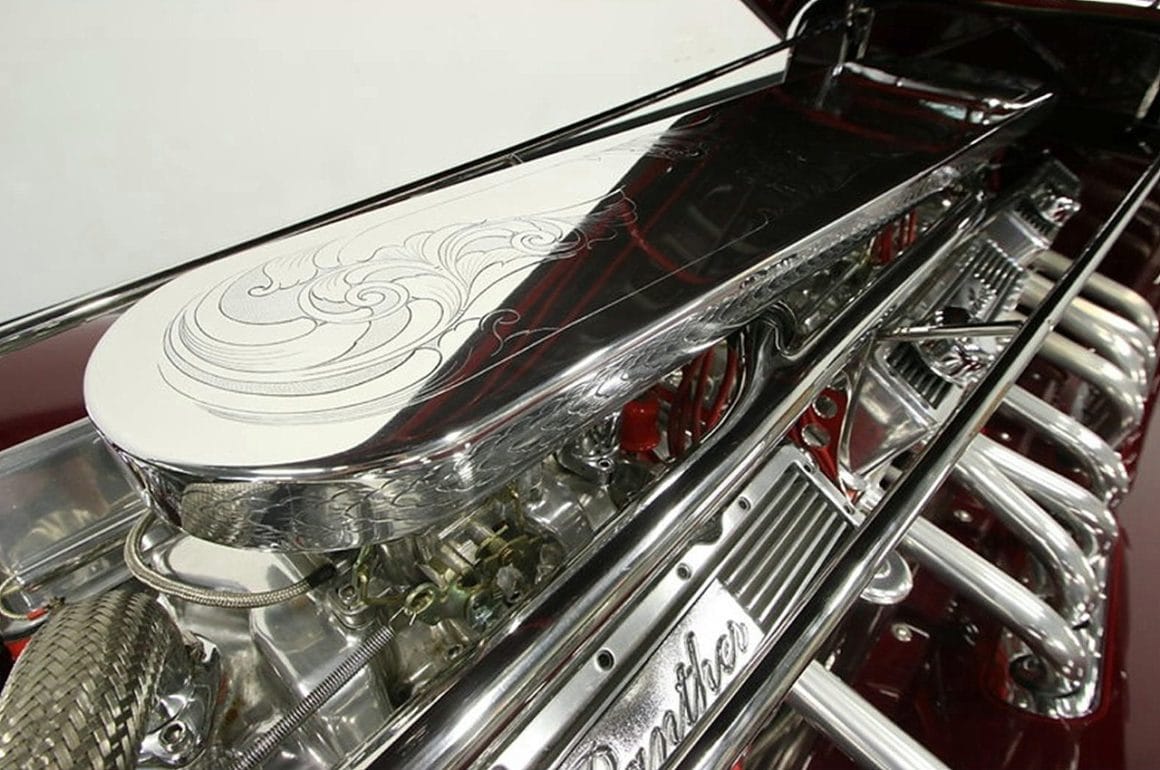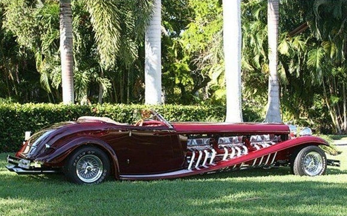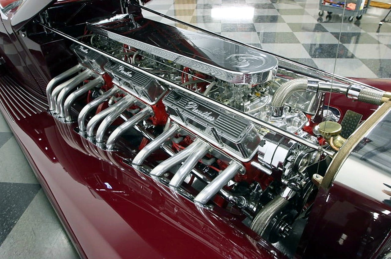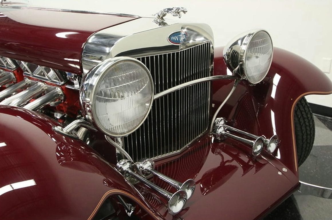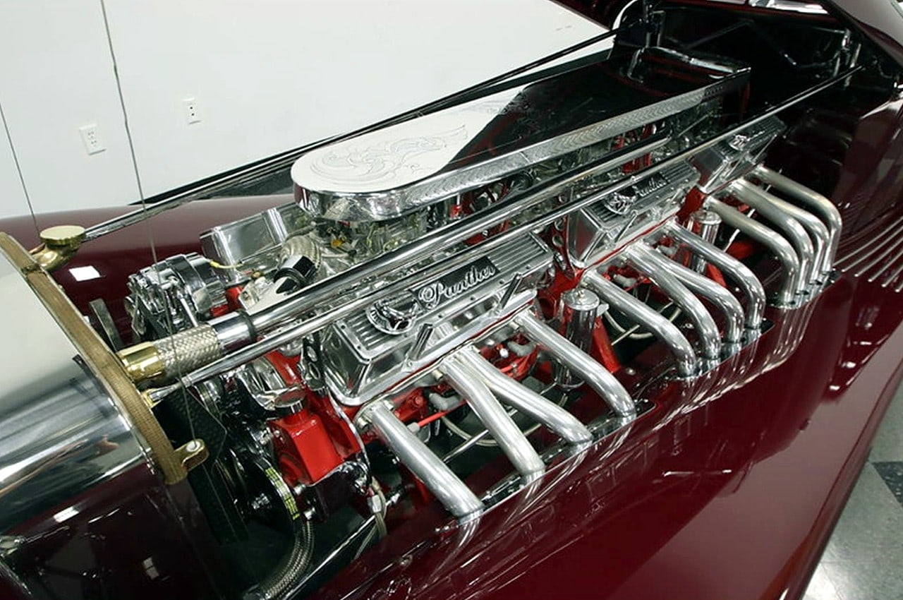 Il s’agit selon les documents d’immatriculation (le Title américain), d’une “1985 Custom Panther”…, en réalité ce n’est pas une Panther, même s’il y a un badge Panther sur la calandre…, c’est un pur kit plastique de Hot-Rod B’32 dont le capot a été allongé façon Clénet de façon à pouvoir y loger 3 moteurs…, l’engin a été manifestement conçu par un dingo qui aimait les dessins animés, car qui d’autre dans le monde serait capable de s’embarquer dans une telle construction ?