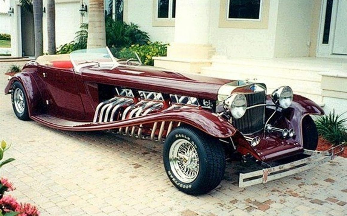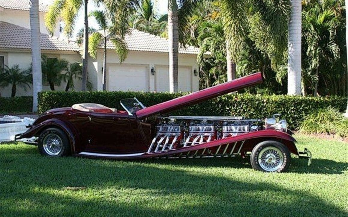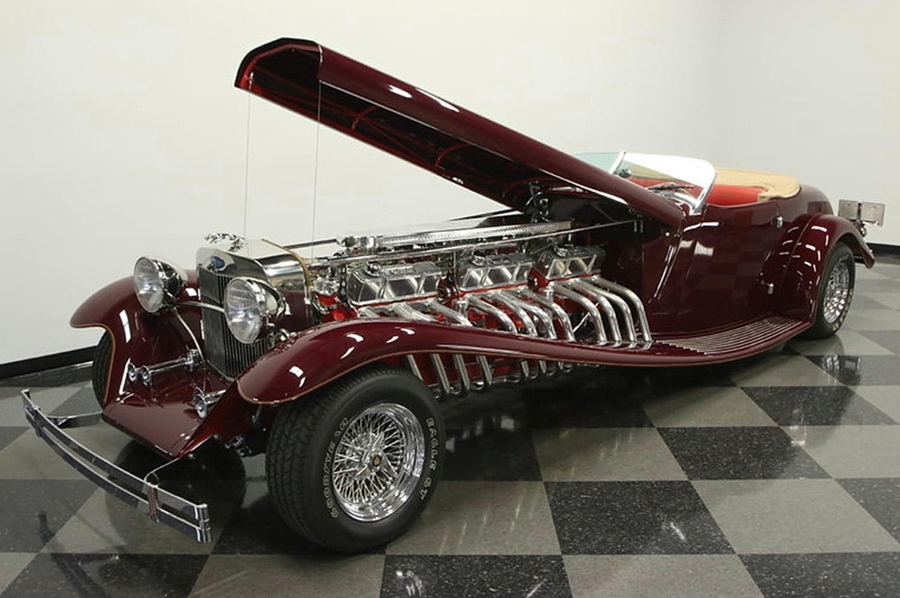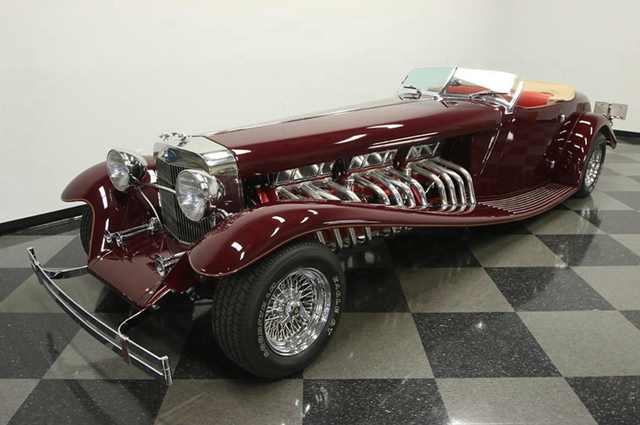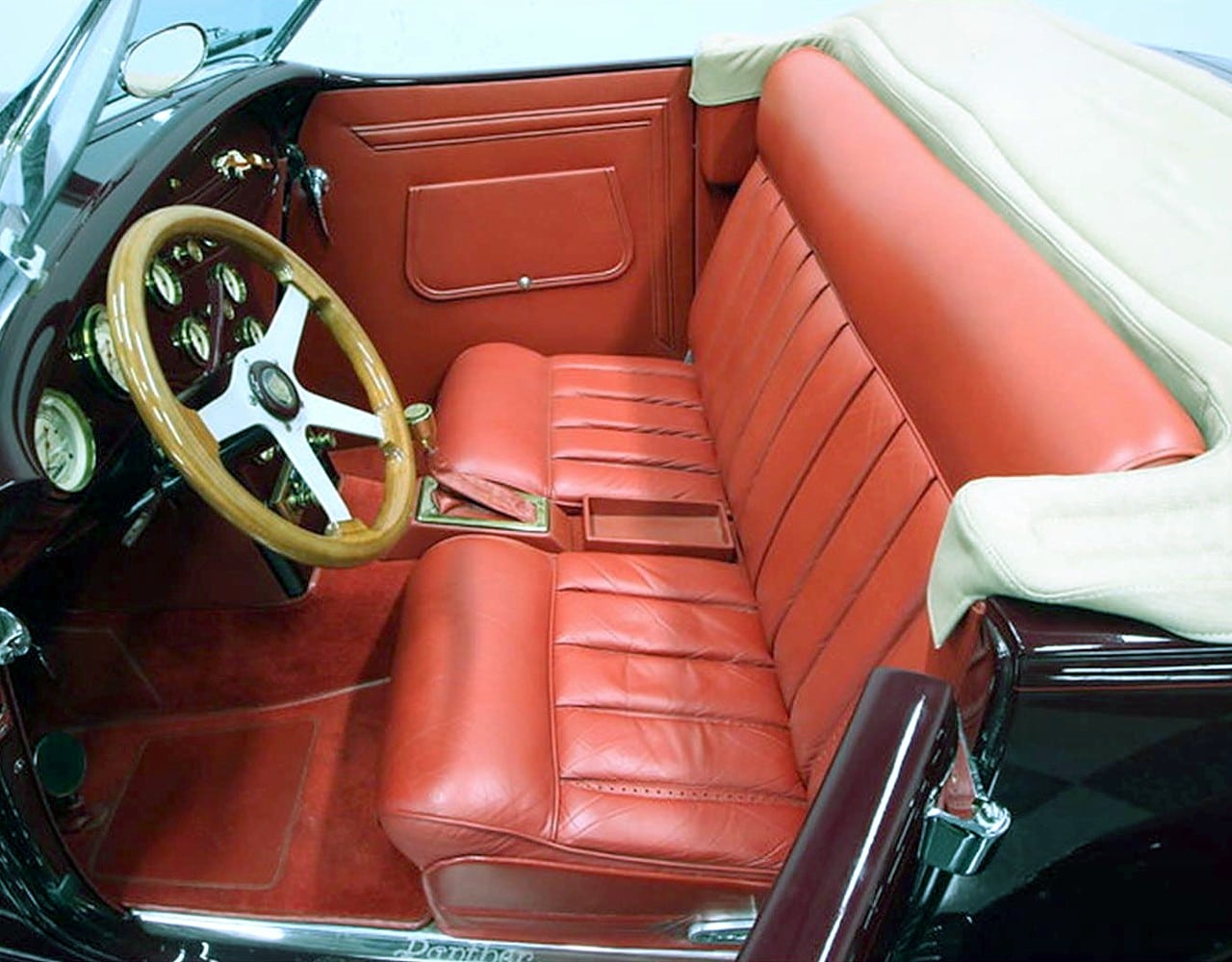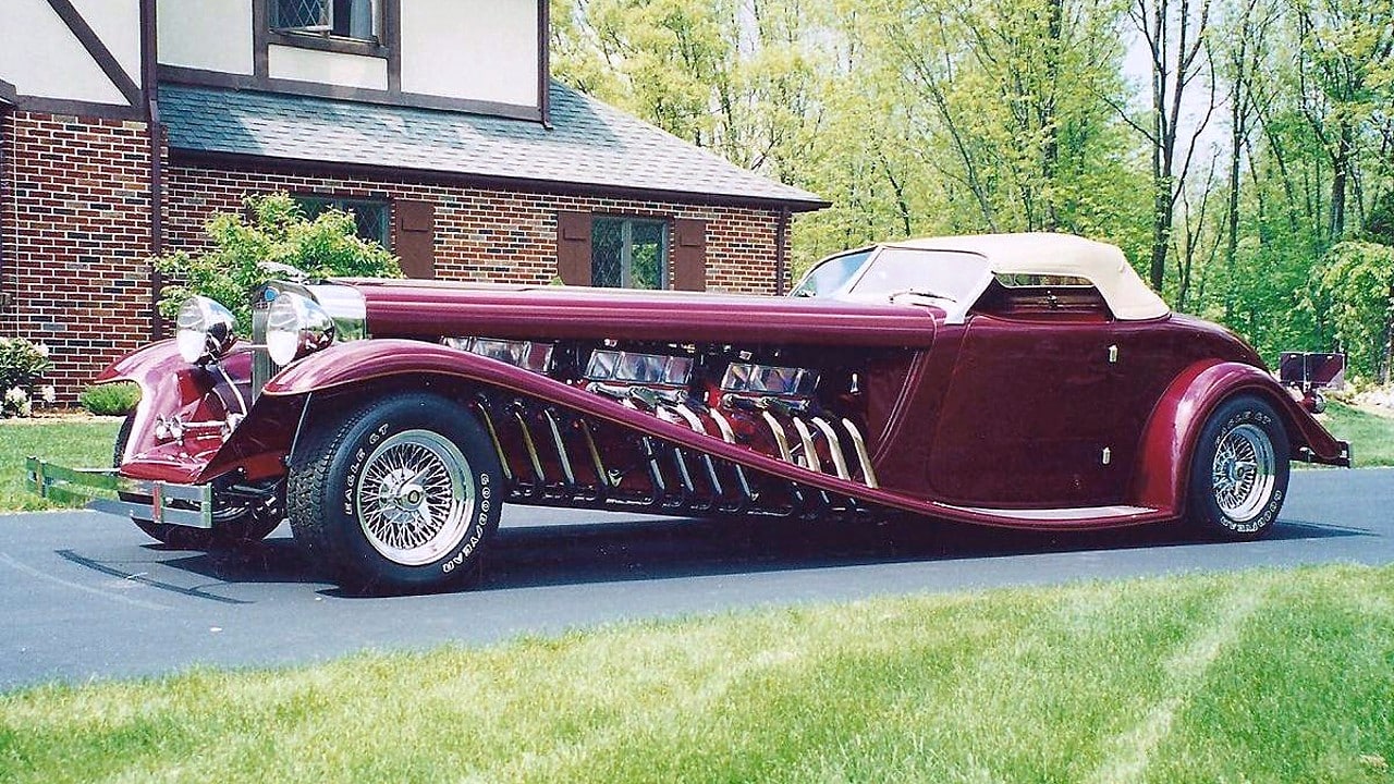 Il s’agit selon les documents d’immatriculation (le Title américain), d’une “1985 Custom Panther”…, en réalité ce n’est pas une Panther, même s’il y a un badge Panther sur la calandre…, c’est un pur kit plastique de Hot-Rod B’32 dont le capot a été allongé façon Clénet de façon à pouvoir y loger 3 moteurs…, l’engin a été manifestement conçu par un dingo qui aimait les dessins animés, car qui d’autre dans le monde serait capable de s’embarquer dans une telle construction ?