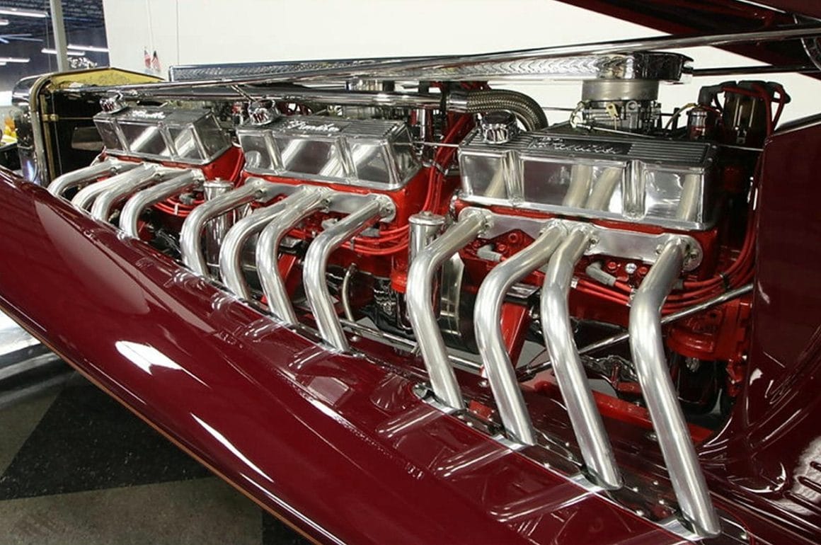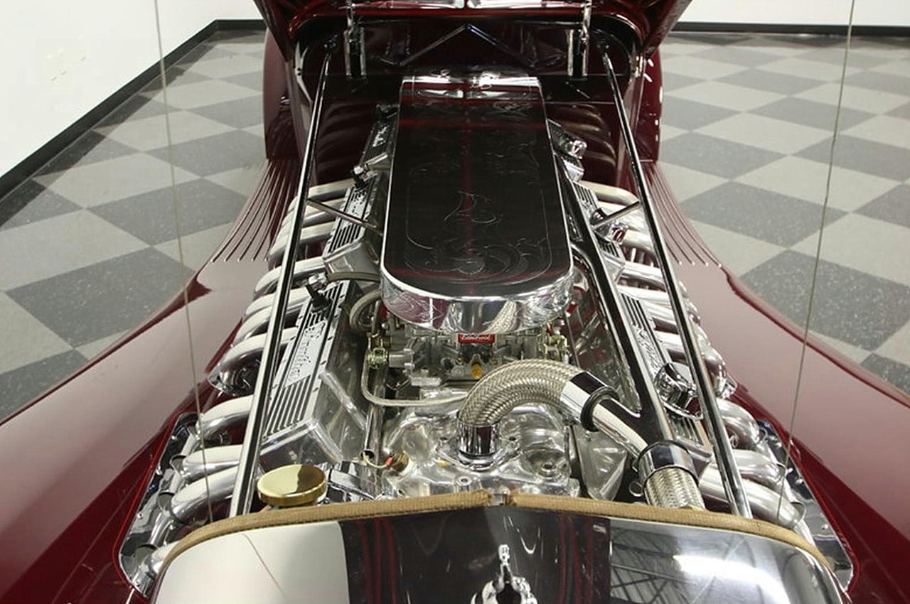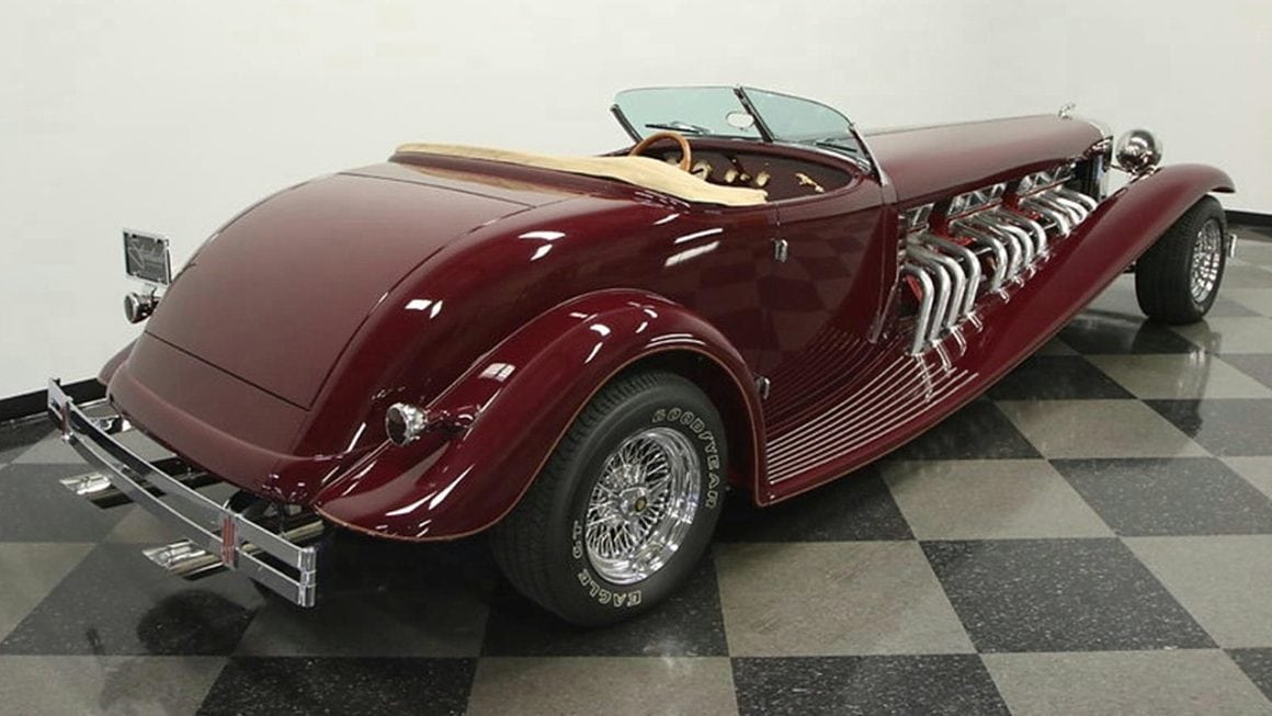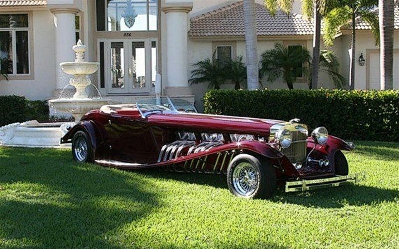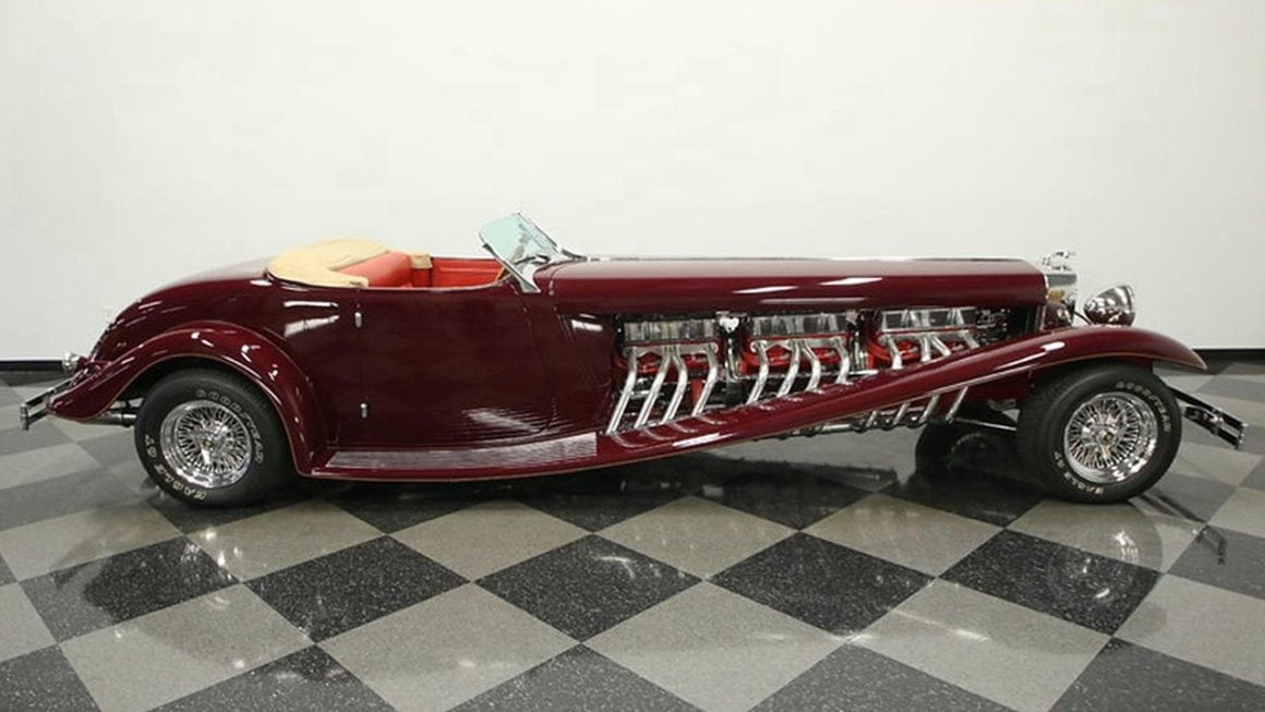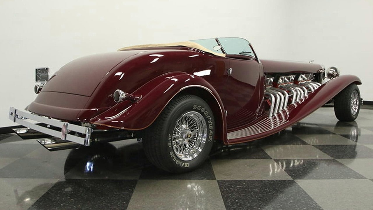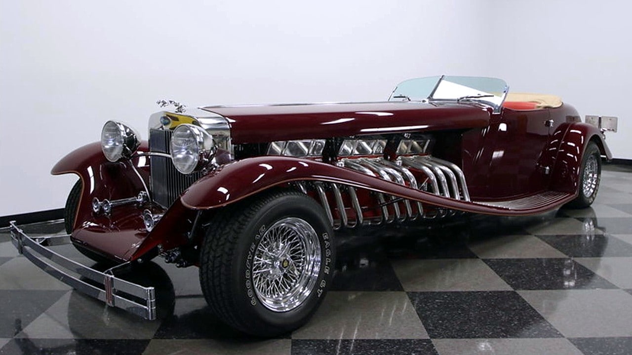 Il s’agit selon les documents d’immatriculation (le Title américain), d’une “1985 Custom Panther”…, en réalité ce n’est pas une Panther, même s’il y a un badge Panther sur la calandre…, c’est un pur kit plastique de Hot-Rod B’32 dont le capot a été allongé façon Clénet de façon à pouvoir y loger 3 moteurs…, l’engin a été manifestement conçu par un dingo qui aimait les dessins animés, car qui d’autre dans le monde serait capable de s’embarquer dans une telle construction ?