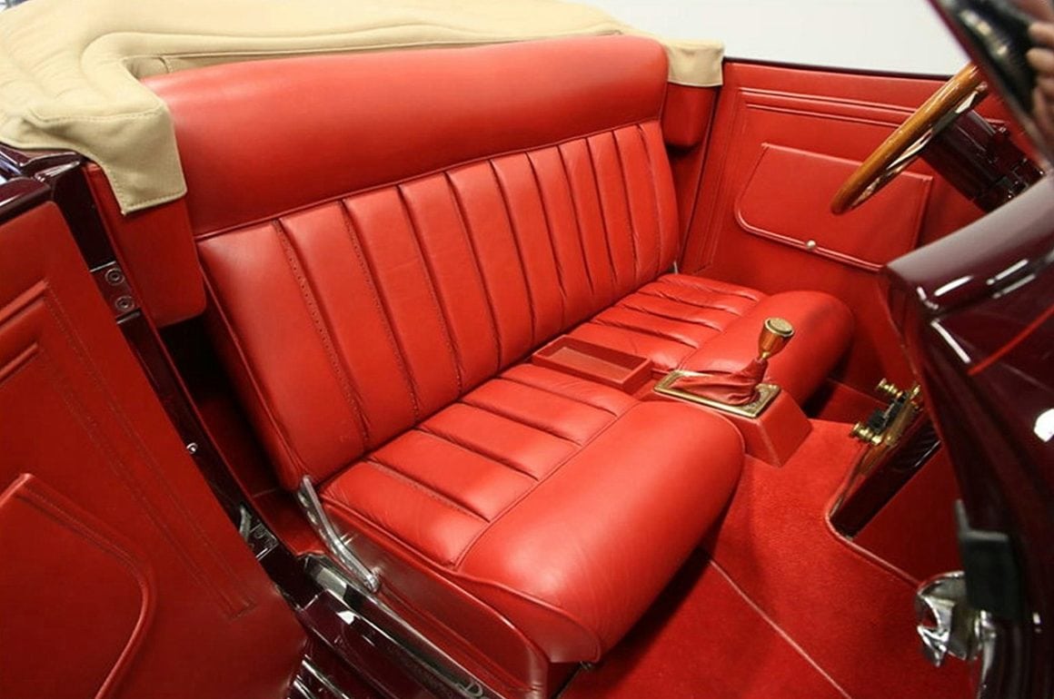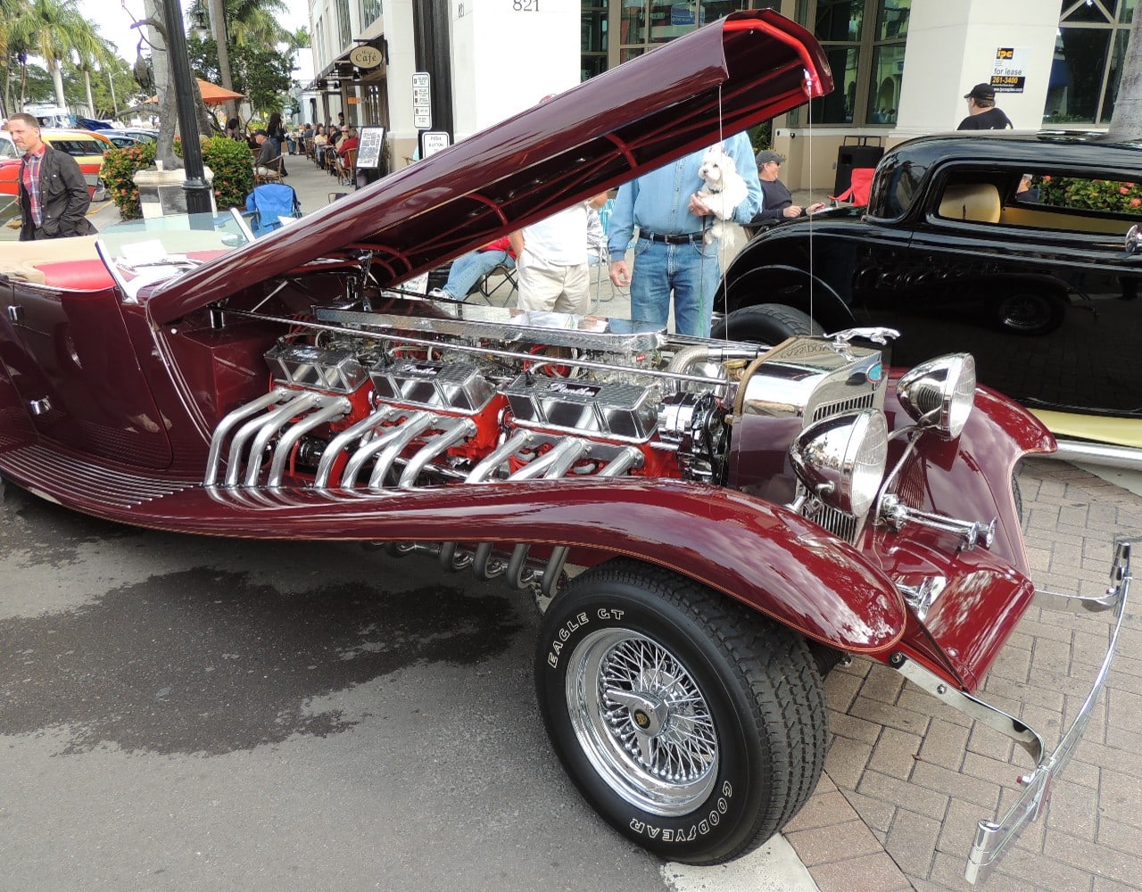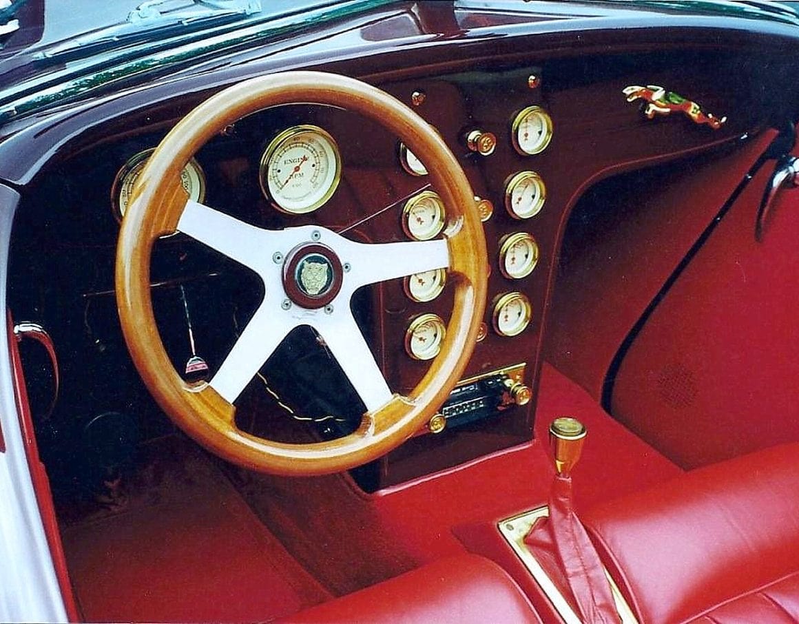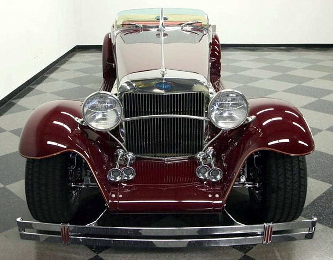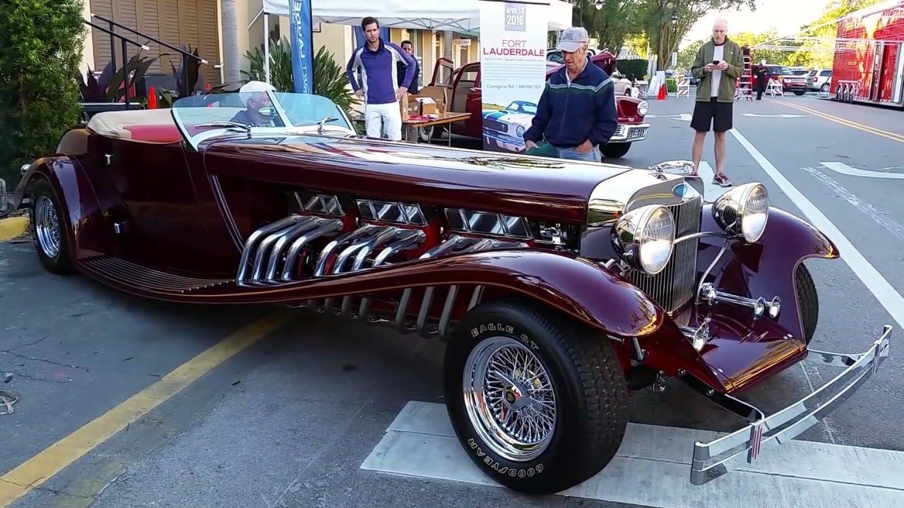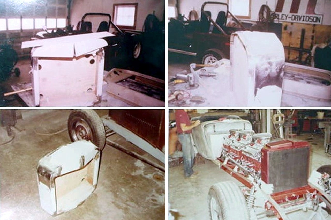 Il s’agit selon les documents d’immatriculation (le Title américain), d’une “1985 Custom Panther”…, en réalité ce n’est pas une Panther, même s’il y a un badge Panther sur la calandre…, c’est un pur kit plastique de Hot-Rod B’32 dont le capot a été allongé façon Clénet de façon à pouvoir y loger 3 moteurs…, l’engin a été manifestement conçu par un dingo qui aimait les dessins animés, car qui d’autre dans le monde serait capable de s’embarquer dans une telle construction ?