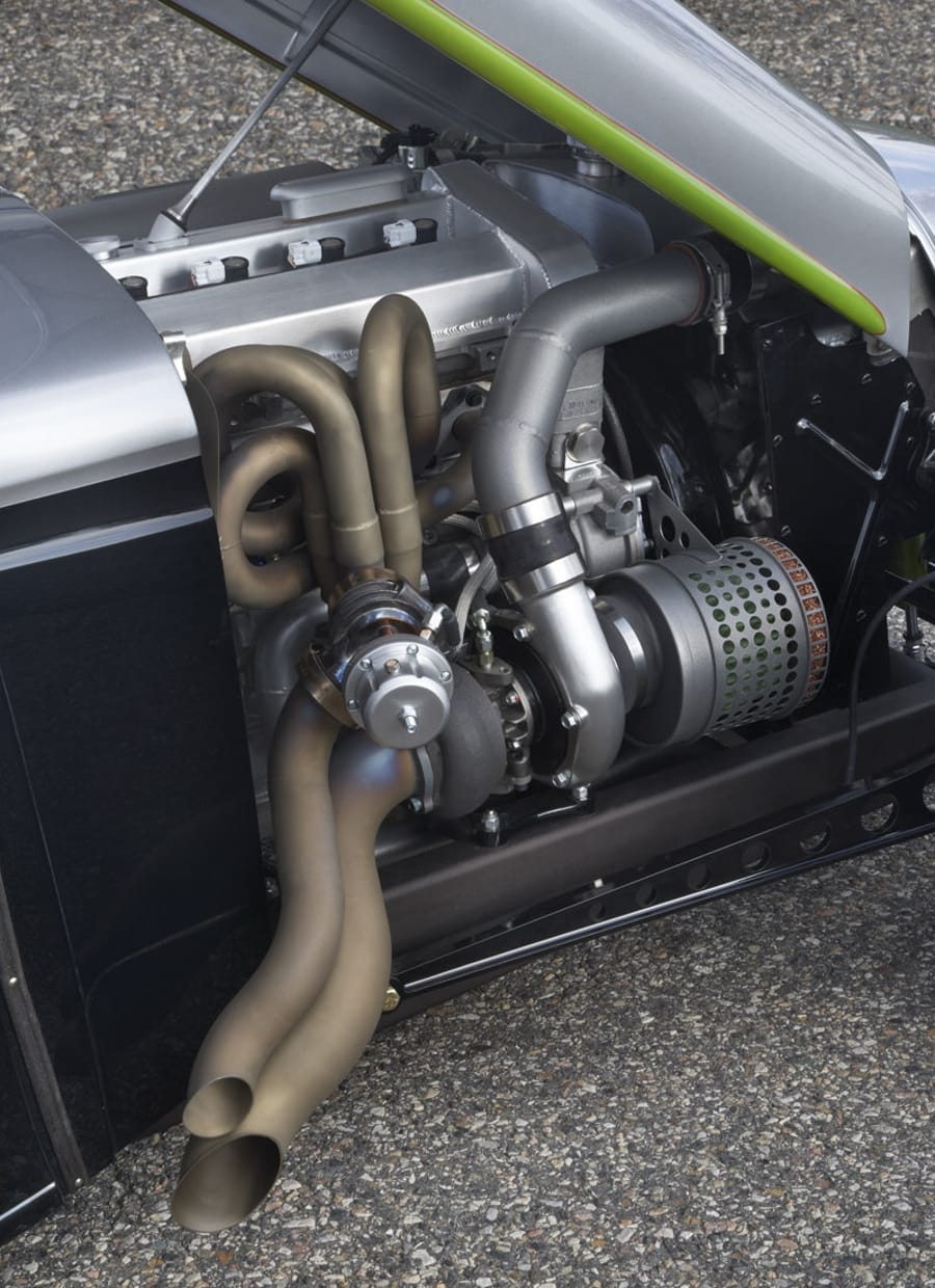 Inside, the FlexFuel Hot Rod maintains its racing-inspired minimalist theme, but with contemporary feel. Hand-formed sheet metal and earth-friendly materials were used to trim the cabin, as well as the racing-style aluminum seats. The dashboard was hand-finished, too, and filled with traditional-looking Stewart-Warner gauges.