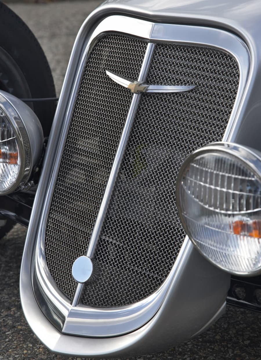 Like any good rod worth its salt, there are no fenders or running boards; the 10-inch headlamps are mounted to the core support. The front suspension is all custom-built, complete with period-perfect lightening holes drilled in it.