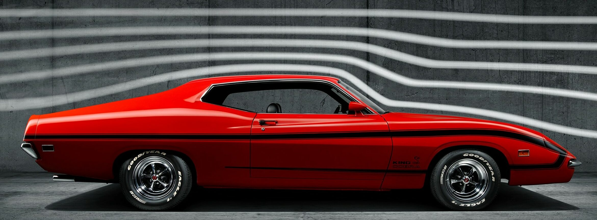 En fait, Ford avait initialement configuré 3 Torino’s en “King-Cobra’s” avec la contribution de Kar-Kraft et Holman-Moody pour défier la Dodge Charger Daytona et la Plymouth Superbird en NASCAR. Le cahier des charges transmis à une équipe dirigée par Larry Shinoda était assez simple : “Aller à 200 mph et battre Mopar à plate-couture”… Shinoda a répondu en embauchant Harvey Winn qui avait conçu la carrosserie des Dodge charger’s de 1968 à 1970 et en rassemblant Jacques Passino, Ed Hall (de Kar-Kraft) et les designers Bill Shannon et Dick Petit. Ils ont utilisé des Ford jumelles Torino/Cyclone dans leur nouvelle version destinée à l’année 1970 et toute l’équipe a passé trois mois pour en améliorer/modifier l’aérodynamique.