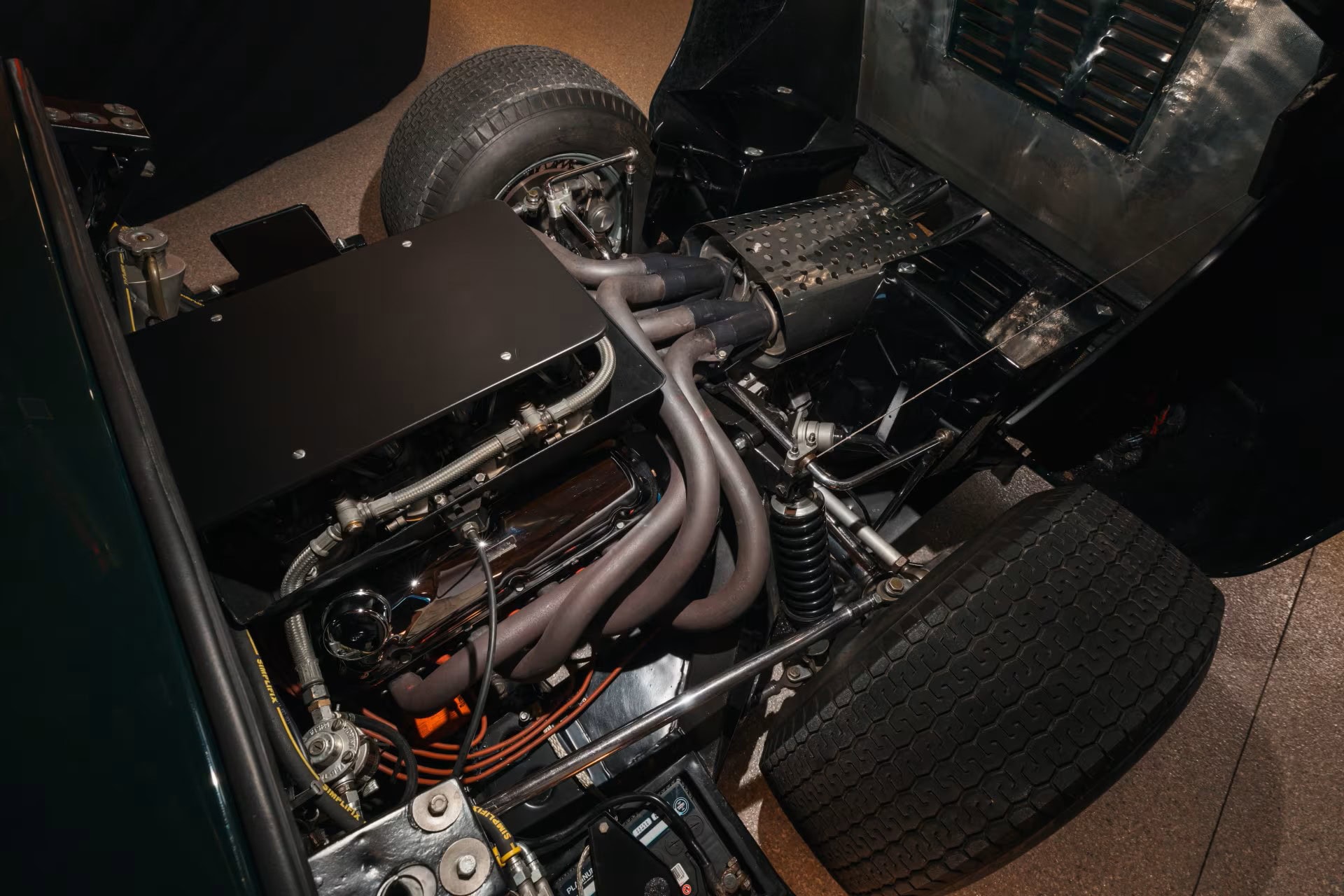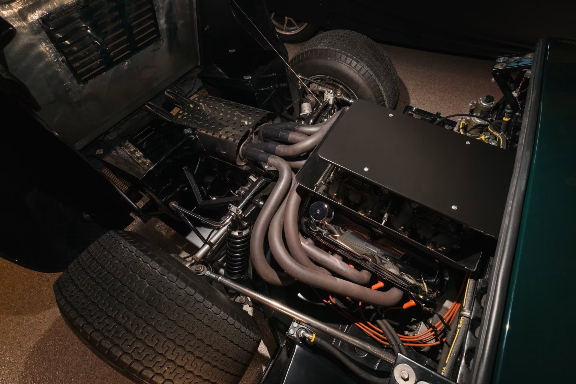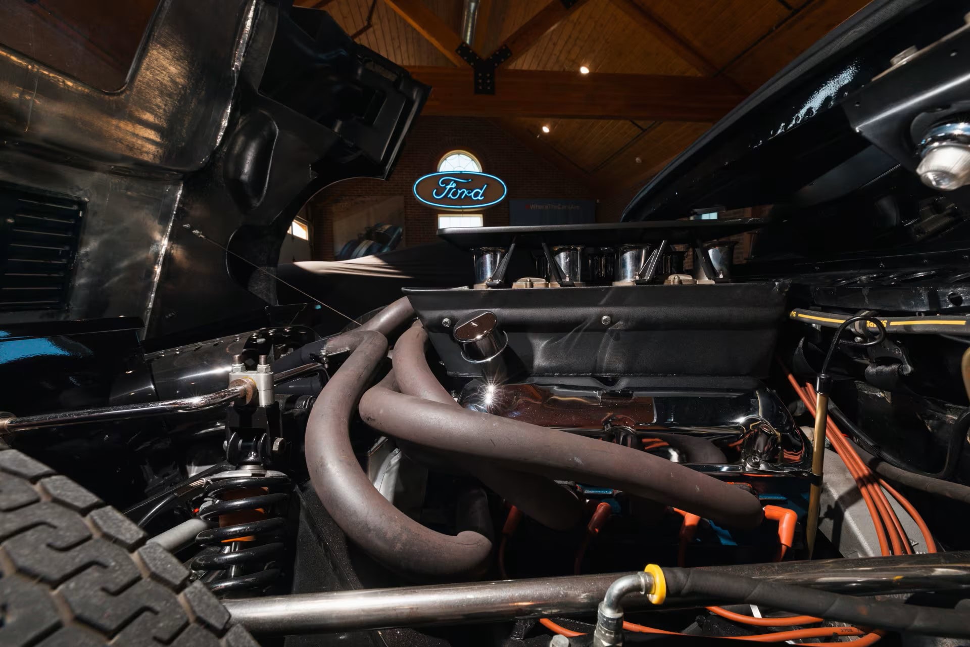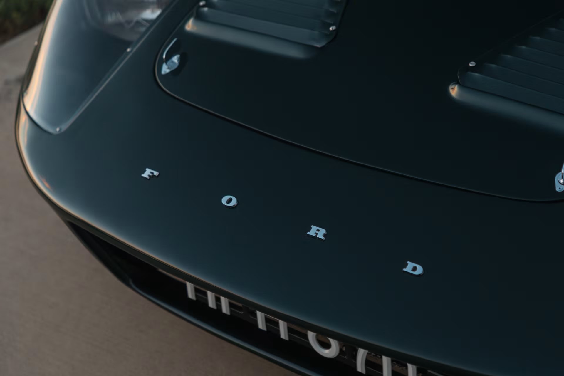 Bien que cela ne figure pas sur la fiche de construction, la voiture comportait des grilles à persiennes au-dessus des sorties de radiateur et au-dessus des prises latérales de la carrosserie ainsi qu’un placement unique du lettrage “FORD” sur le nez. Sa couleur vert sapin brillant reflétait son attrait intemporel et ses courbes aérodynamiques. Un poème roulant/ roulable pour qui n’avait que faire de l’inconfort, des crampes et de la gymnatique d’entrées/sorties…
