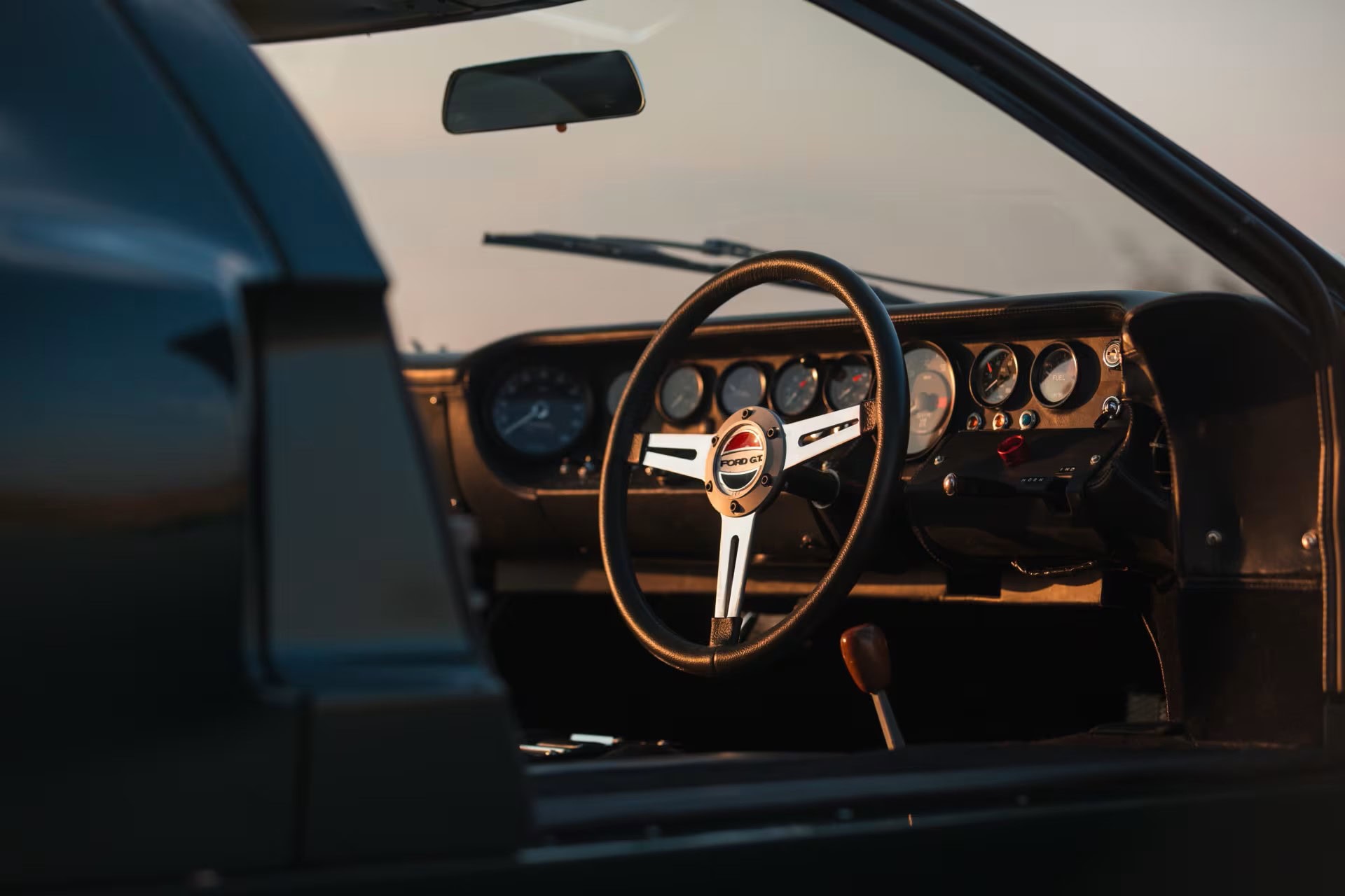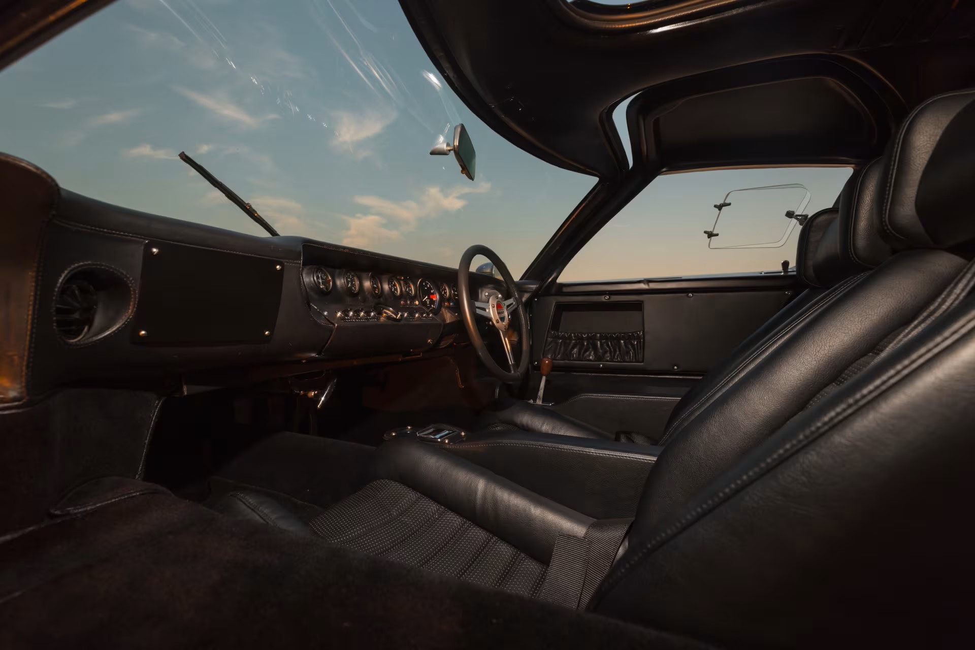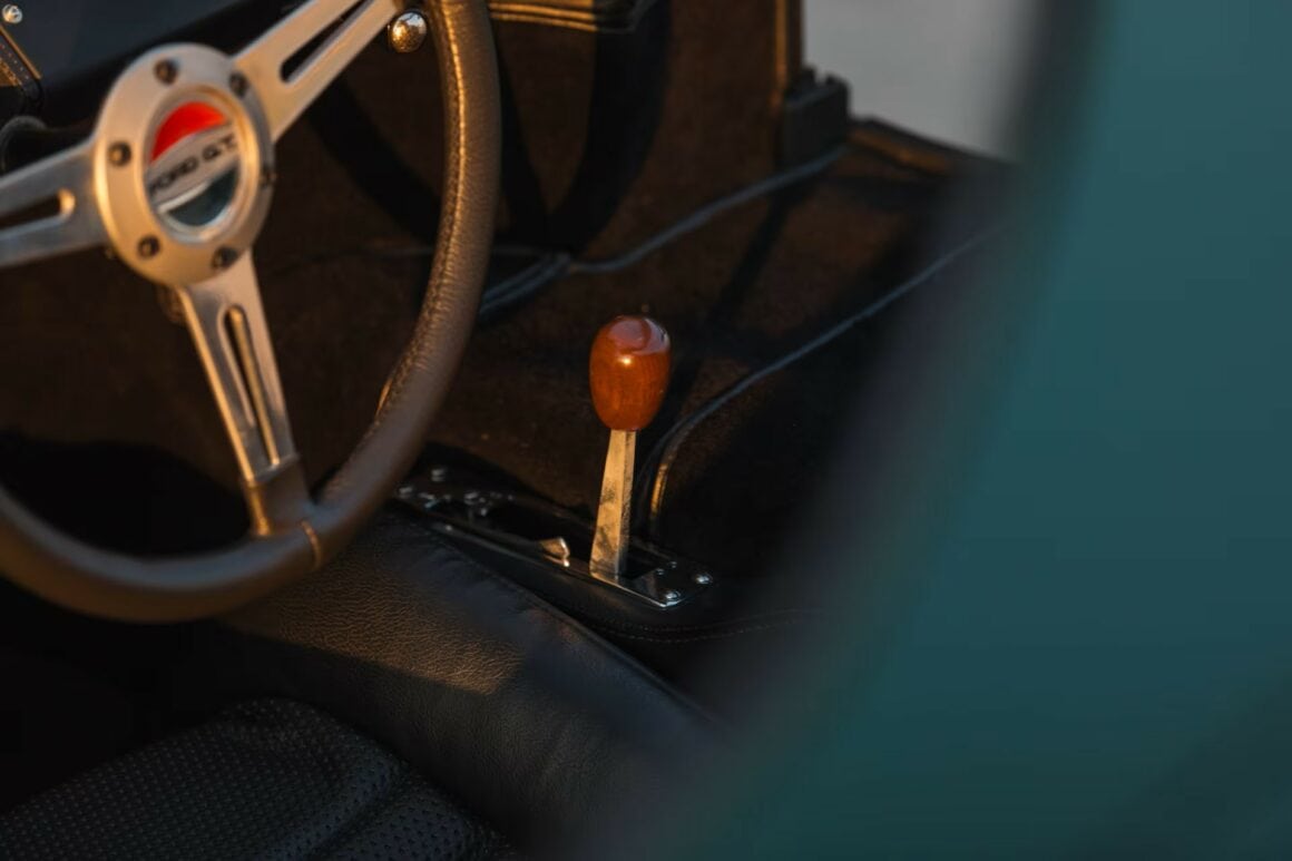 Elle était équipée d’un chauffage et d’un pare-brise chauffant, de feux de recul, d’une horloge, de rétroviseurs d’ailes, de deux compteurs de carburant et de silencieux de “voiture de route”. Ses garnitures “de luxe” comprenaient une moquette complète, des sièges en cuir non perforé et des pochettes de porte en cuir. Comme la plupart des GT40 de route, elle incorporait également des jantes à rayons chromées Borrani.