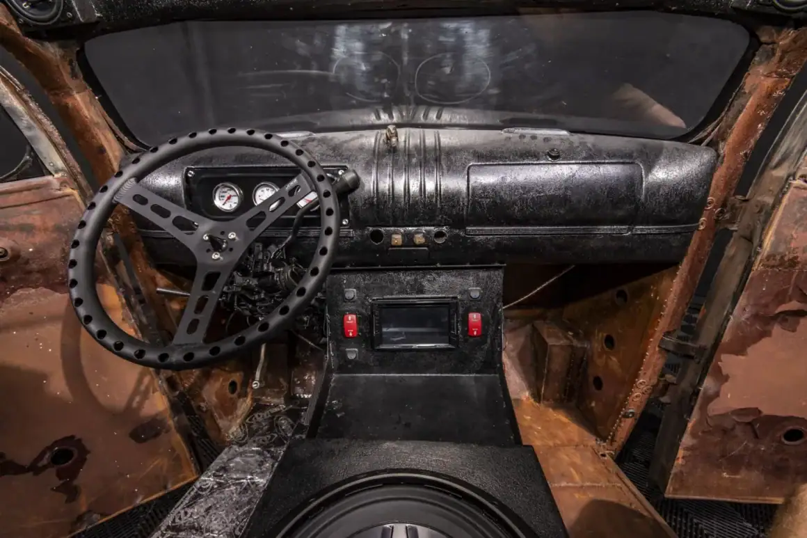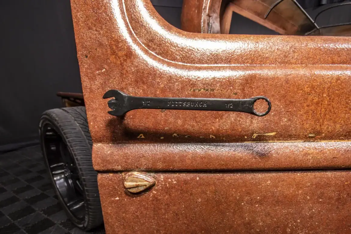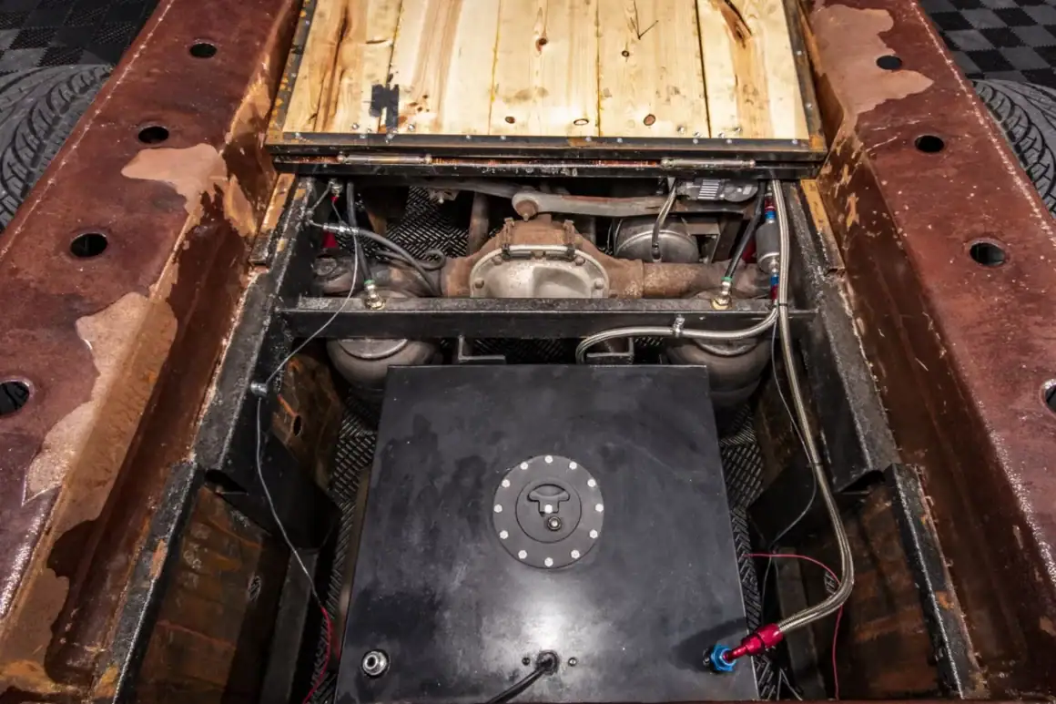 Ce sont des 305/35 AR et 275/25 AV. La calandre a été artistiquement personnalisée, les flancs et les panneaux de support de benne étant percés de trous ronds estampés, tandis que le toit est orné d’une structure métallique soudée sur mesure. Un pare-brise amovible en plexiglas a été installé. Parmi les autres détails personnalisés, on note des clés à molette intégrées servant de poignées de porte et un plancher de benne en bois semi-pourri avec trappes d’accès.