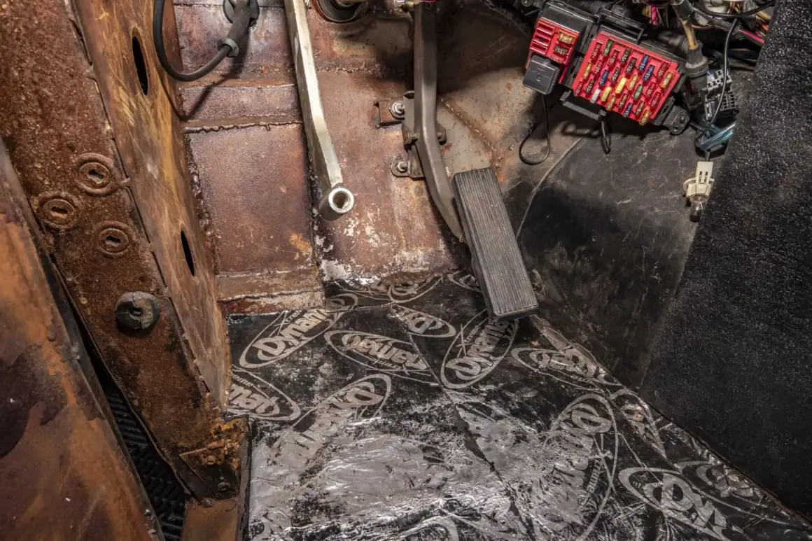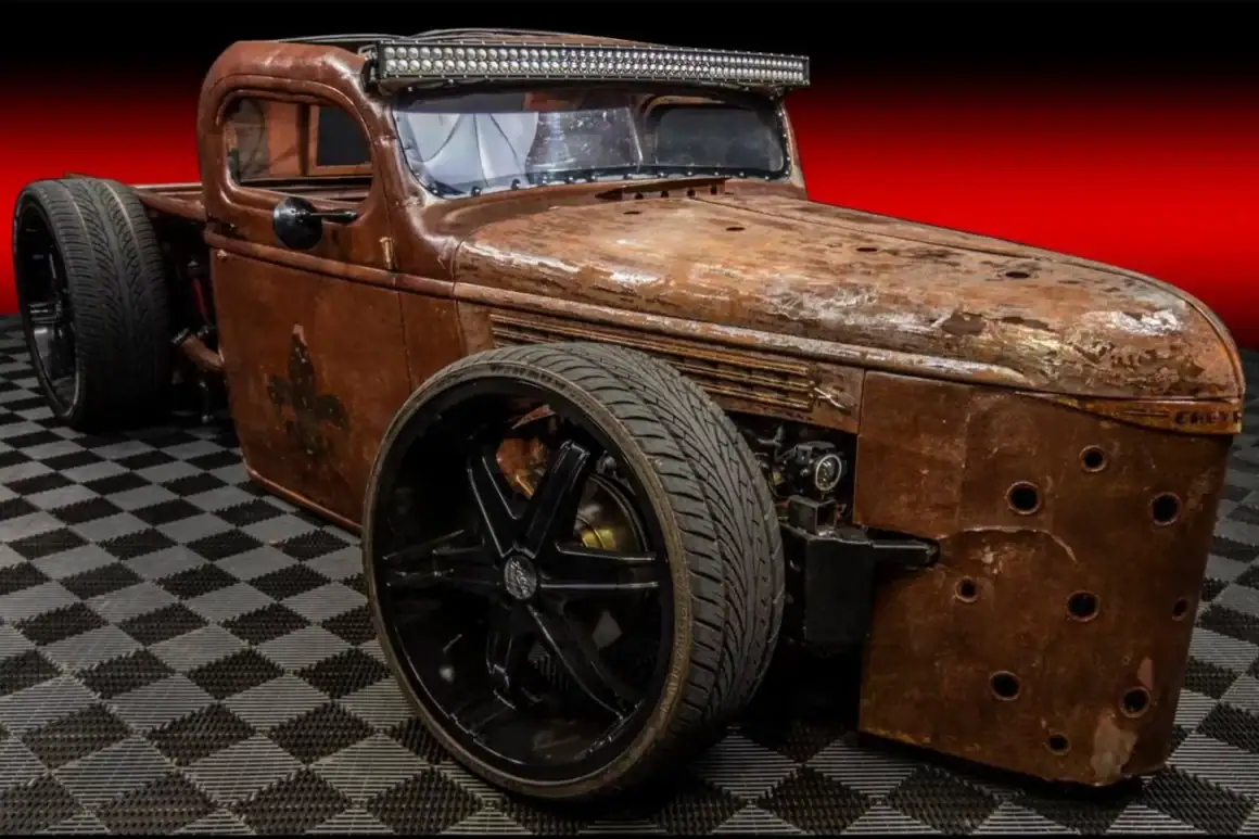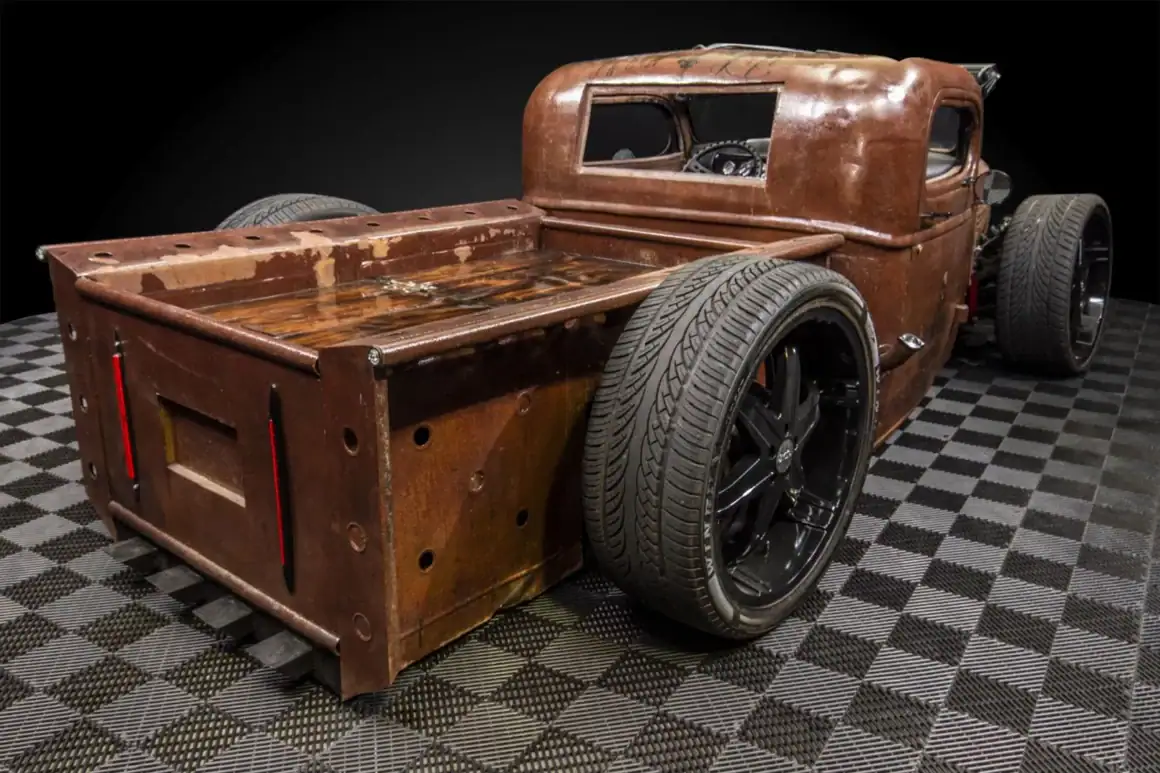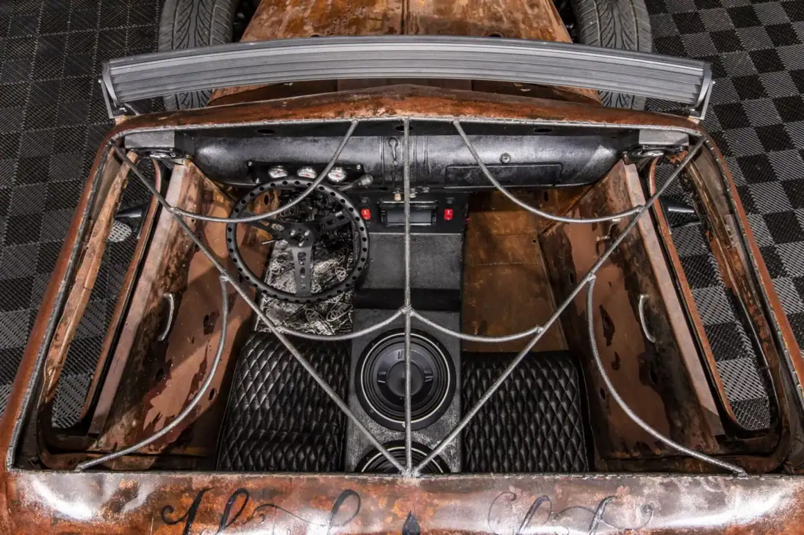 Ce sont des 305/35 AR et 275/25 AV. La calandre a été artistiquement personnalisée, les flancs et les panneaux de support de benne étant percés de trous ronds estampés, tandis que le toit est orné d’une structure métallique soudée sur mesure. Un pare-brise amovible en plexiglas a été installé. Parmi les autres détails personnalisés, on note des clés à molette intégrées servant de poignées de porte et un plancher de benne en bois semi-pourri avec trappes d’accès.