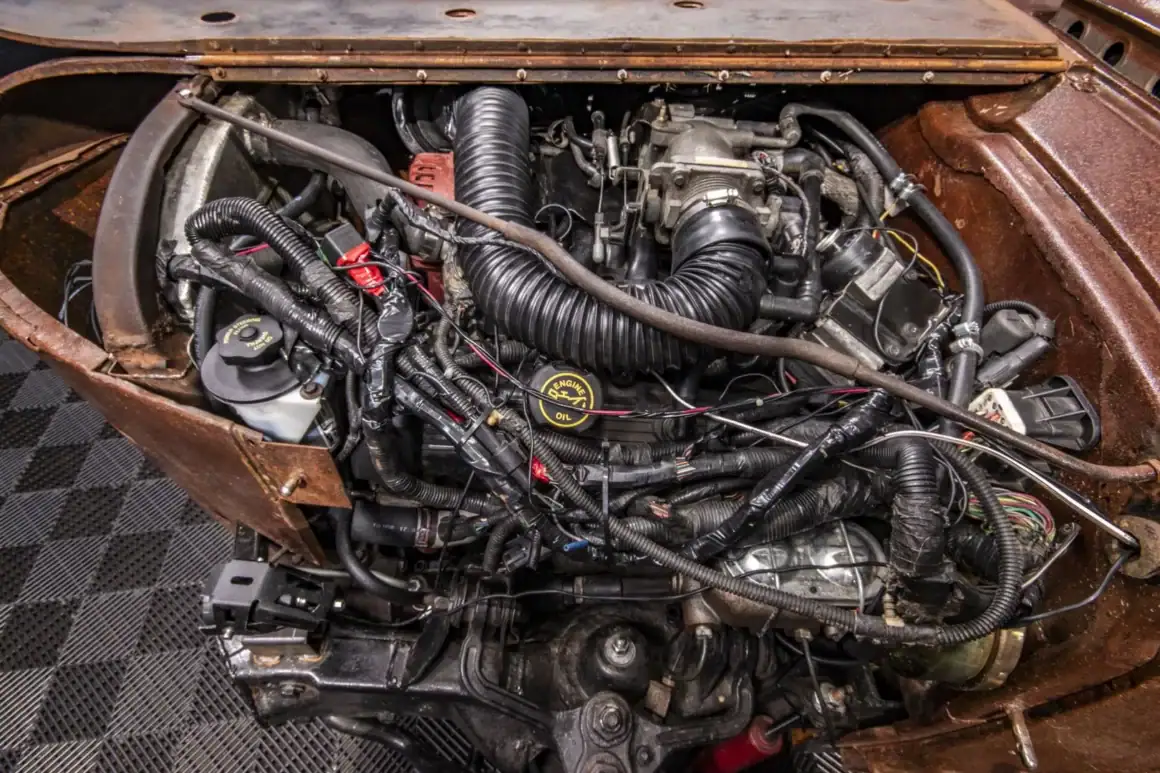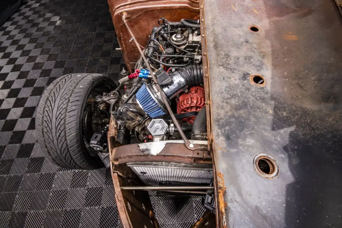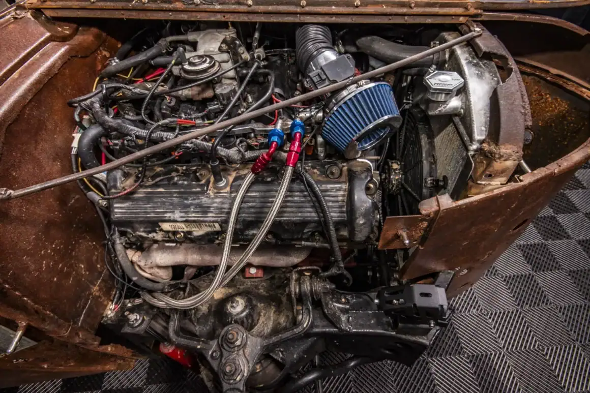 L’équipement comprend un radiateur en aluminium, un ventilateur de refroidissement électrique, un refroidisseur de transmission externe et un réservoir de carburant arrière avec des conduites d’alimentation et de retour en acier inoxydable tressé. Le système d’échappement double sur mesure est équipé de silencieux Magnaflow, et le train arrière proviendrait d’une Lincoln Town Car de 2000. Voilà… C’est fini…