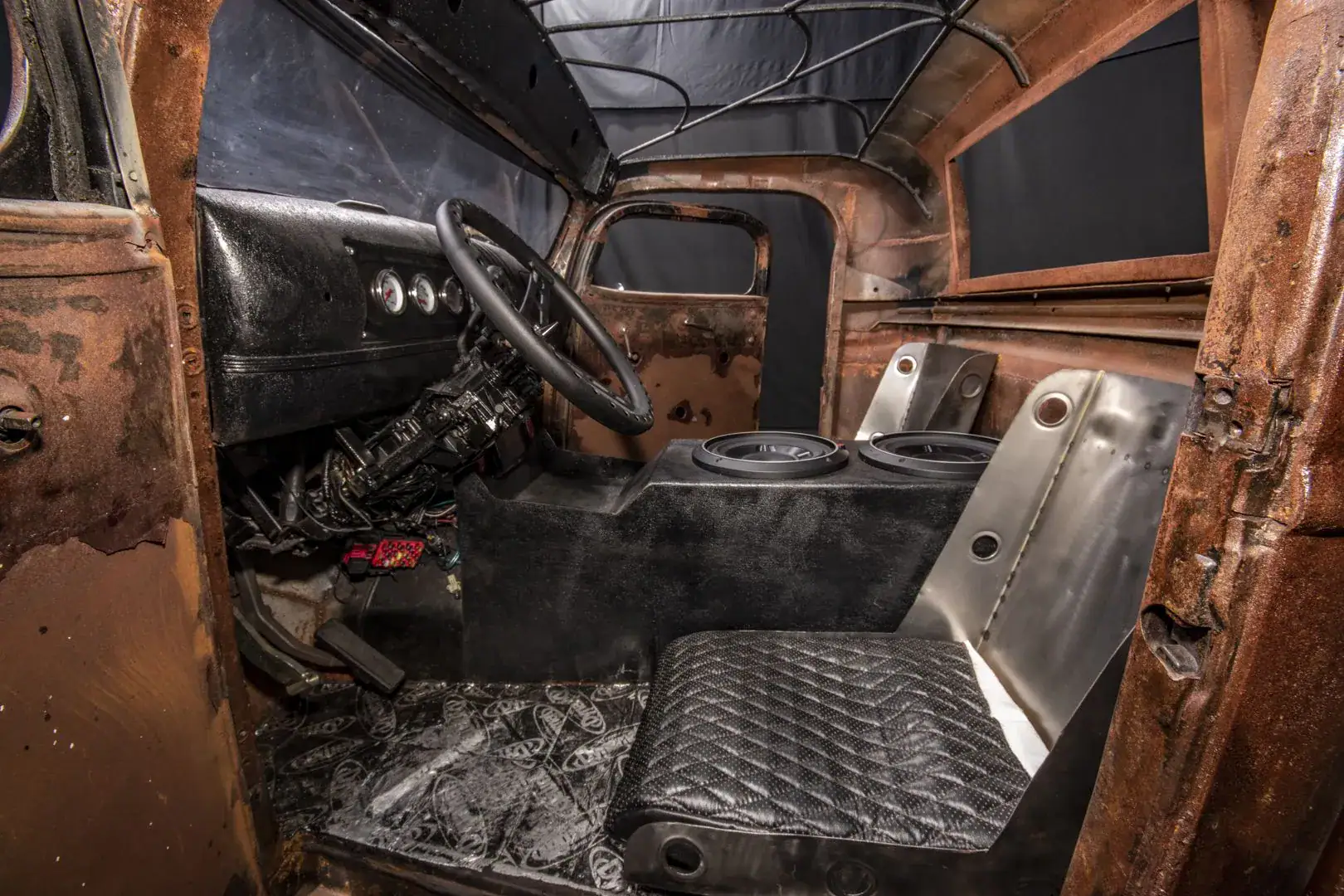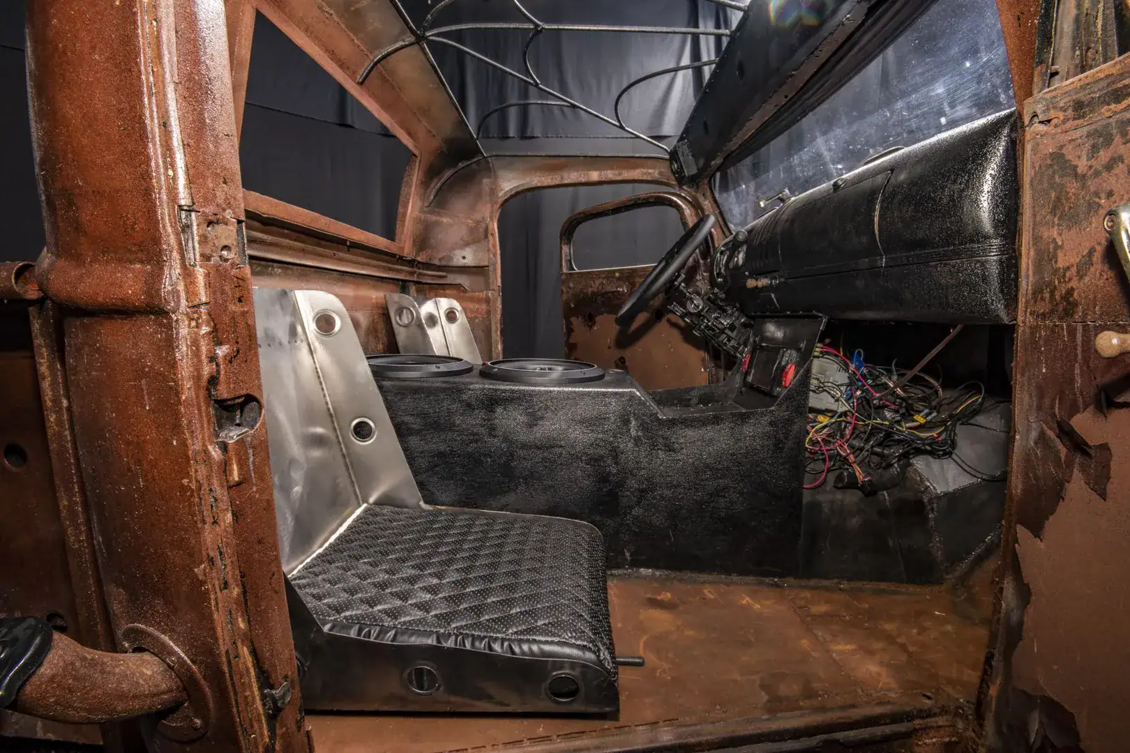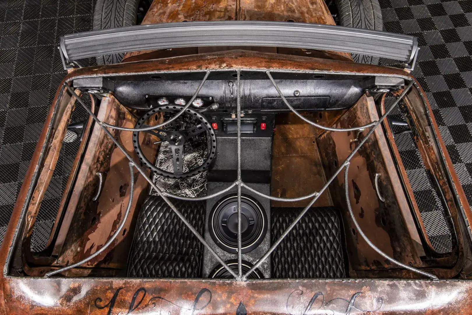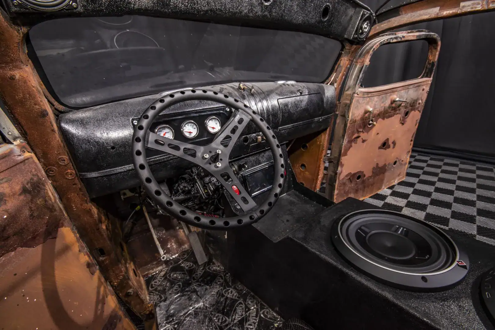 Ce sont des 305/35 AR et 275/25 AV. La calandre a été artistiquement personnalisée, les flancs et les panneaux de support de benne étant percés de trous ronds estampés, tandis que le toit est orné d’une structure métallique soudée sur mesure. Un pare-brise amovible en plexiglas a été installé. Parmi les autres détails personnalisés, on note des clés à molette intégrées servant de poignées de porte et un plancher de benne en bois semi-pourri avec trappes d’accès.