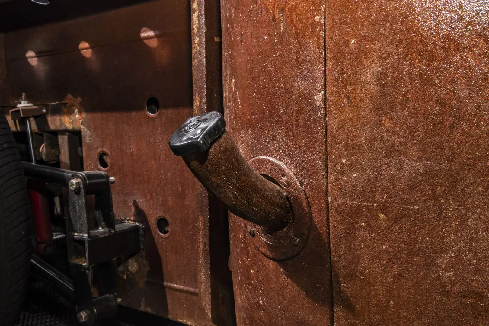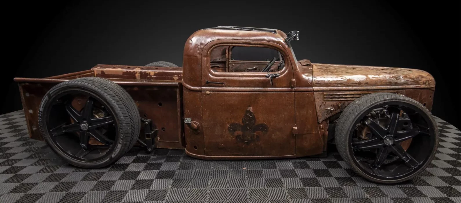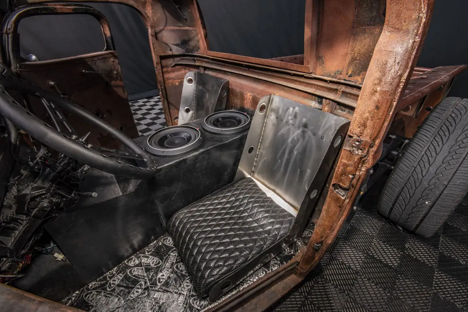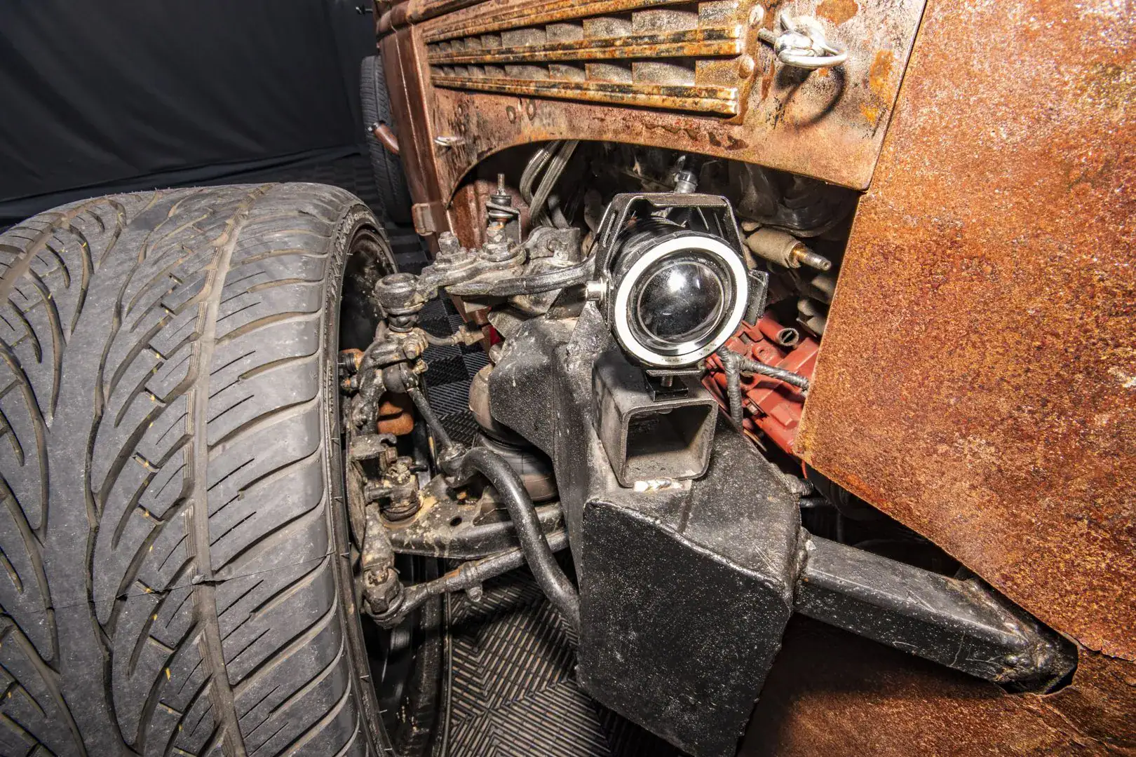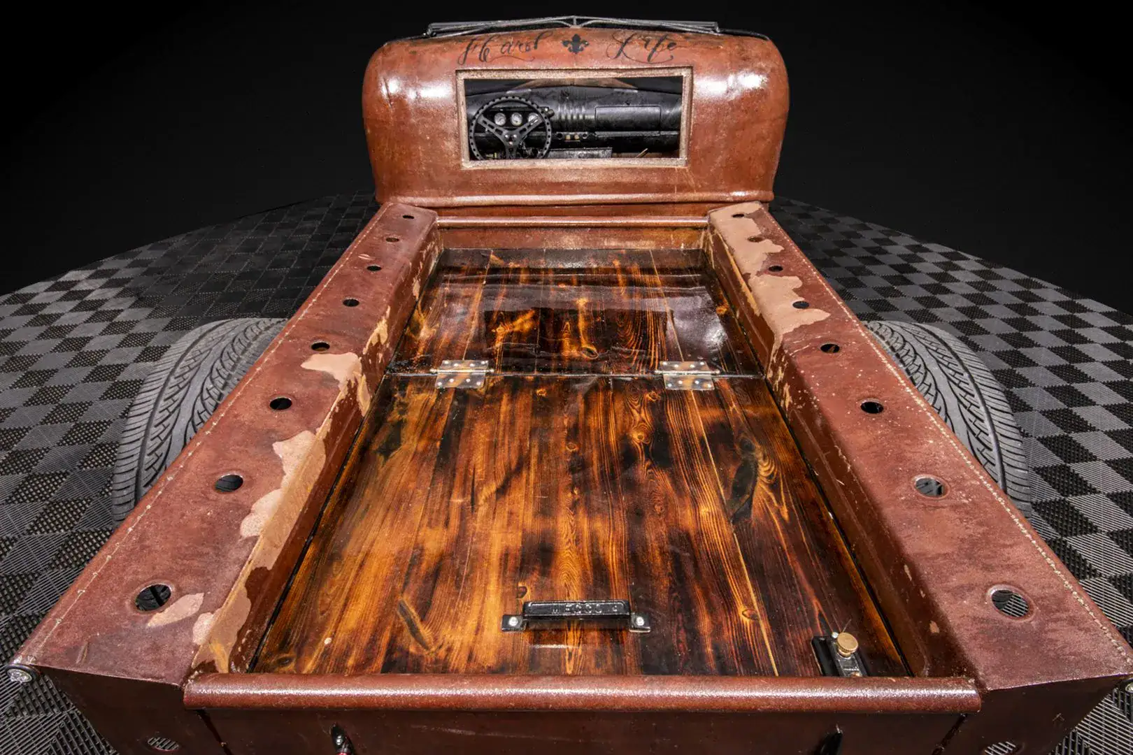 Ce sont des 305/35 AR et 275/25 AV. La calandre a été artistiquement personnalisée, les flancs et les panneaux de support de benne étant percés de trous ronds estampés, tandis que le toit est orné d’une structure métallique soudée sur mesure. Un pare-brise amovible en plexiglas a été installé. Parmi les autres détails personnalisés, on note des clés à molette intégrées servant de poignées de porte et un plancher de benne en bois semi-pourri avec trappes d’accès.