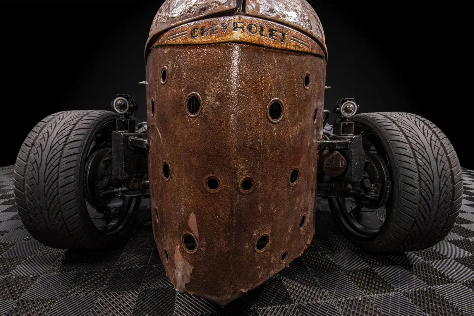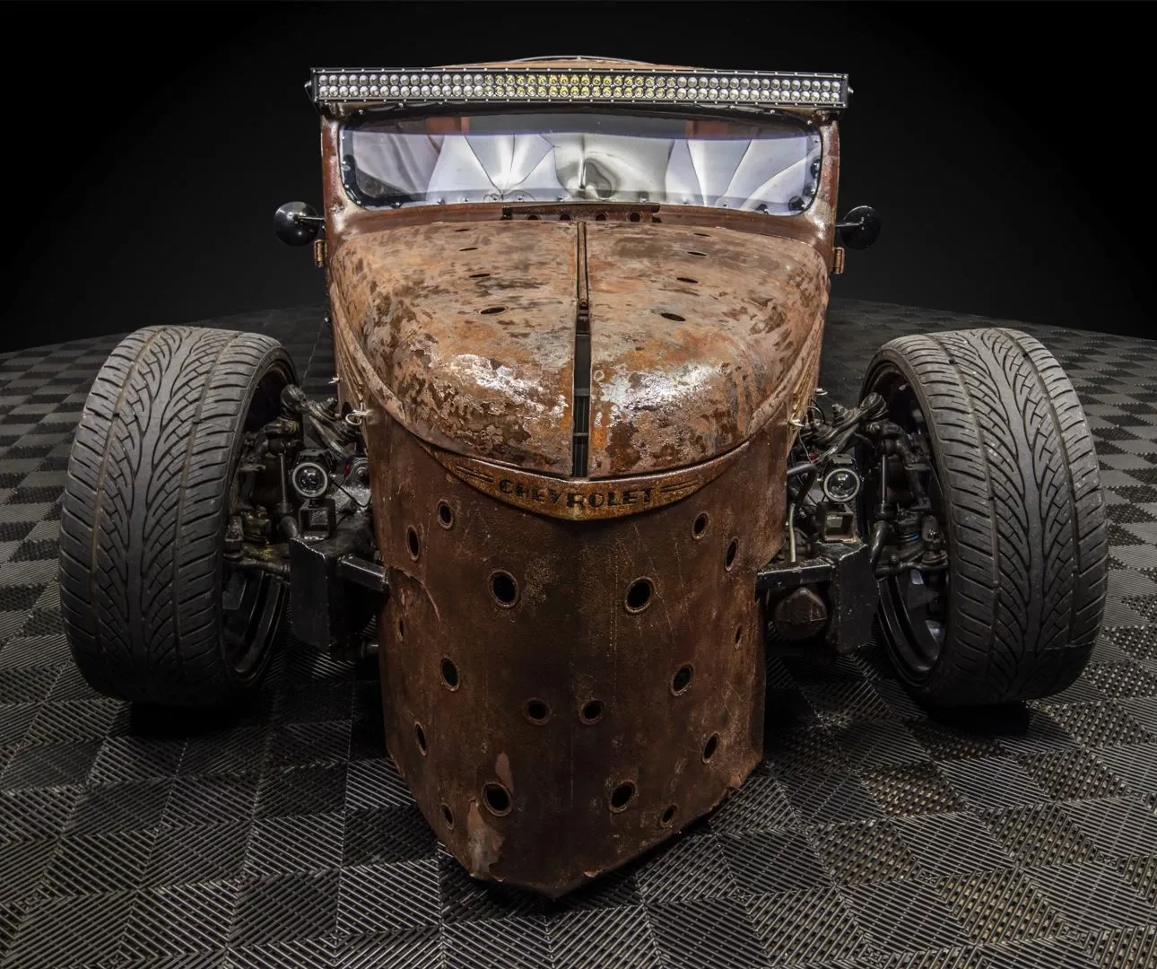 Hélios fit une promesse similaire à Phaéton et lui permit de conduire le char du Soleil. Phaéton embrasa le Ciel et la Terre, Zeus le foudroya… Les Aloades, ayant brisé un serment fait sur le Styx, reçurent un châtiment exemplaire, celui de rester attachés dos à dos à tout jamais, dans le vent et les ténèbres… Toute analogie avec la guerre en Ukraine est un hasard arbitraire. J’en reviens avant qu’il ne soit trop tard à ce Rat Rod supposé créé par Franck Einstein…