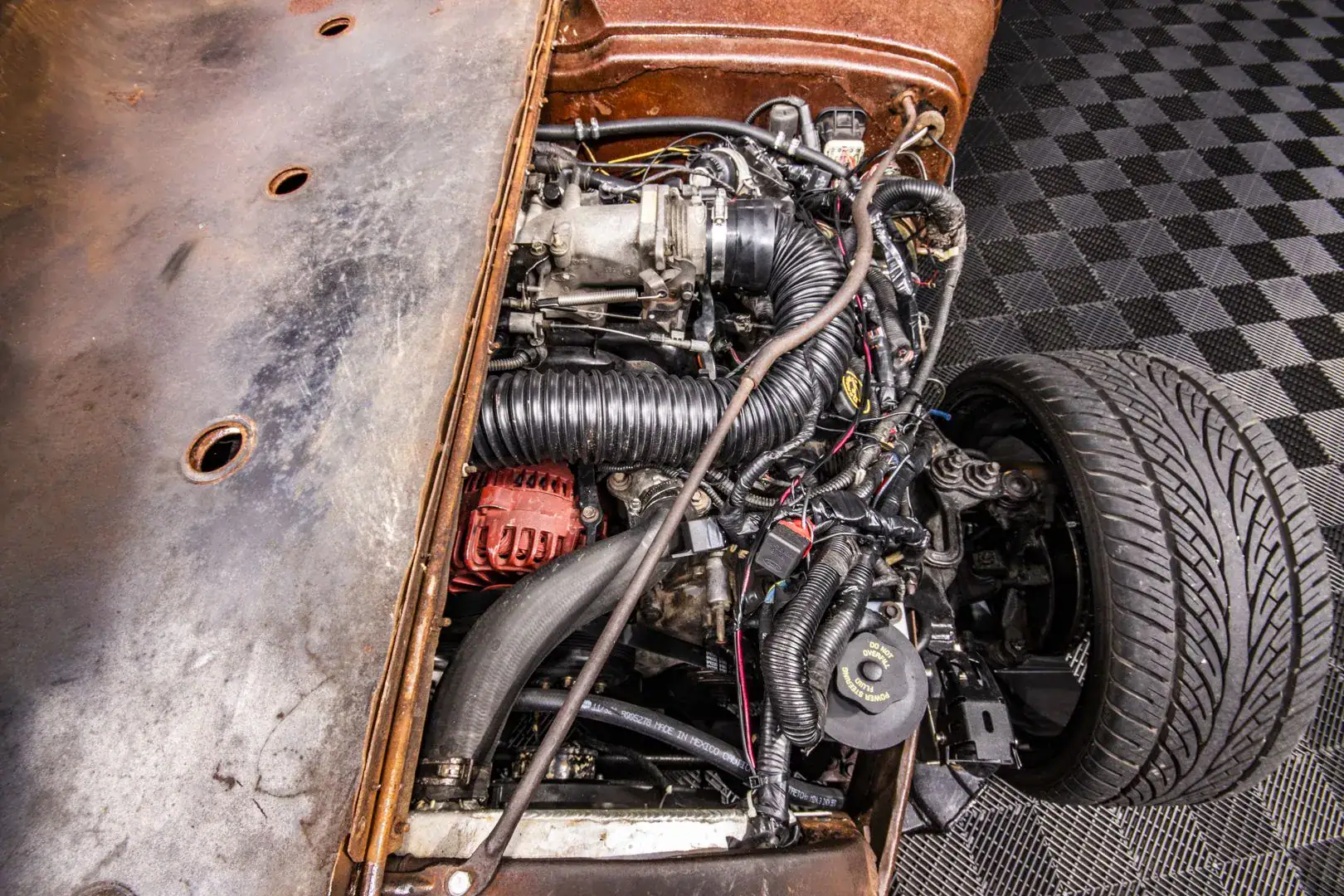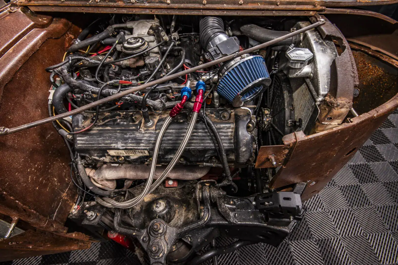 L’équipement comprend un radiateur en aluminium, un ventilateur de refroidissement électrique, un refroidisseur de transmission externe et un réservoir de carburant arrière avec des conduites d’alimentation et de retour en acier inoxydable tressé. Le système d’échappement double sur mesure est équipé de silencieux Magnaflow, et le train arrière proviendrait d’une Lincoln Town Car de 2000. Voilà… C’est fini…