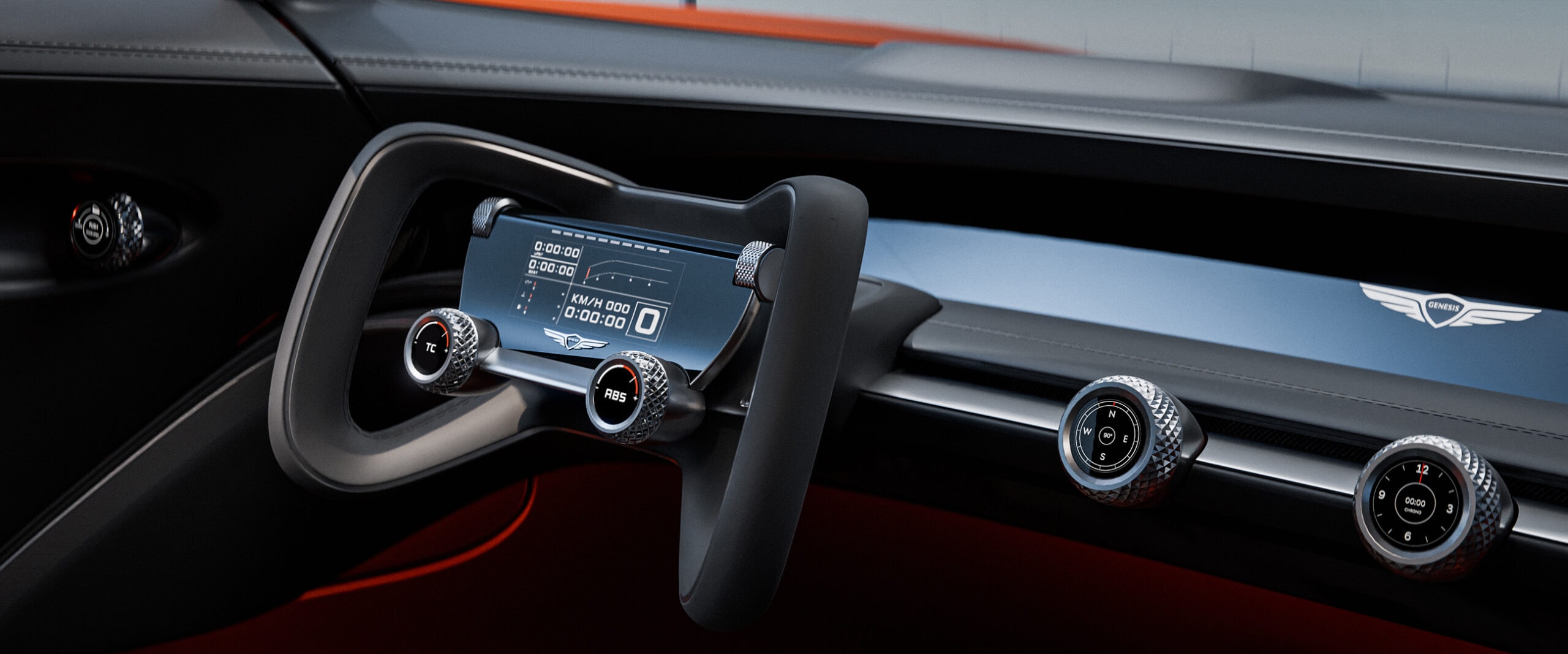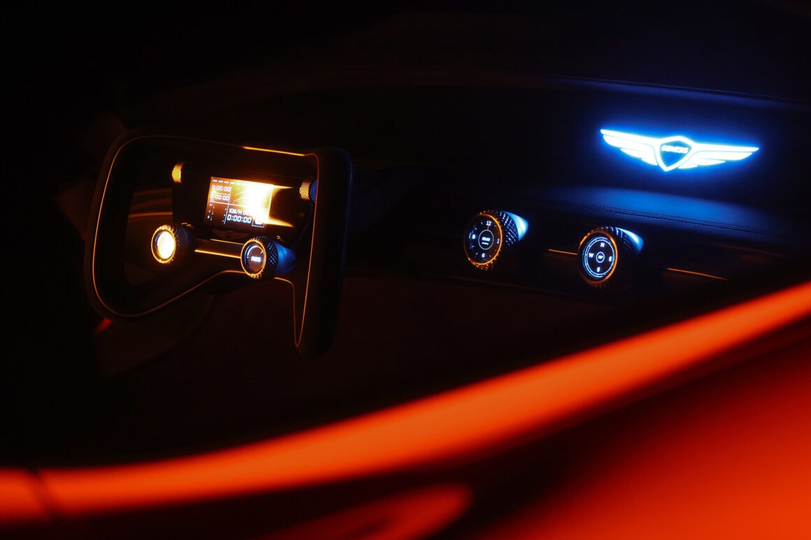 On le retrouve sur d’autres modèles. À l’arrière et sur les côtés, on retrouve respectivement un béquet et des bords fuyants qui confèrent de la stabilité aérodynamique à grande vitesse. L’intérieur découle de l’esprit “Beauty of White Space” de Genesis avec un environnement épuré autour du pilote. Les fonctions essentielles ont la priorité pour mettre l’accent sur les performances sur piste. L’interface numérique panoramique sert de centre d’informations connecté au système de contrôle numérique surround.