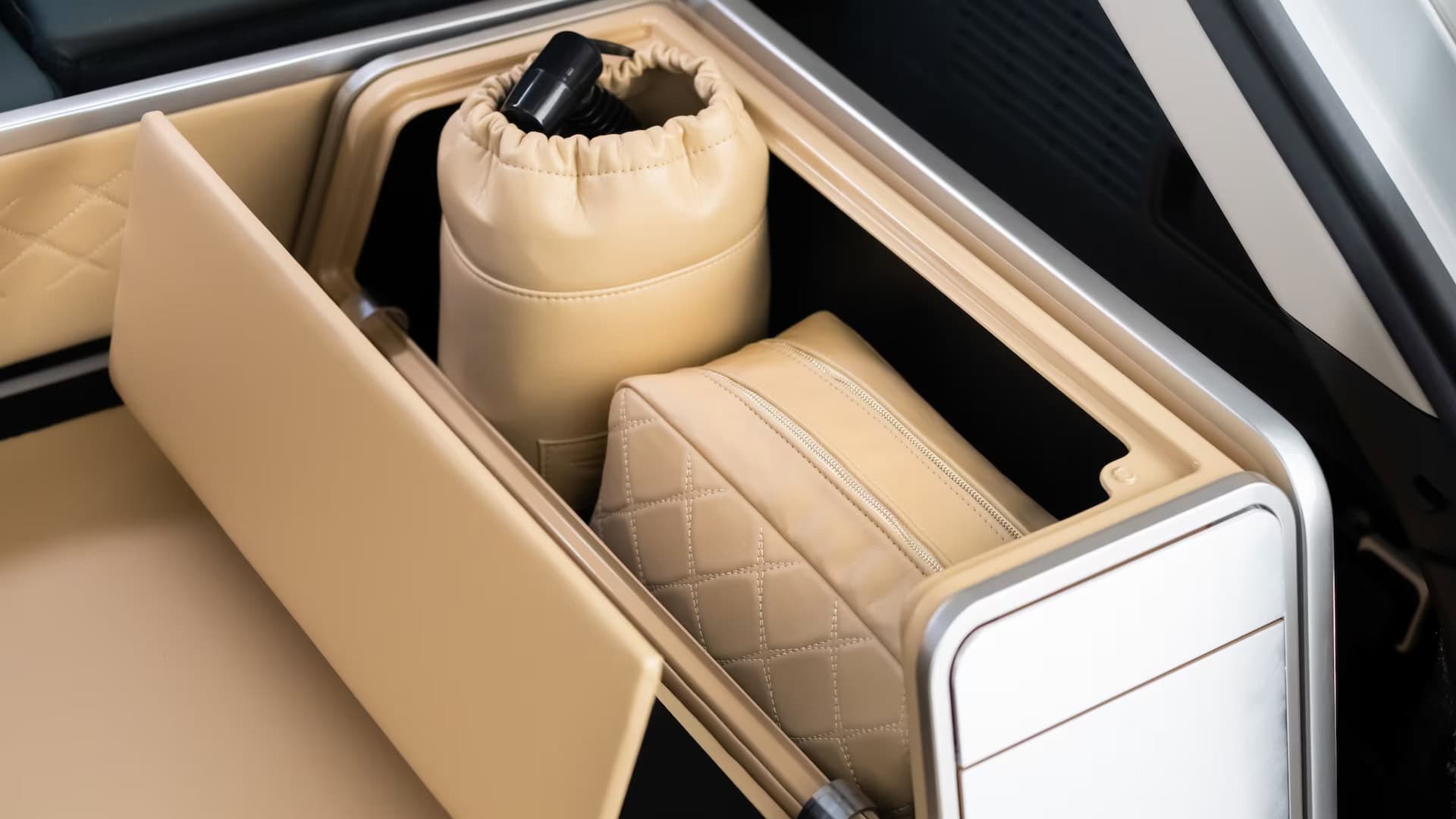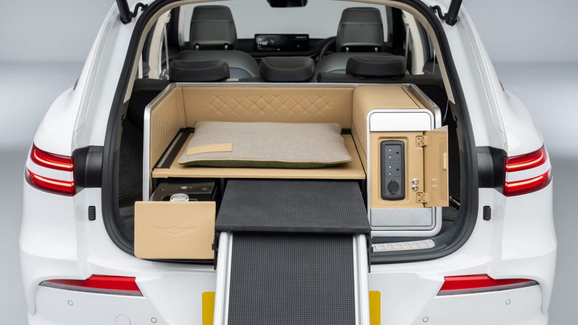 Pour assurer la sécurité du chien, un harnais de sécurité s’attache à un point d’ancrage intégré. Une rampe coulissante en aluminium ultra-léger avec des tubes télescopiques en fibre de carbone facilite l’entrée et la sortie du chien. Si ce choyé se salit, un système de douche pour chien est intégré avec un réservoir d’eau sous pression de six litres ce qui permet de le nettoyer de toute saleté et débris. Vous pouvez également le sécher à l’aide d’un sèche-poils de chien électrique alimenté par le système V2L du GV70 Electrified. Oui, même cet accessoire est sur mesure et conçu pour offrir un flux d’air et une température “au poil” afin de réduire le temps de séchage.