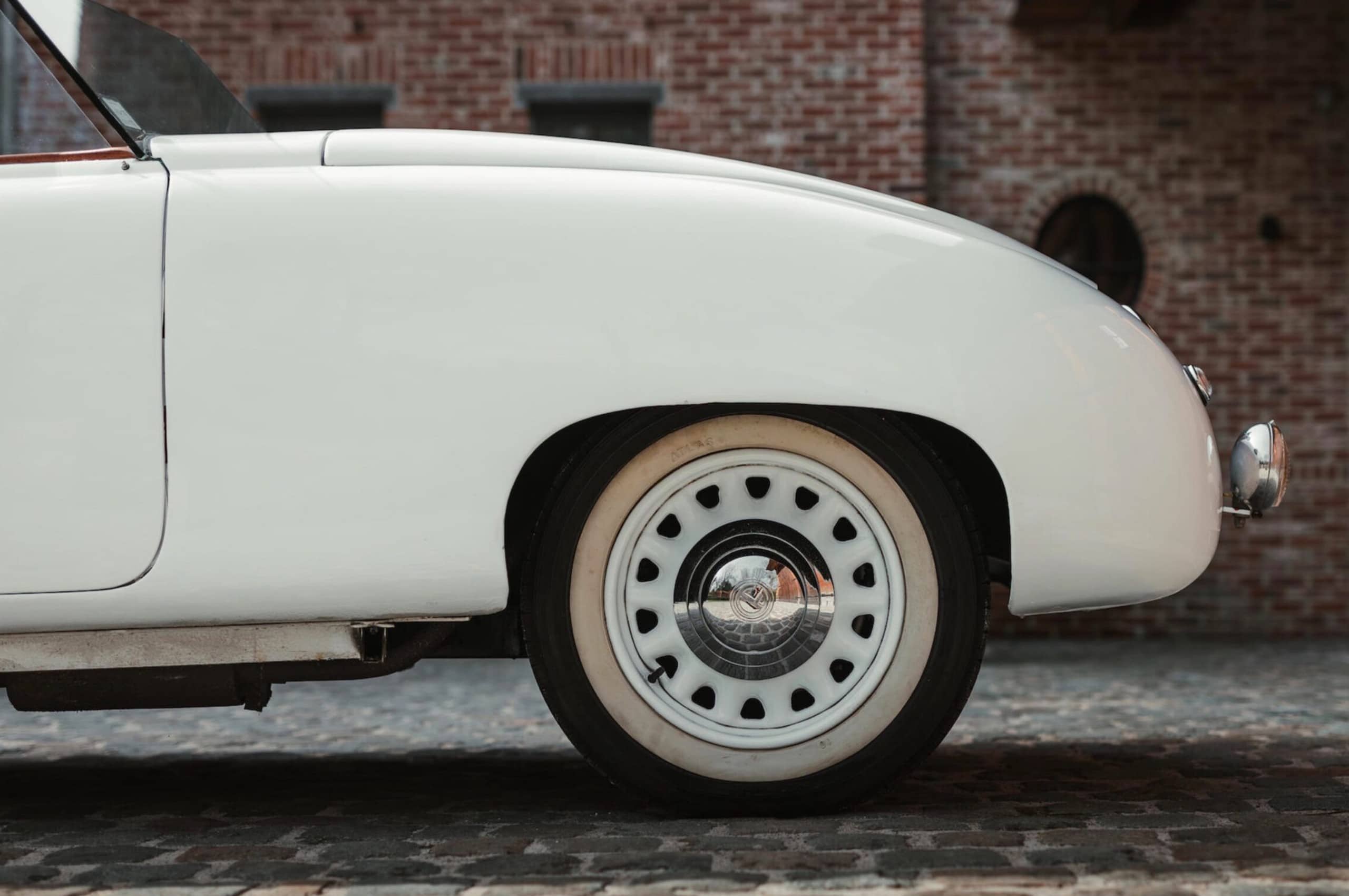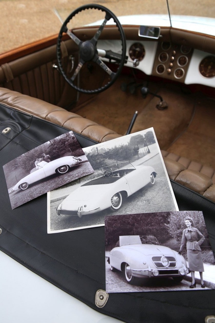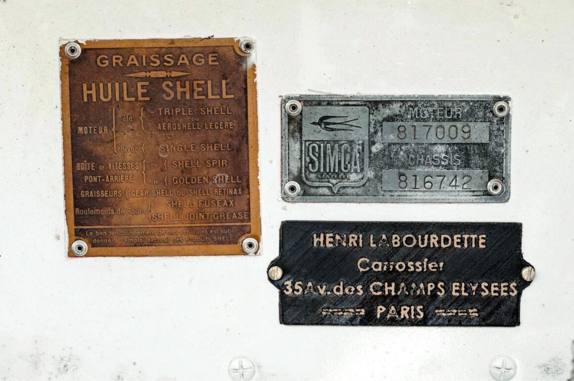 La documentation d’accompagnement se compose de photos en noir et blanc (montrant un mannequin-modèle Vogue de 1950 posant à côté de la voiture), de magazines et de papiers d’immatriculation belges obtenus en un temps ou ce genre de subterfuge pouvait encore se faire…(avec comme date de 1er enregistrement : 1939, chassis 816742 et moteur Simca 817009), ce qui est une impossibilité, donc une “menterie pour la gloire de l’automobile Française”). C’est typiquement le genre de bitza qu’on trouve dans des foires d’anciennes !