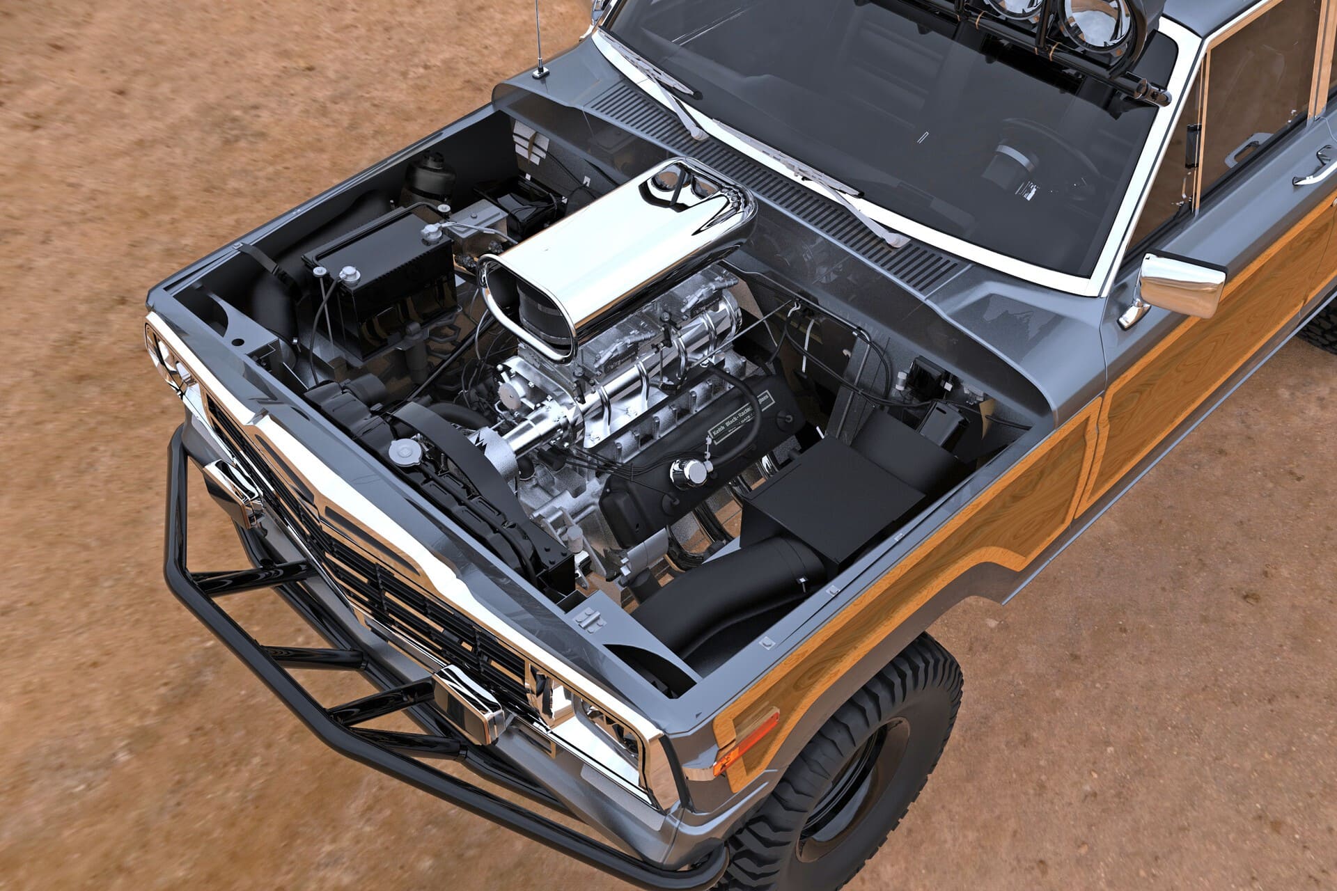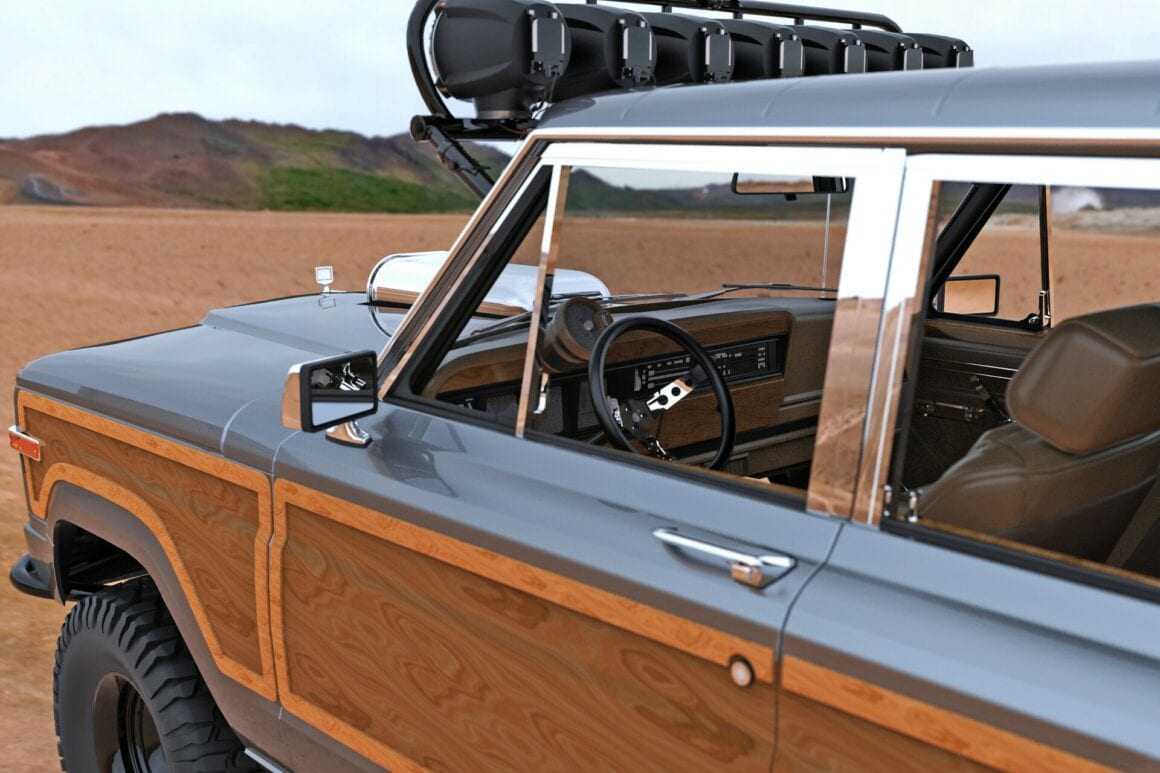 Propulsé par le moteur V-8 360 CI et la transmission automatique 727 l’engin fait Far-West ! La carrosserie a été peinte en Burgundy Pearl personnalisé avec des boiseries simulées appropriées. L’intérieur est “rembourré” avec des surfaces d’assises personnalisées à carreaux qui correspondent doucement à la peinture extérieure. C’est très kitch ! Le tableau de bord est neuf et équipé d’un système stéréo avec des composants actuels cachés, d’un écran pour visionner la caméra de recul et d’une climatisation d’usine pour aider à garder les choses au frais. Ce Jeep Grand Wagoneer a été le premier grand SUV 4×4 de luxe, produit sous de nombreuses marques de 1963 à 1991. Quasiment unique en son genre, ce véhicule a subi toutes les vicissitudes de ses constructeurs, Willys à l’origine, Kaiser Motors ensuite, AMC et enfin Chrysler, lui-même racheté par le groupe italien Fiat en 2009.