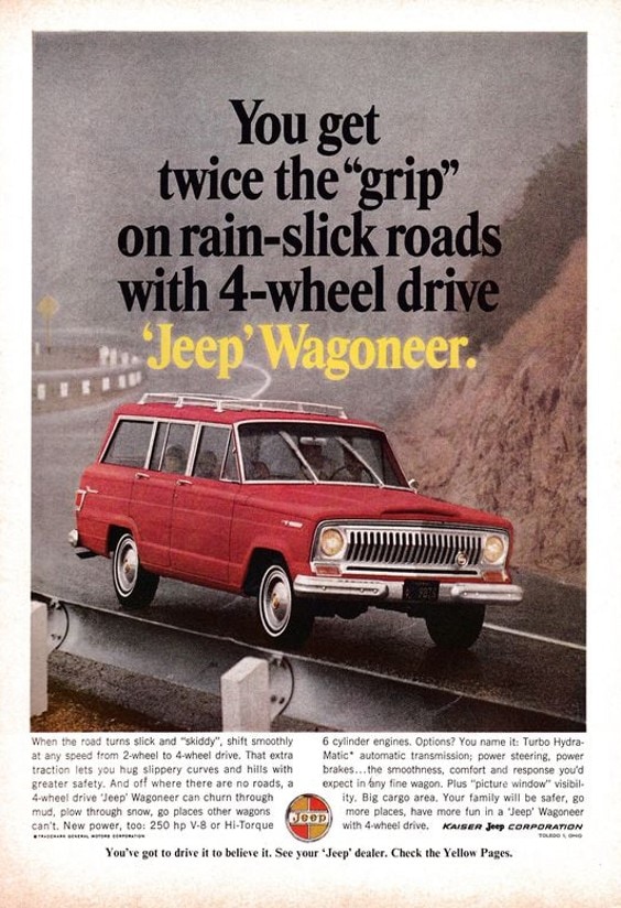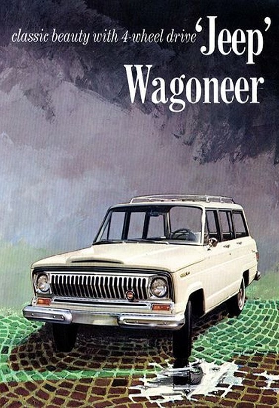 Présenté en 1963, dessiné par le designer Brook Stevens, le Jeep Wagoneer utilisait la plate-forme/châssis/moteur/boite/trains-roulants du Jeep Gladiator Pickup, proposant aux clients-potentiels la possibilité de transporter leur famille, leur marmaille, leurs chiens, leurs amis, leurs meubles, leurs reliques et les ustensiles ménagers (et autres accessoires), dans le confort de suspensions dures et sautillantes. Avec en prime, la possibilité d’accrocher une remorque U-Haul pour déménager ou y placer du matériel de pêche et de camping, ce qui sous-entendait de pouvoir sortir de la route en cas de besoin, sans nécessairement que ce soit en cause d’un accident, mais le besoin impérieux d’aller faire pipi/caca dans des buissons derrière des arbres loin de la route… Le re-carrossage du Pick-Up Jeep Gladiator en Wagoneer s’est avéré une initiative populaire parmi les amateurs de Jeep et auprès des gens simplement à la recherche d’un gros véhicule pour leurs besoins (naturels, entres-autres) !
