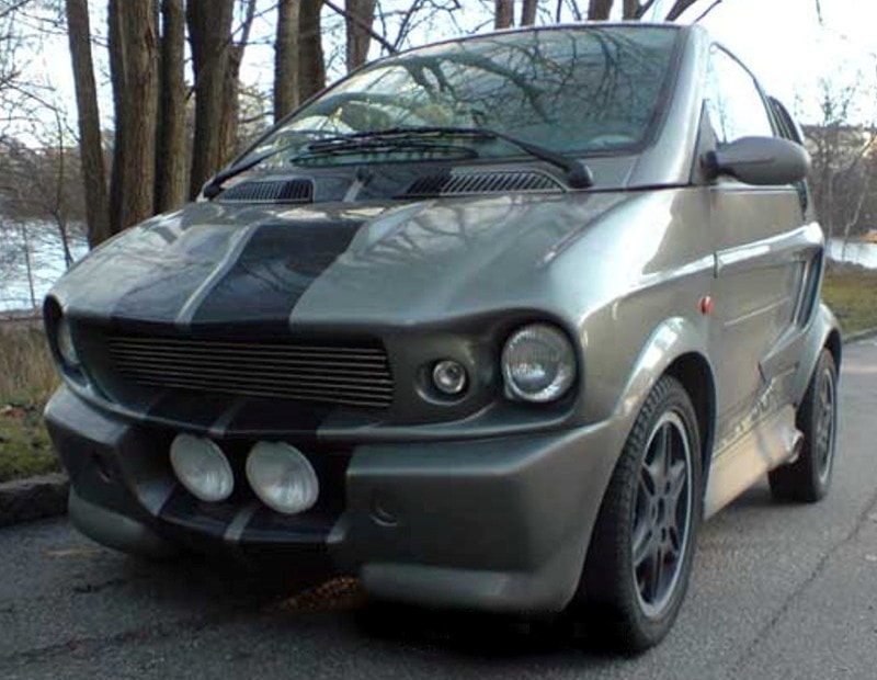 Existe-t-il une Eléanor plus in, plus tendance et plus cool que toutes les répliques évoquées ? Ouiiiiiiiiiiiiiiiiiiii ! Des plus cinglés, des Polonais, (qui sont pires encore que les Ukrainiens) ont eu l’idée lumineuse de créer une Smart Eléanor… Et rien qu’en regardant les photos, ami internaute : “t’as l’air cool même en étant un gros loser”. Le premier gag est que ce kit a été élaboré sur une ancienne mouture (plus fabriquée) de la Smart. Le second gag est que ce kit devait être refait sur base de la “nouvelle” Smart-2, au moment ou elle a cessé d’être fabriquée… et que Smart était vendu “en l’état” par Mecedes à une société Chinoise ! Donc c’est triplement raté ! Ici c’est simple, plus cool tu meurs (d’une overdose de cool, sans doute), c’est cool (tout est cool), tout le monde qui en veut une doit être cool, s’habiller cool, traîner dans des endroits cool (un vrai truc de malade : que du pointu, que du lourd, que du bon) et les soirées seront cool… C’est l’Eléanor bigarrée/négligée/chic du nouveau millénaire qui semble vouloir faire revivre, de façon plus standard, l’effervescence sociale et débile qui avait suivi les projections du film “60 secondes”… C’est une Nième arnaque à l’Ukrainienne, version Polonaise (plus retord encore? Français bienvenus ! ).