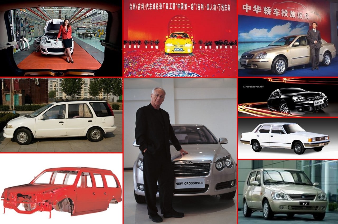 Divers prototypes furent conçus, comme la “CA 750”, sans lendemain, l’explosion des voitures “made in China” sera donc le fait d’entreprises privées et d’économies mixtes, signe de la libéralisation de l’économie Chinoise, on vit alors apparaitre des “self-made men” à l’histoire volontiers romancée, “Li Shu Fu” étant le plus célèbre. Tout petit, ce fils de riziculteurs construisait des voitures avec de la terre… il déclara : “Un jour, à Wenzhou (capitale mondiale du briquet jetable), on fabriquera autant de voitures que de briquets !” (sans préciser que ces voitures auraient la même durée de vie qu’un briquet)… Li était tellement fier de cette pensée qu’il la répètera plusieurs fois en public, sous différentes variantes, mais c’était dans les années 80 et Li n’avait ni les compétences techniques, ni l’argent pour devenir constructeur, alors, en 1986, il fonda sa marque de frigos : Geely. En 1994, il passe aux motos, puis en 1996, Geely se lance enfin dans l’automobile, la “Geely Haoqing” est une “Xiali” reliftée, motorisée par un Toyota 1,0L, quant à “l’usine”, c’est davantage un atelier d’assemblage. Le 8 aout 1998 (le 8 étant un chiffre porte-bonheur en Chine), l’Haoqing est produite en série et Geely devient le premier constructeur Chinois à capitaux privés.
