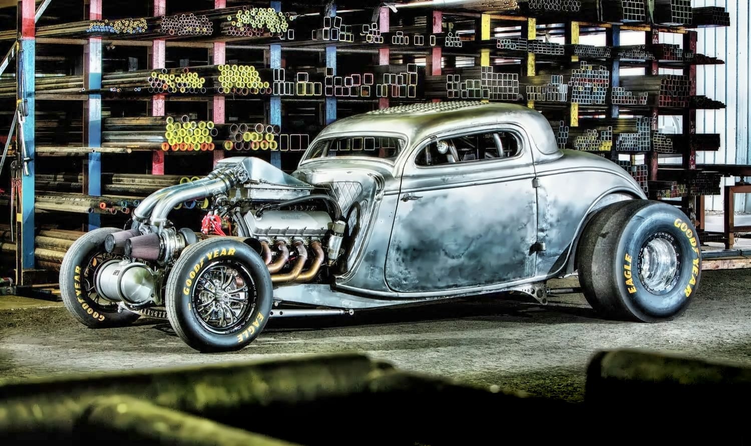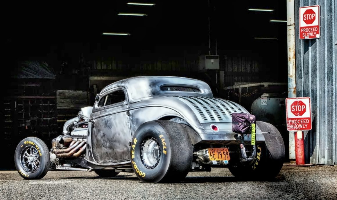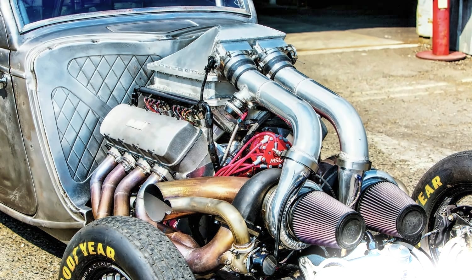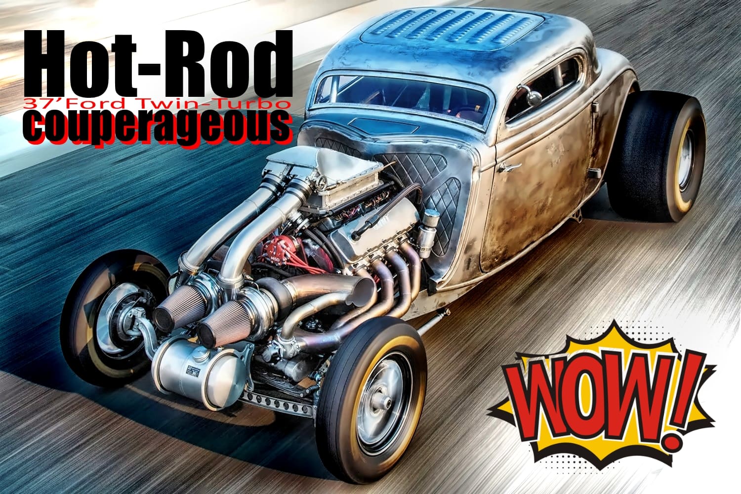 Rich Feicheer y va fort avec son Ford’37 Coupé Three Windows…, qui plus est, il circule normalement sans radiateur visible, sans capot, ni ailes… et réalise le quart de mile en 7 secondes au grand prix des feux de circulation (la distance moyenne en ville entre deux carrefours)…, grâce aux 1200 chevaux de son V8 Chevy 598ci bi-turbo-88mm équipé d’une injection Fast XFI avec 16 injecteurs…