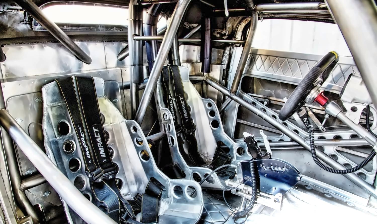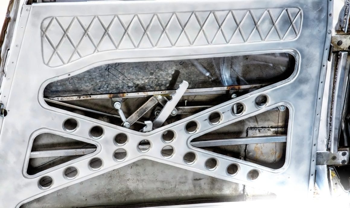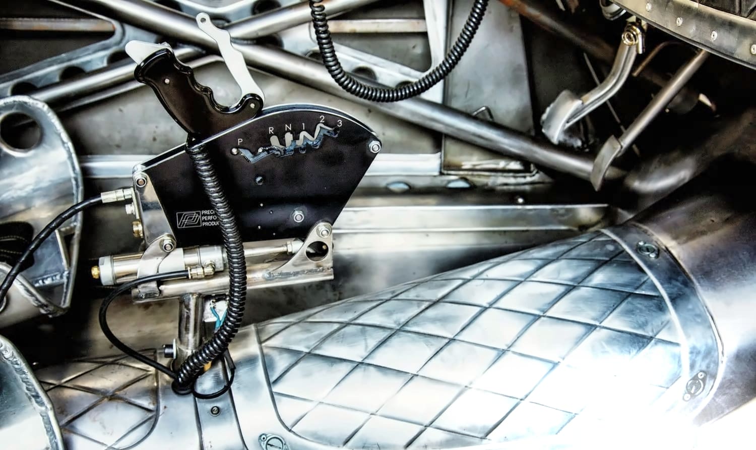 -“Mec, c’est cool, je ne suis pas inquiet. C’est l’une des bonnes choses sur les turbos, ils ne produisent de la chaleur que lorsque qu’on les stimule, contrairement à un Blower qui fait constamment la chaleur. Sur une voiture comme celle-ci, pas besoin de boost, donc c’est juste un moteur à faible compression turbocompressé. Un autre truc à l’intérieur, je suis particulièrement fier de la porte “Lenco-style” et de mon mécanisme d’ouverture de la vitre. Je ne voulais pas ajouter de lourds mécanismes de portes, alors j’ai construit un assemblage soigné avec un levier push/pull qui ferme les fenêtres et ouvre les portes. L’ouvre-porte et la manivelle pivotent sur le même point. C’est le génie américain, Frenchie !”…