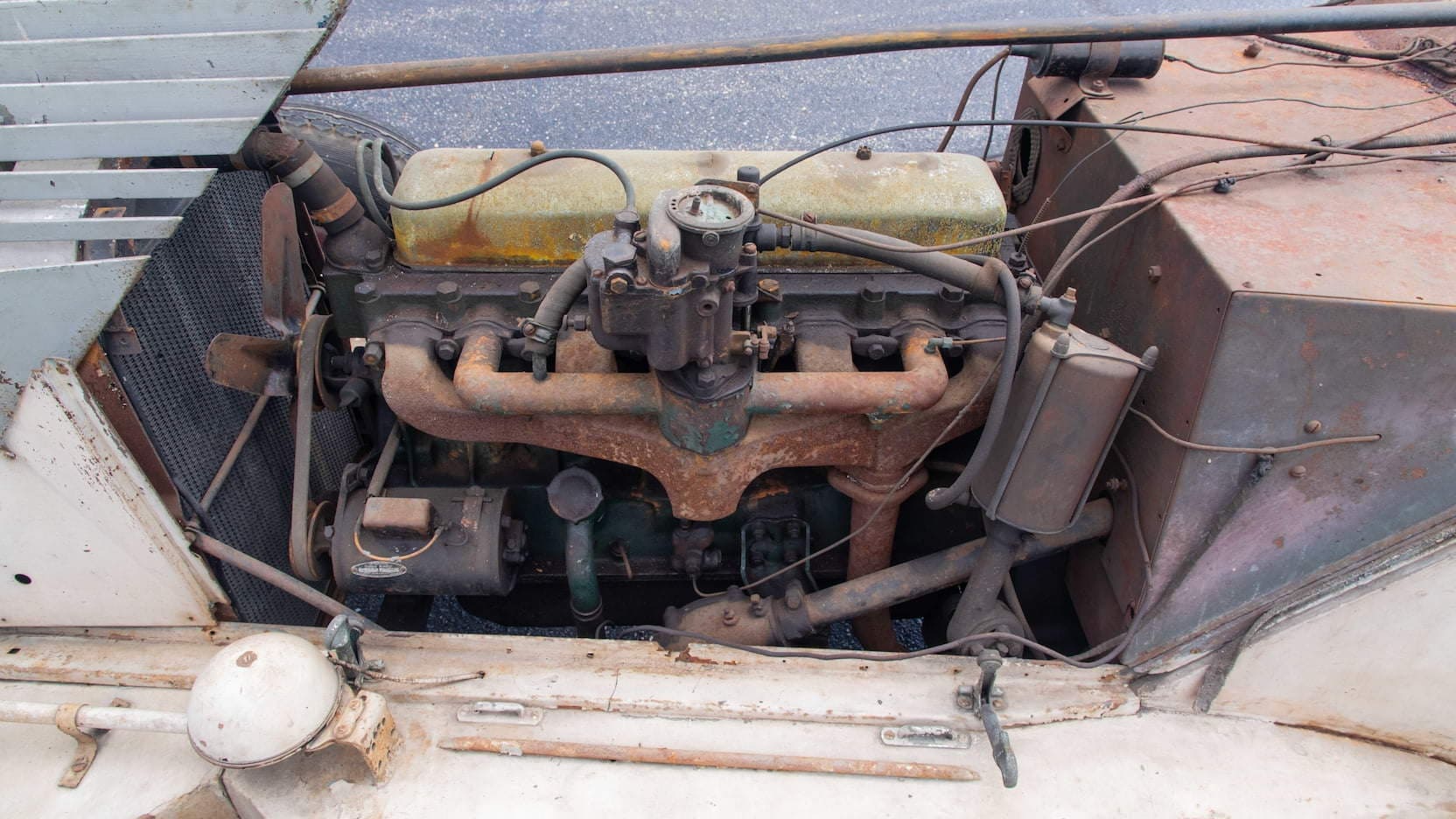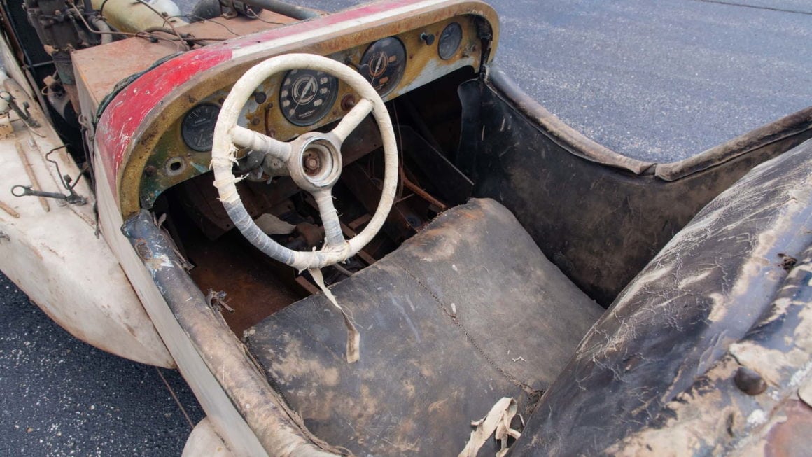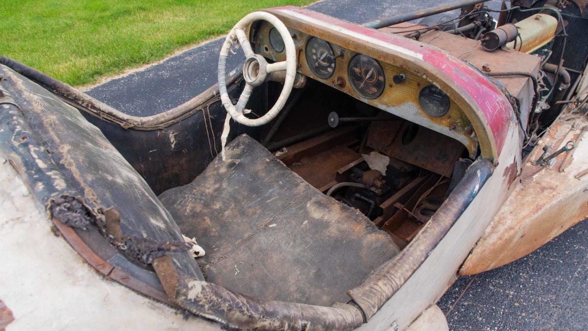 Le châssis entièrement en acier est intact, de même que la carrosserie et la mécanique qui fonctionne…, l’intérieur est rembourré de cuir… il serait dommage de restaurer une telle rareté.