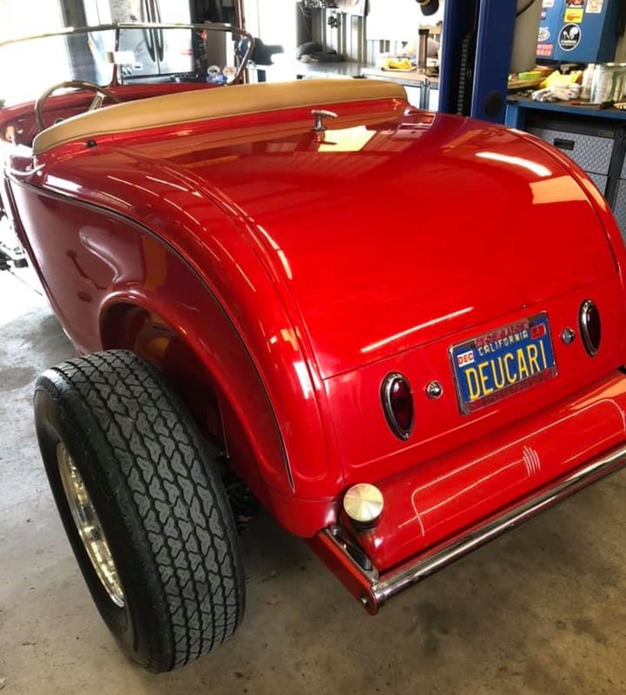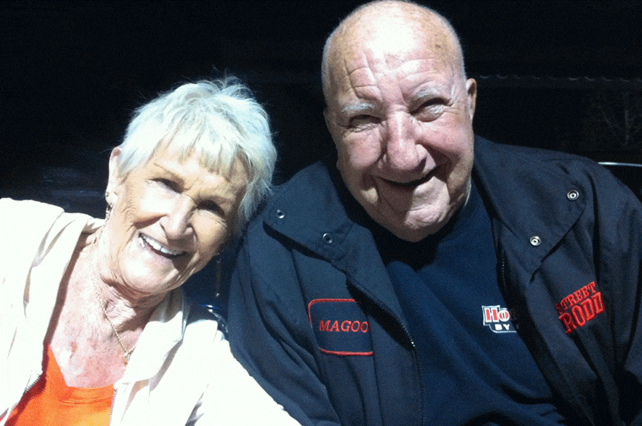 Il y a une certaine stigmatisation qui vient souvent avec les Hot-Rods. La Deucari, (contraction de “Deuce et Ferrari”) est un Hot-Roadster Ford 1932 à moteur Ferrari, qui a été défini comme ayant été le plus beau Hot-Roadster d’Amérique en 1979, année ou il a été construit par Dick “Magoo” Megugorac (Ci-dessus dans les années ’60 et ci-dessous avec son épouse en 2020) pour compte et finances de Brian Burnett, qui dirigeait le garage Los Gatos Ferrari… Burnett n’en pouvait plus de vendre des Ferrari, les belles lignes américaines d’un Hot-Roadster Deuce type ’32 lui manquaient, mais avec le grondement d’une voiture de sport Italienne Ferrari V-12 !