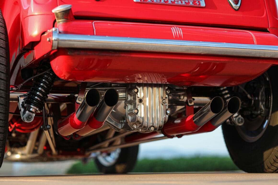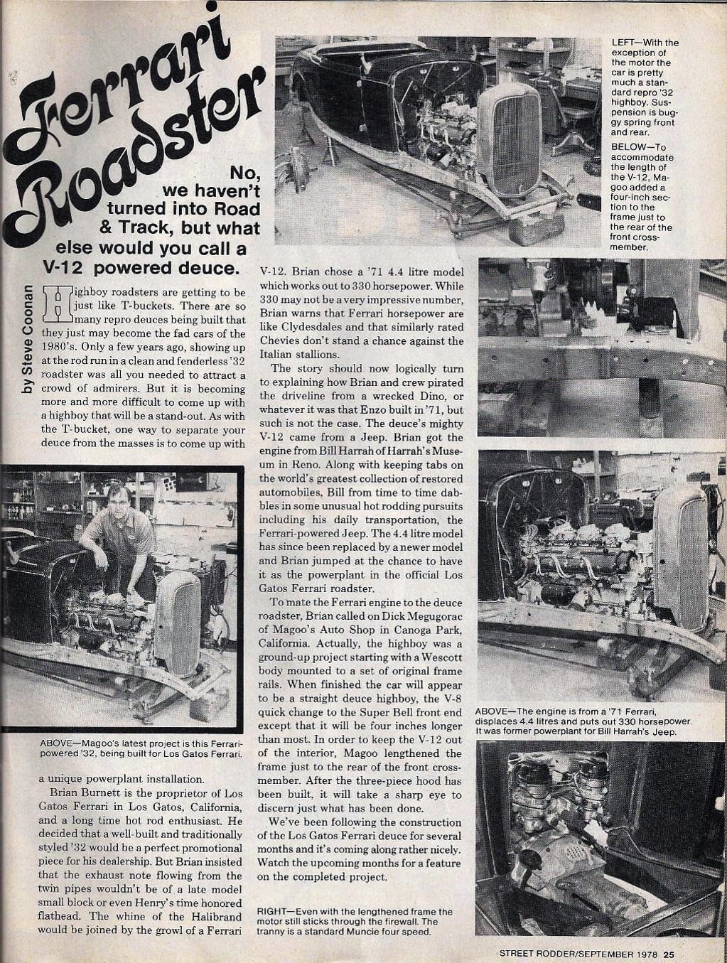 Les moteurs Ferrari V-12 en parfait état récupérés de Ferrari en pertes totales, ne sont pas faciles à trouver, et même en tant que concessionnaire Ferrari, Burnett n’en avait pas ! Cependant, il s’est avéré qu’il connaissait Bill Harrah qui avait placé un V12 Ferrari V-12 4,4 litres dans une Jeep Wagoneer et que par un coup du hasard, cette “Jerrari” allait être remotorisée de manière originale ! C’était parti pour une opération chez Magoo.
