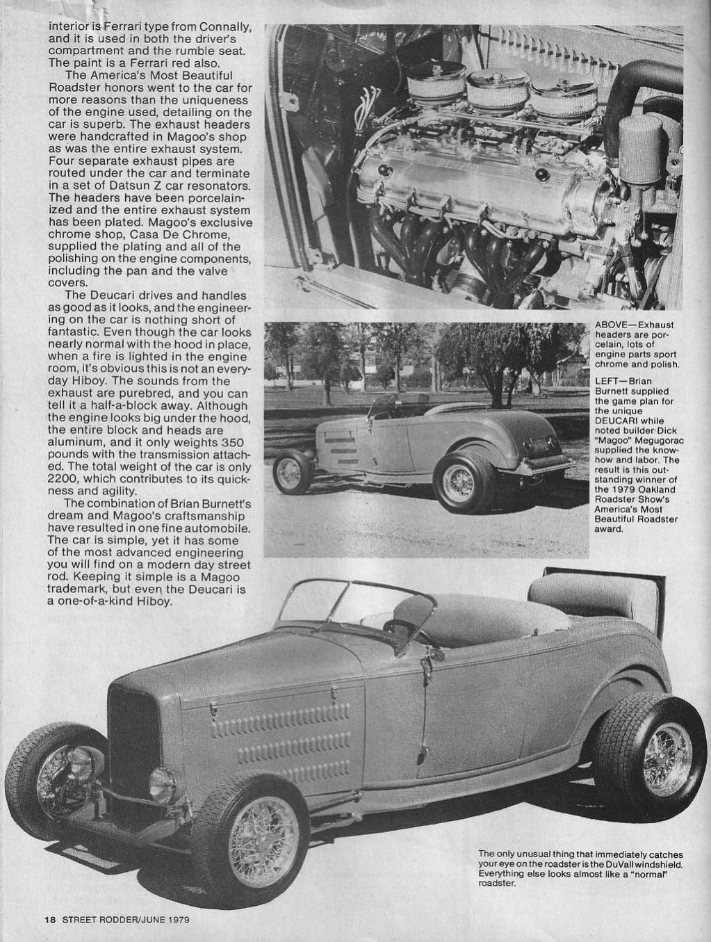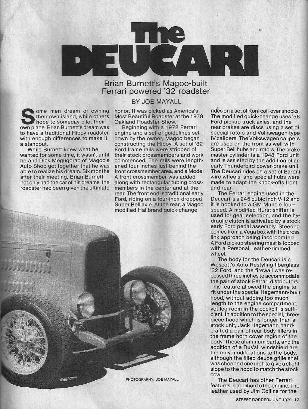 Pour réaliser ce transsexualisme automobile il a demandé à Dick “Magoo” Megugorac qui était propriétaire du garage “Magoo’s Street Rods” d’opérer un transsexualisme… Il a passé six mois à construire l’incroyable engin illustrant cet, une création personnalisée réunissant deux mondes automobiles disparates en une seule machine frappante. D’où le surnom de “Deucari”.