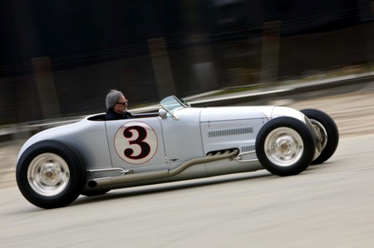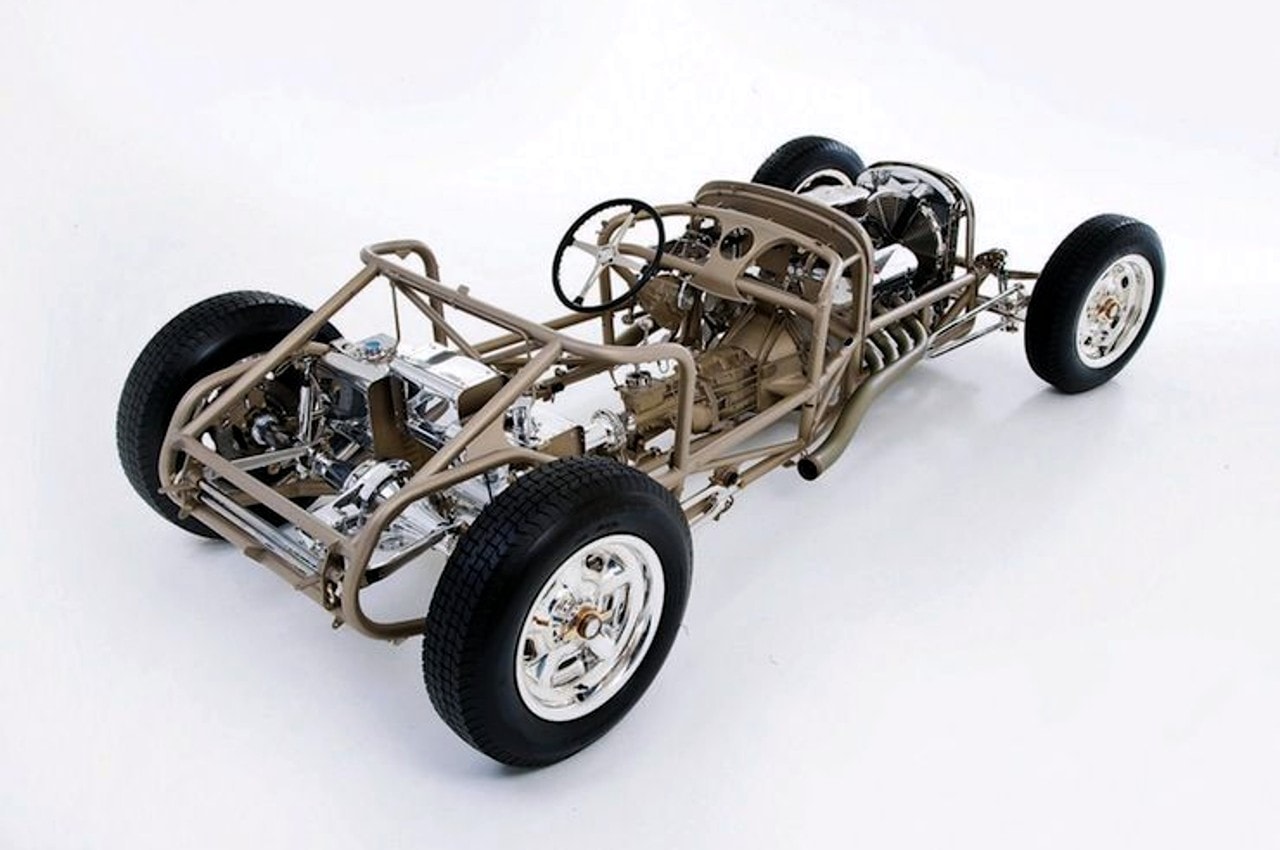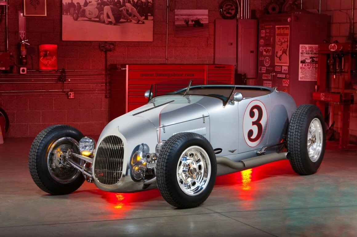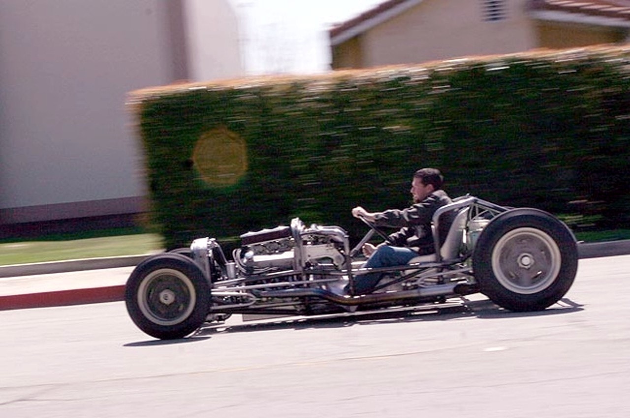 Alors voilà enfin la description tant attendue ! Le Ford Indy Speedster V8 a été construit par Bill Lindig et l’équipe de SO-CAL. Le châssis, fabriqué en tubes chromoly a été revêtu de titane et de céramique. Il a été conçu par Jacky Howerton pour que ce Hot-Rod Indy Speedster ait une même maniabilité que les Midgets de sprint. Le moteur Ford small block V8 de 450cv est un “Art Chrisman” 353ci en aluminium disposant de triples carburateurs Holley. L’embrayage Center Force dispose d’un volant d’inertie en aluminium à destination de la transmission manuelle cinq vitesses BorgWarner World Class. Ceux qui ont eu le plaisir de rouler dans l’Indy Speedster ont loué sa tenue de route et ses capacités de freinage.