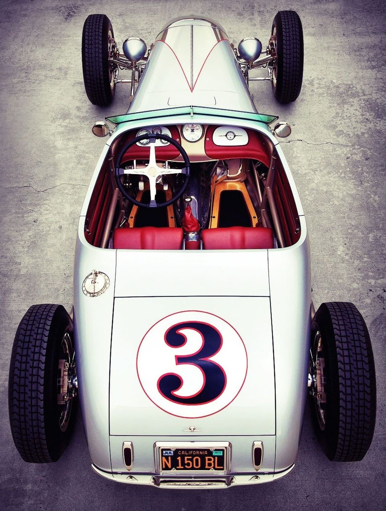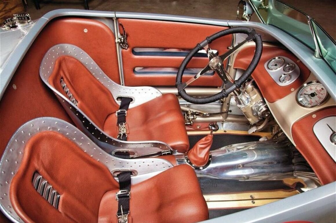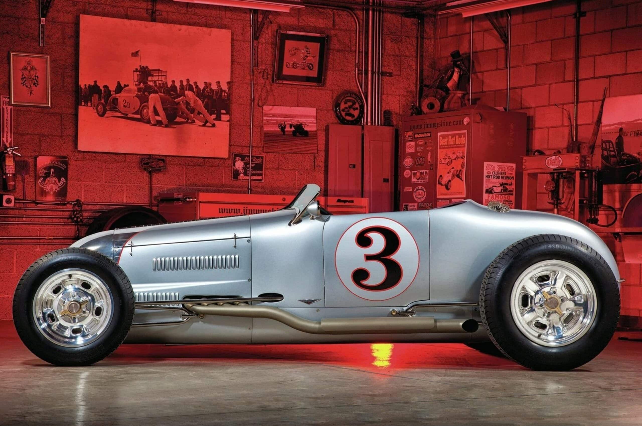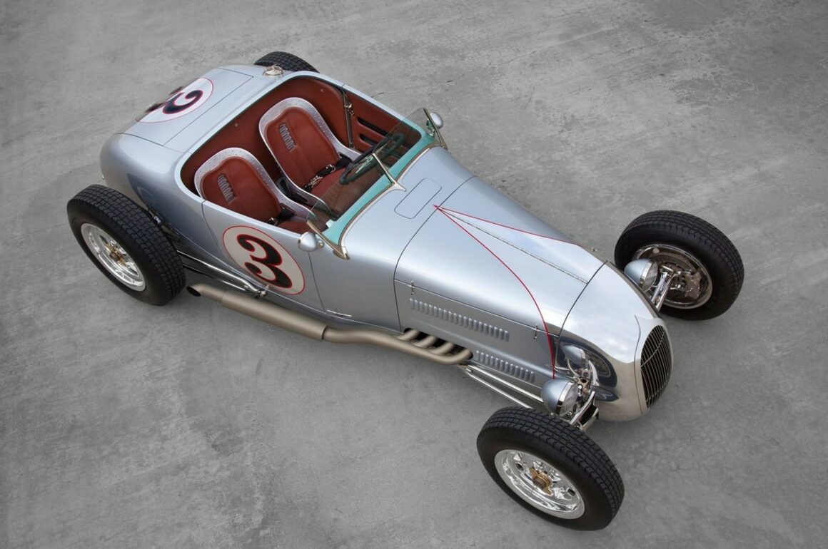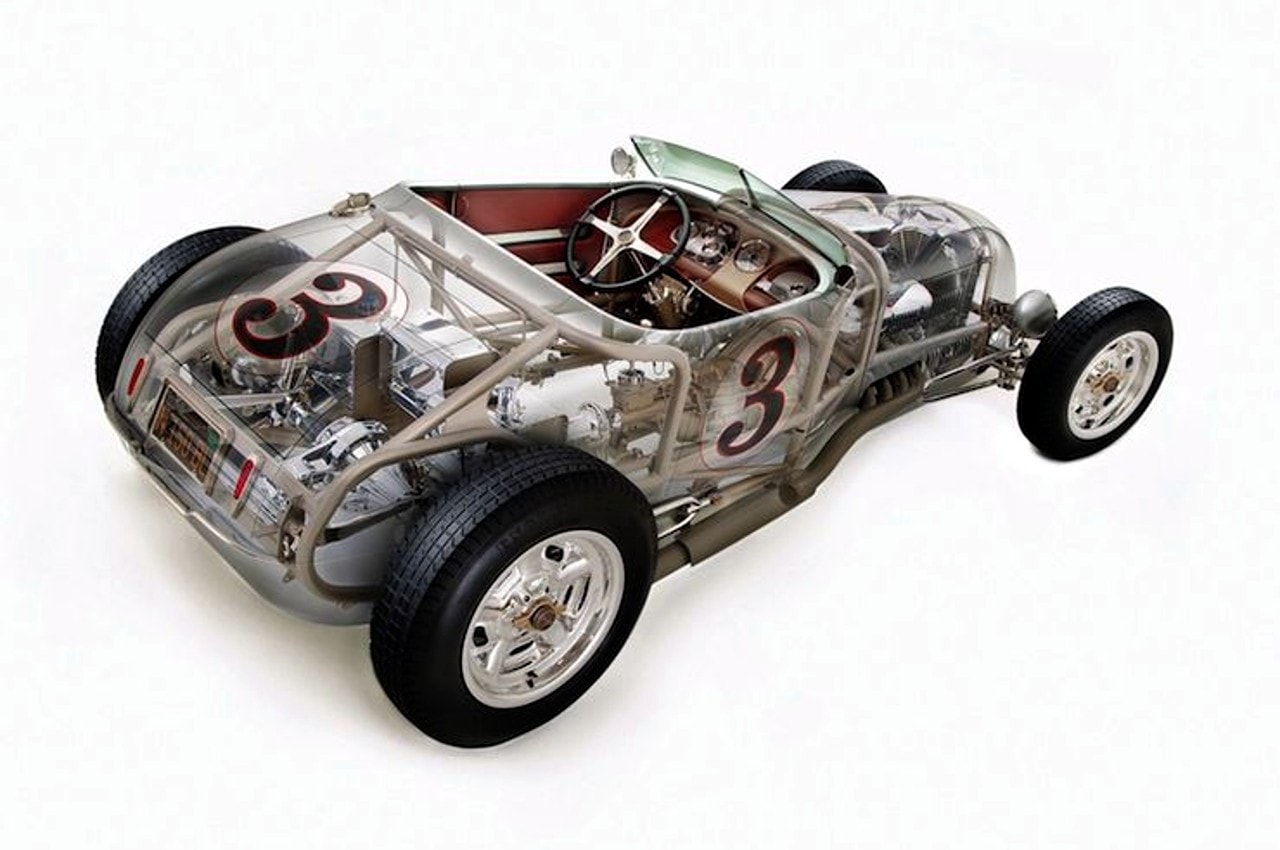 Alors voilà enfin la description tant attendue ! Le Ford Indy Speedster V8 a été construit par Bill Lindig et l’équipe de SO-CAL. Le châssis, fabriqué en tubes chromoly a été revêtu de titane et de céramique. Il a été conçu par Jacky Howerton pour que ce Hot-Rod Indy Speedster ait une même maniabilité que les Midgets de sprint. Le moteur Ford small block V8 de 450cv est un “Art Chrisman” 353ci en aluminium disposant de triples carburateurs Holley. L’embrayage Center Force dispose d’un volant d’inertie en aluminium à destination de la transmission manuelle cinq vitesses BorgWarner World Class. Ceux qui ont eu le plaisir de rouler dans l’Indy Speedster ont loué sa tenue de route et ses capacités de freinage.