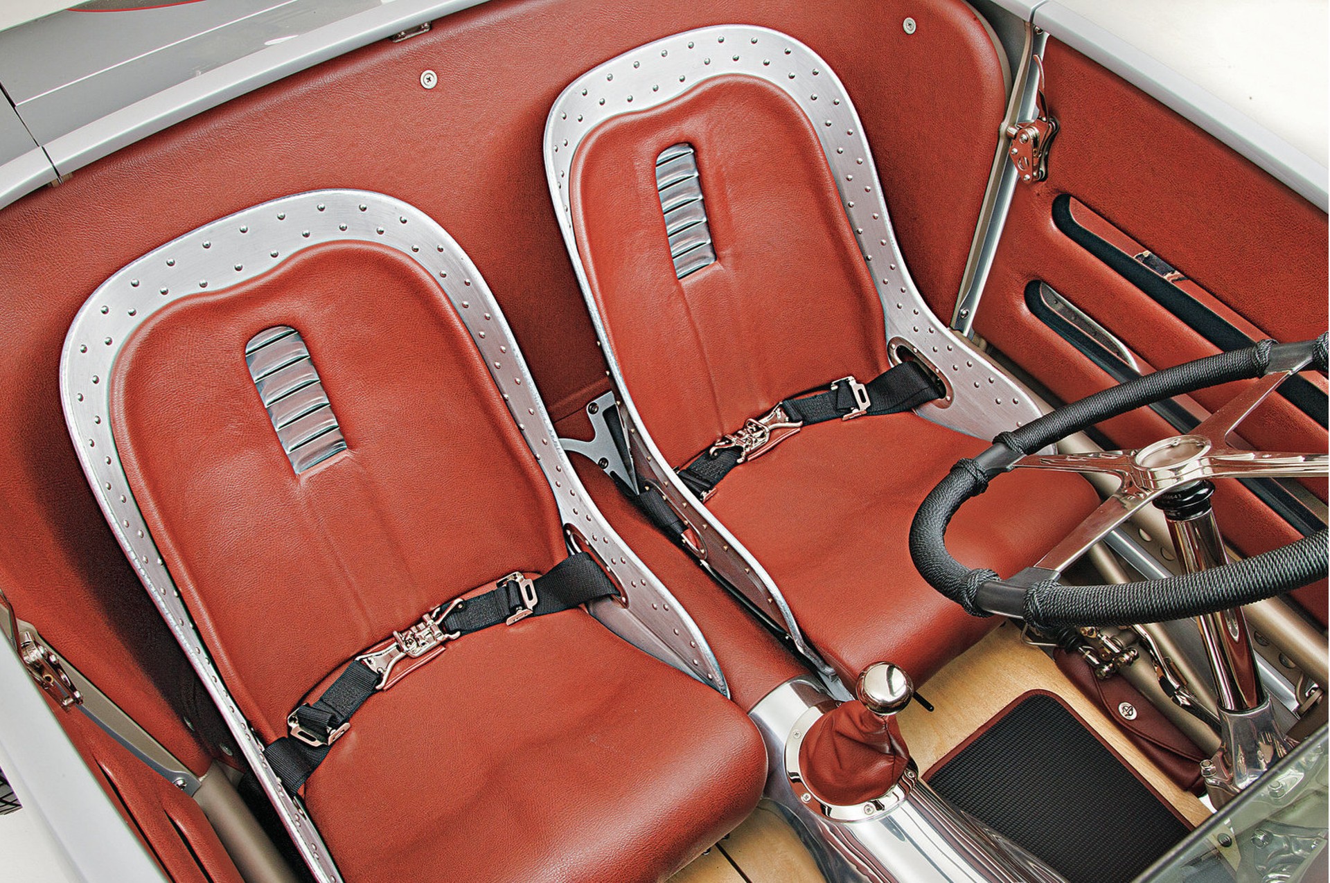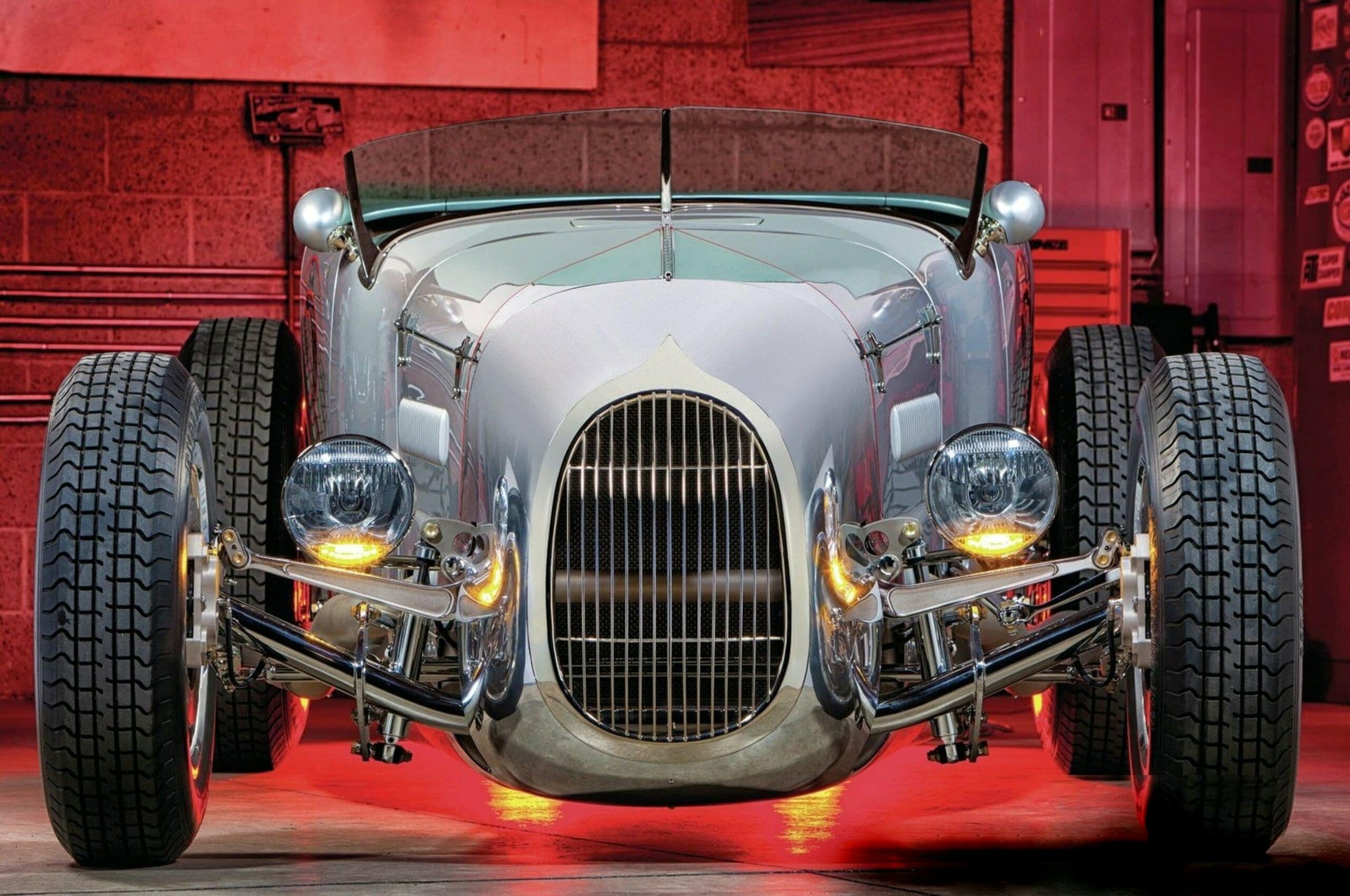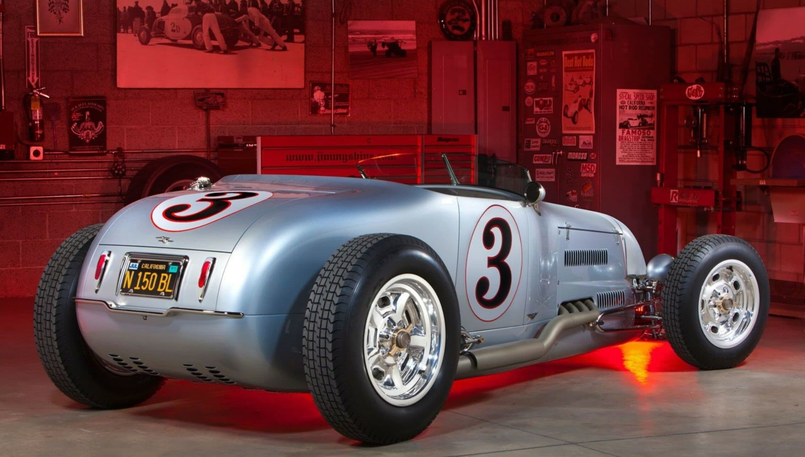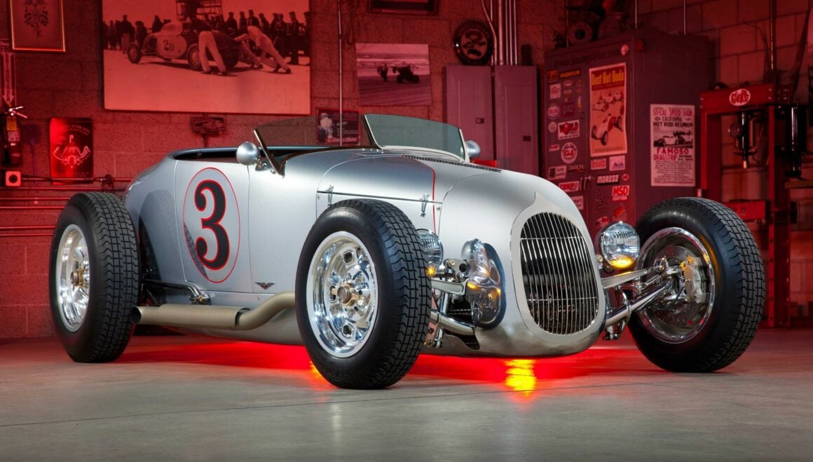 Alors voilà enfin la description tant attendue ! Le Ford Indy Speedster V8 a été construit par Bill Lindig et l’équipe de SO-CAL. Le châssis, fabriqué en tubes chromoly a été revêtu de titane et de céramique. Il a été conçu par Jacky Howerton pour que ce Hot-Rod Indy Speedster ait une même maniabilité que les Midgets de sprint. Le moteur Ford small block V8 de 450cv est un “Art Chrisman” 353ci en aluminium disposant de triples carburateurs Holley. L’embrayage Center Force dispose d’un volant d’inertie en aluminium à destination de la transmission manuelle cinq vitesses BorgWarner World Class. Ceux qui ont eu le plaisir de rouler dans l’Indy Speedster ont loué sa tenue de route et ses capacités de freinage.