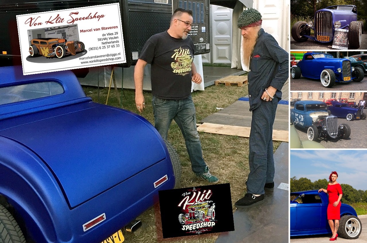 L’engin a été pensé et construit mi des années ’90 et présenté dans un magazine britannique de Hot-Rods en 1998 (le Rod était alors rouge)…, après 10 ans d’utilisations diverses, notre ingénieux Batave a décidé de le peaufiner en bleu mat…, puis le Rod fut Star de quantités de shows en Hollande, Allemagne et Belgique… ou il fut le centre d’intérêt de Billy Gibbons et Dusty Hill du Groupe ZZ-Top en tournée (voir photos)…, une sacrée plus-value !