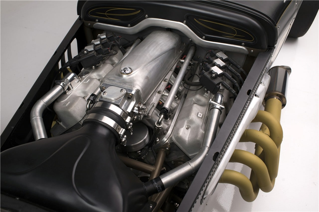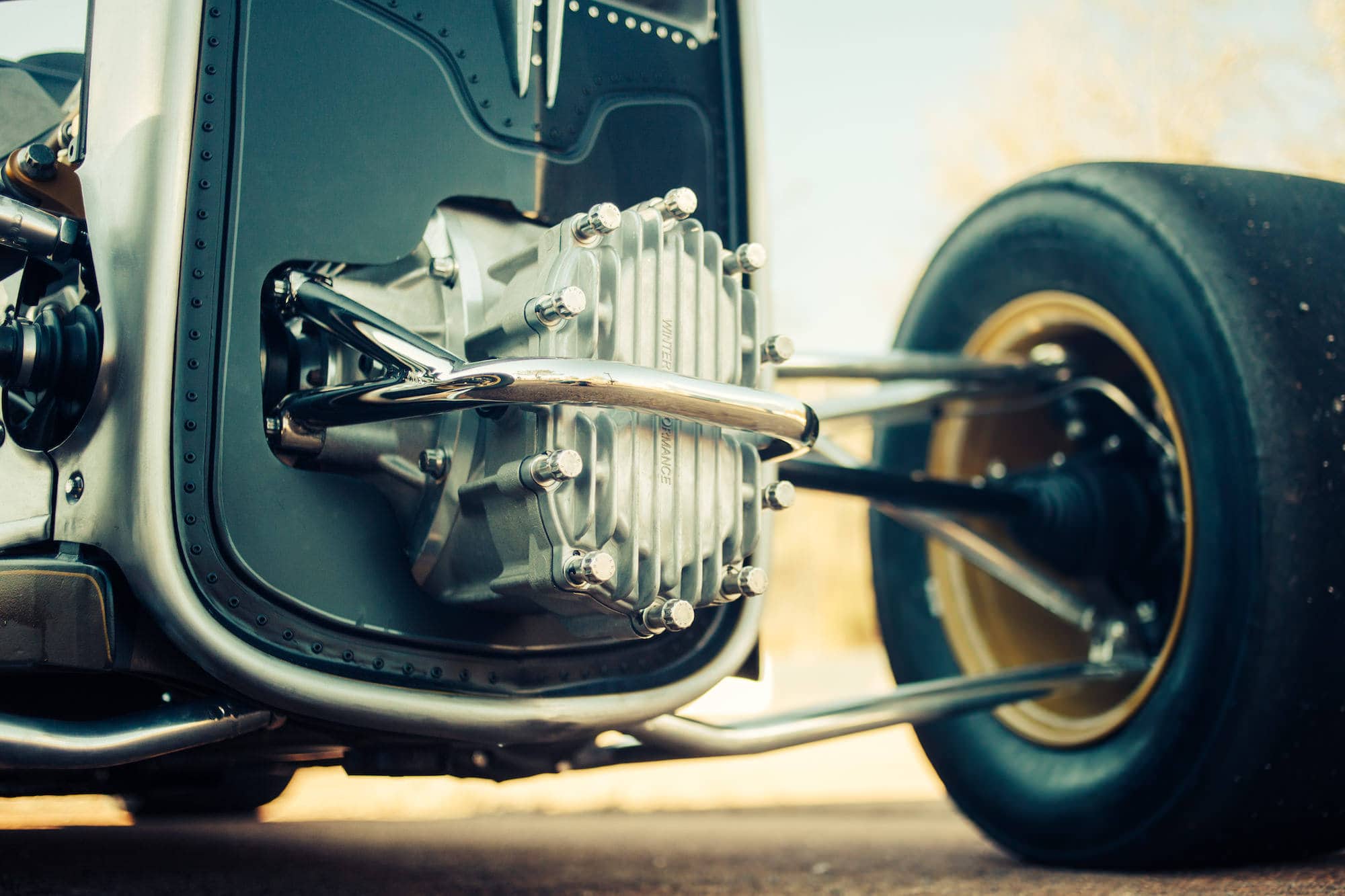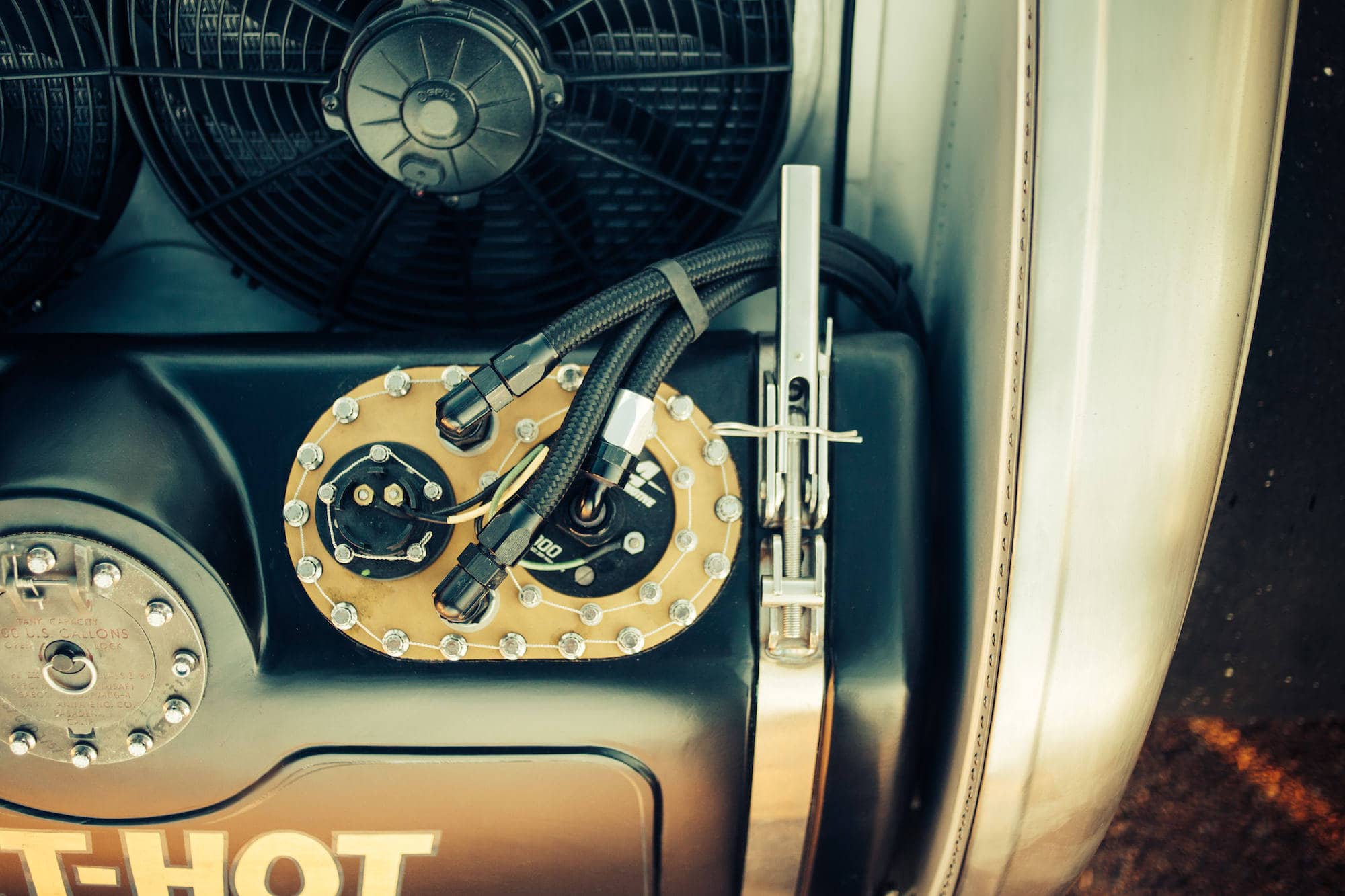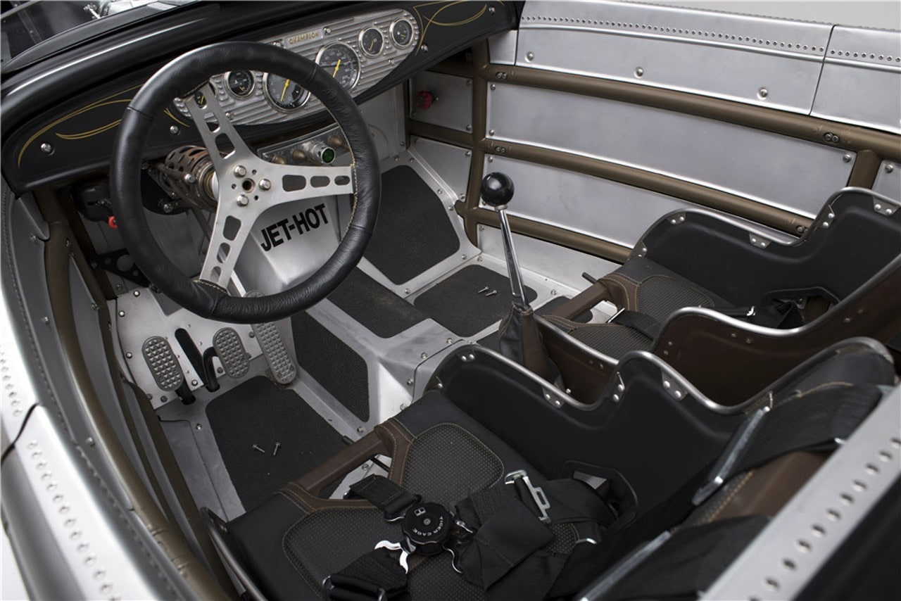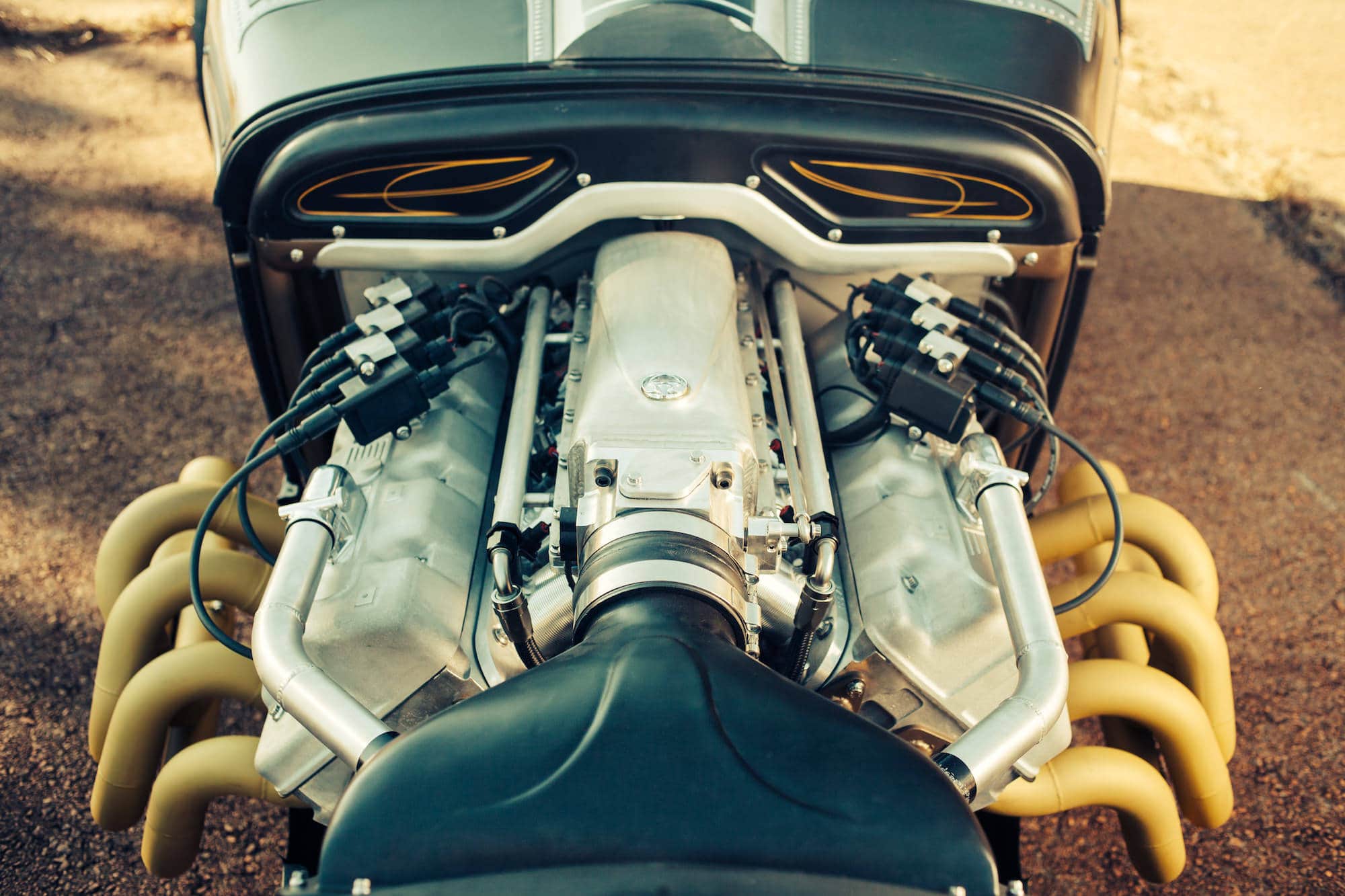 Il est temps d’en venir au Hot-Rod dont les photos (plus d’une trentaine) illustrent cet article. Bryan Fuller et son équipe ont développé un châssis qui s’adapte parfaitement à l’intérieur d’une carrosserie Ford ’32, ils l’ont ensuite motorisé d’un V8 John-Kaase-Boss de 576ci (9.400cc) préparé par Kurt Urban, développé une transmission AWD personnalisée et l’ont associée à une suspension dérivée de la course.