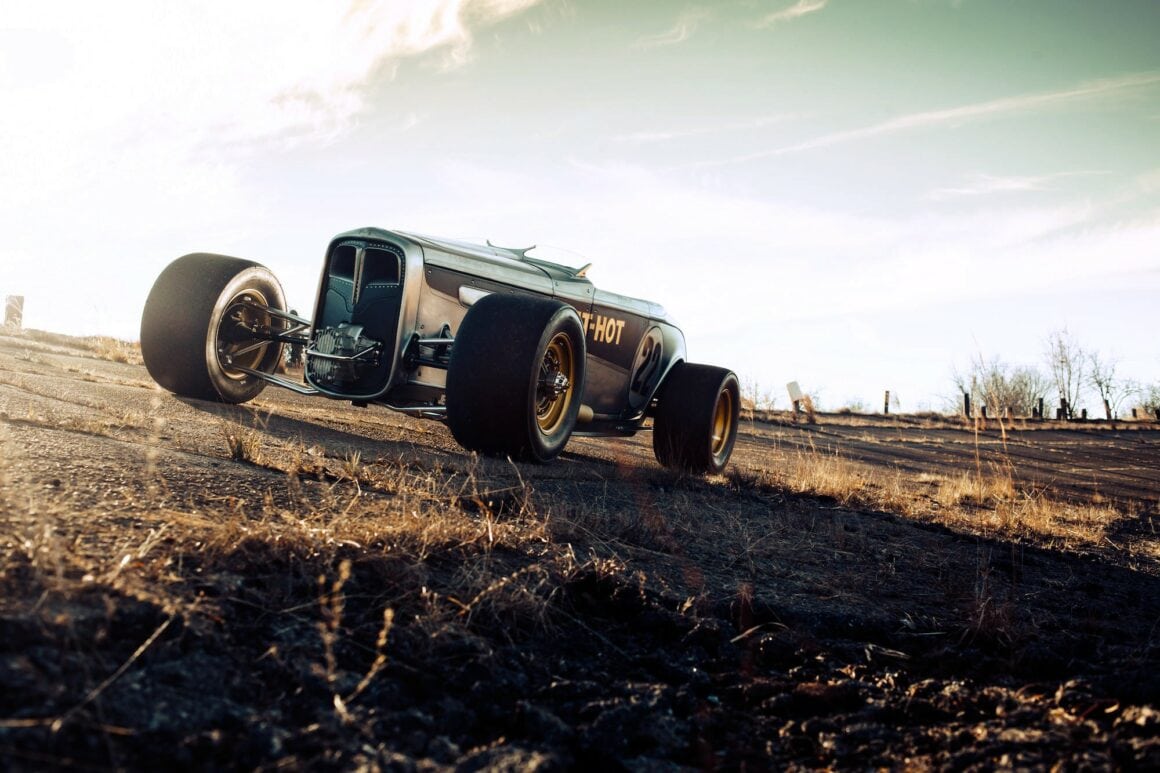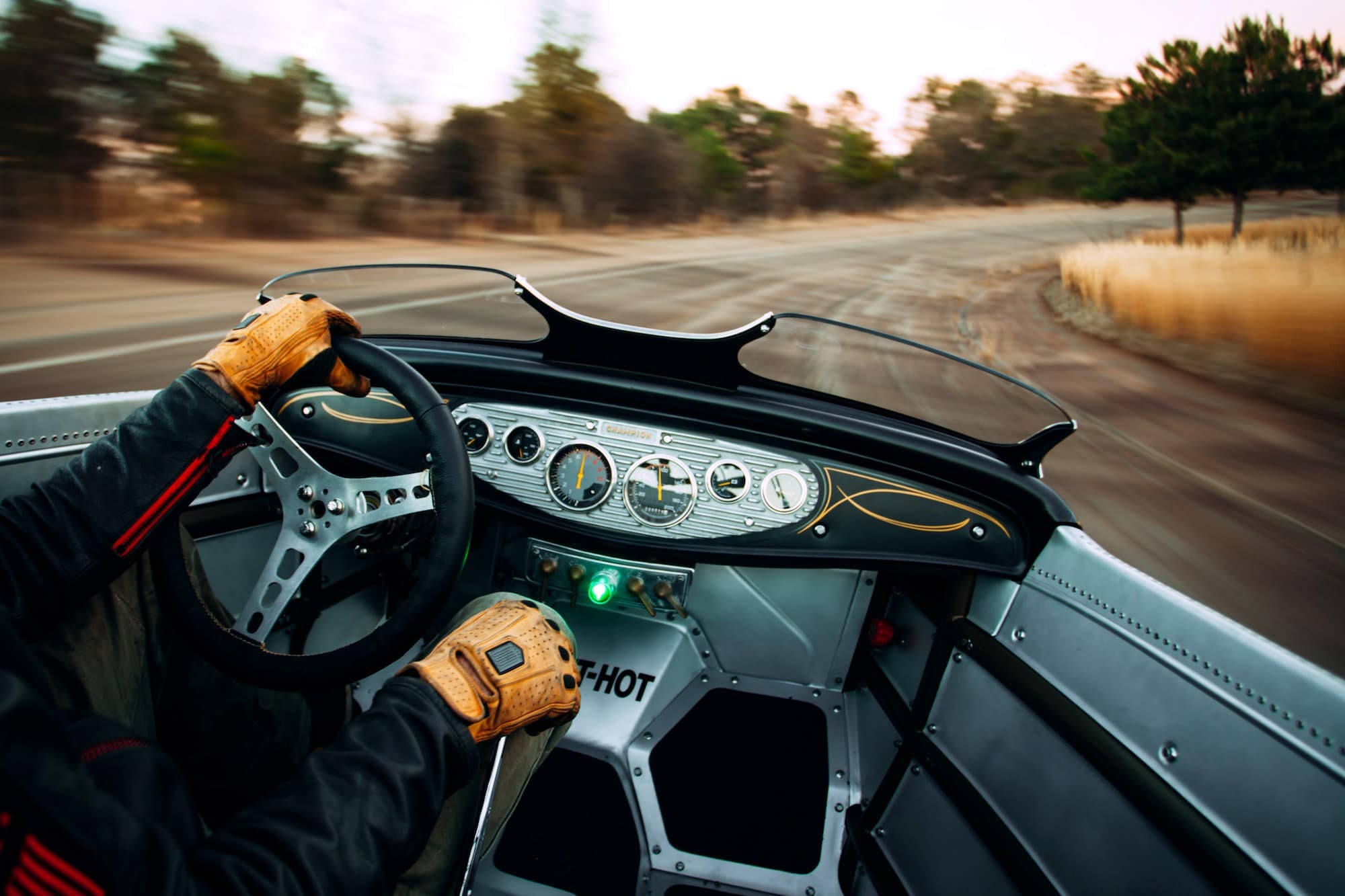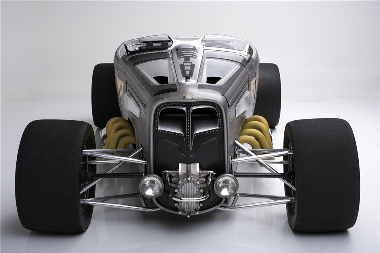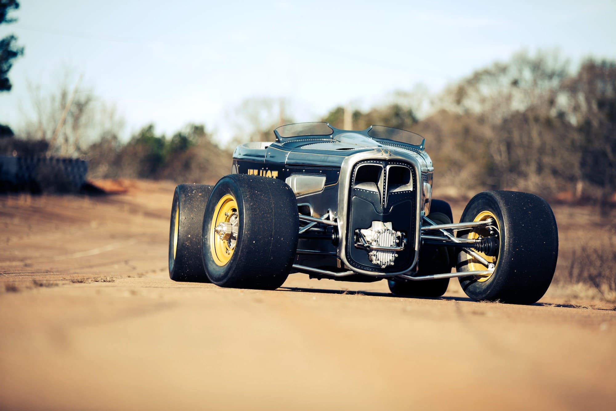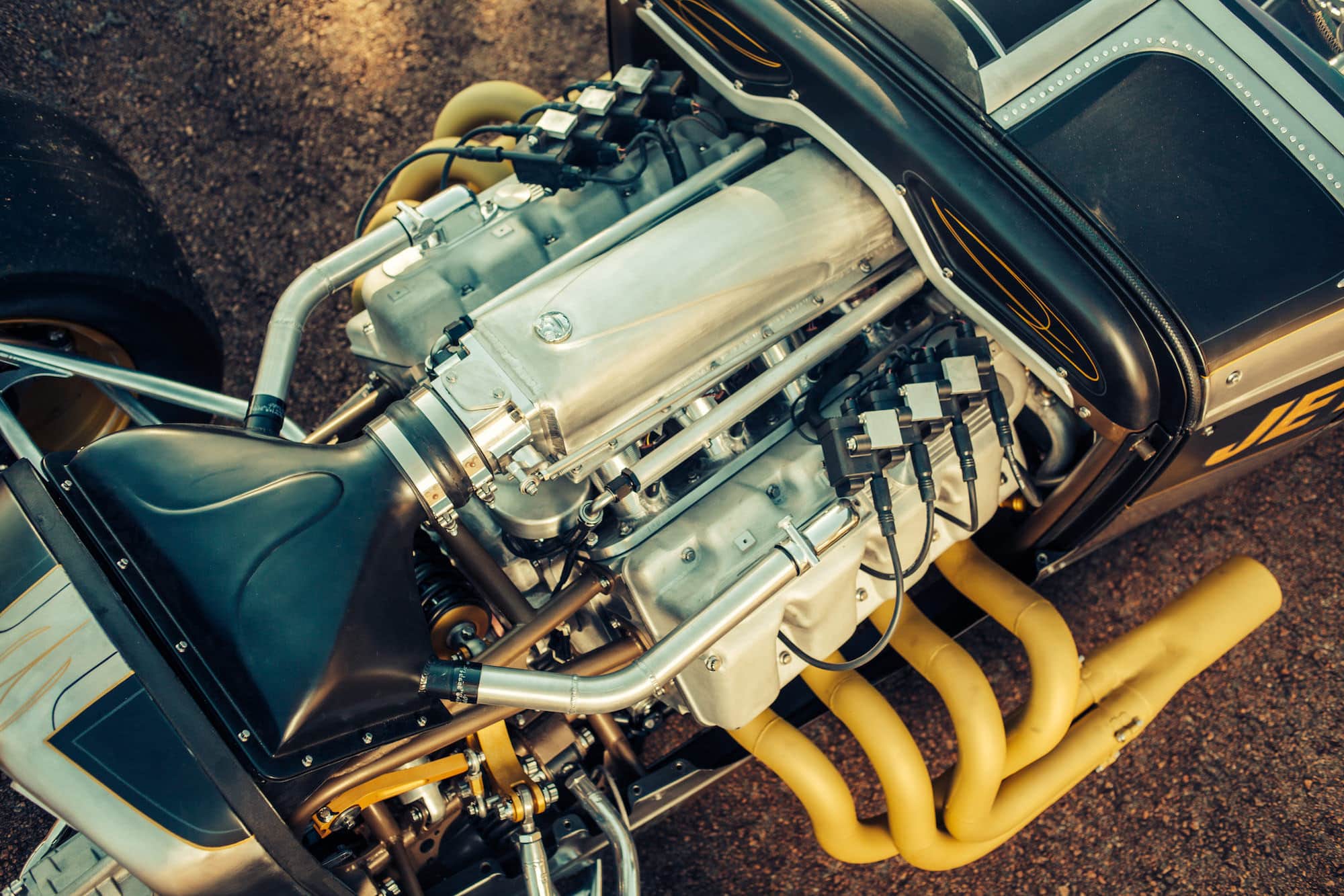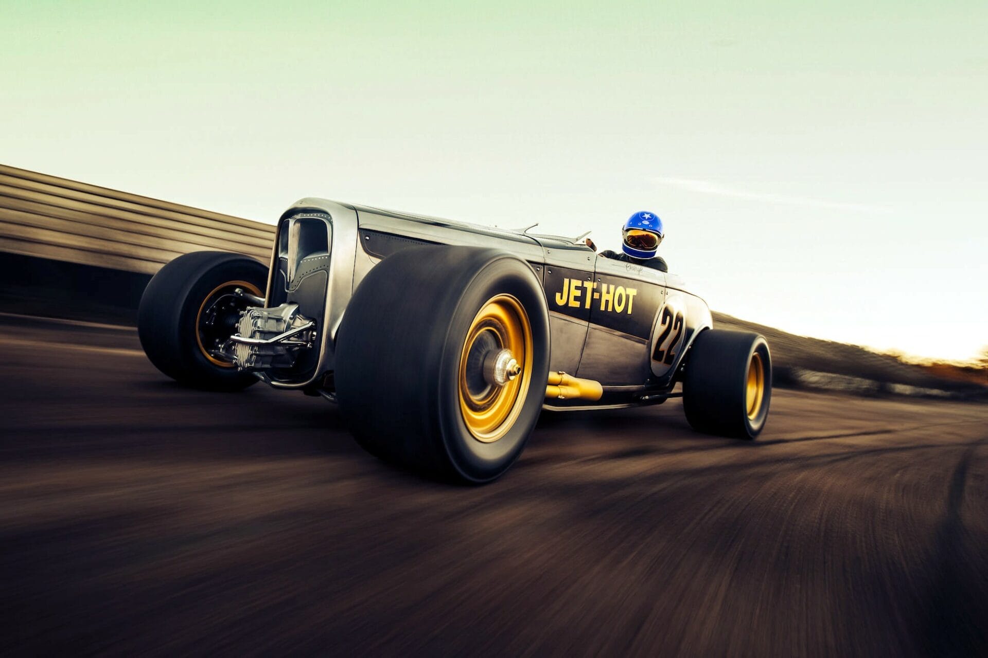 Il est temps d’en venir au Hot-Rod dont les photos (plus d’une trentaine) illustrent cet article. Bryan Fuller et son équipe ont développé un châssis qui s’adapte parfaitement à l’intérieur d’une carrosserie Ford ’32, ils l’ont ensuite motorisé d’un V8 John-Kaase-Boss de 576ci (9.400cc) préparé par Kurt Urban, développé une transmission AWD personnalisée et l’ont associée à une suspension dérivée de la course.