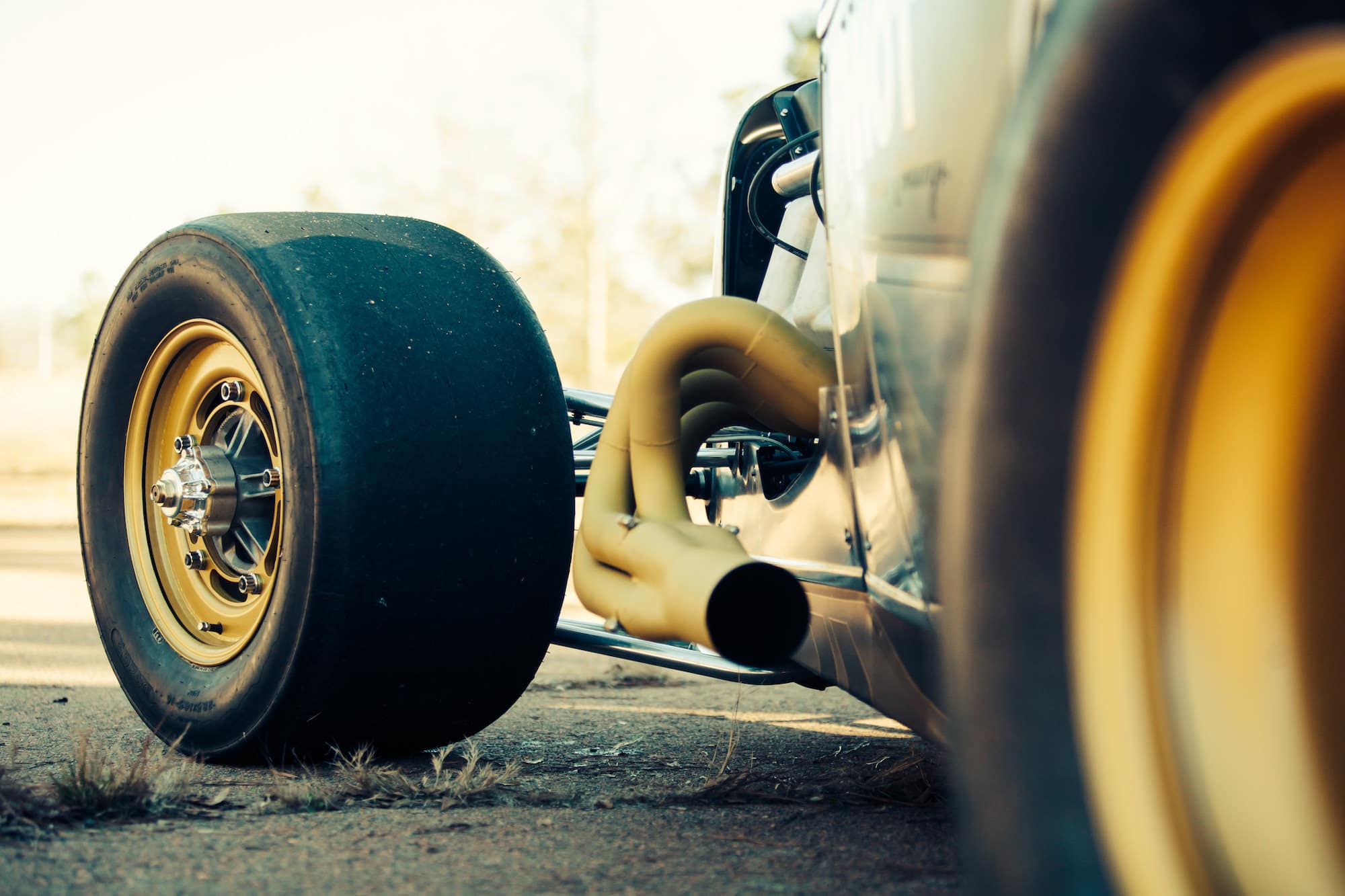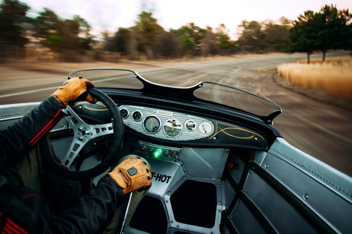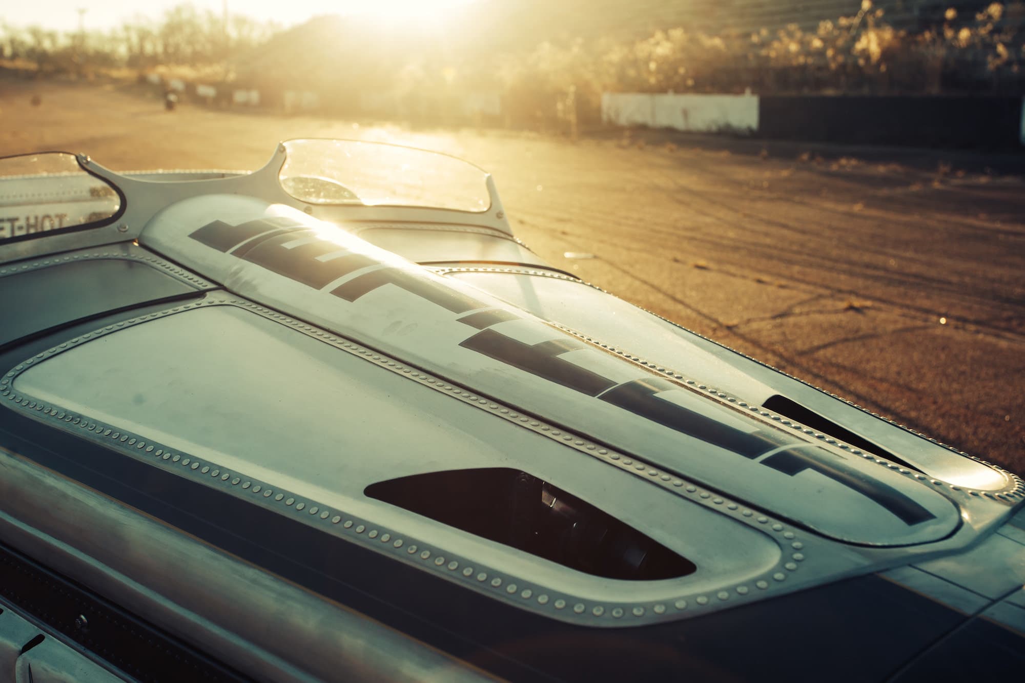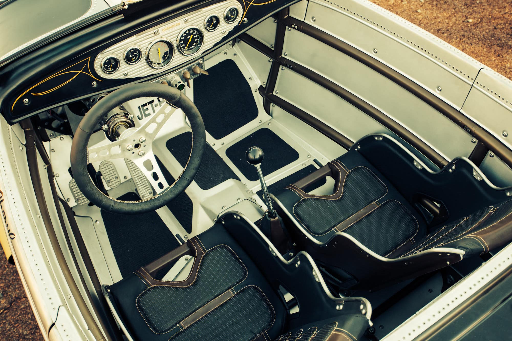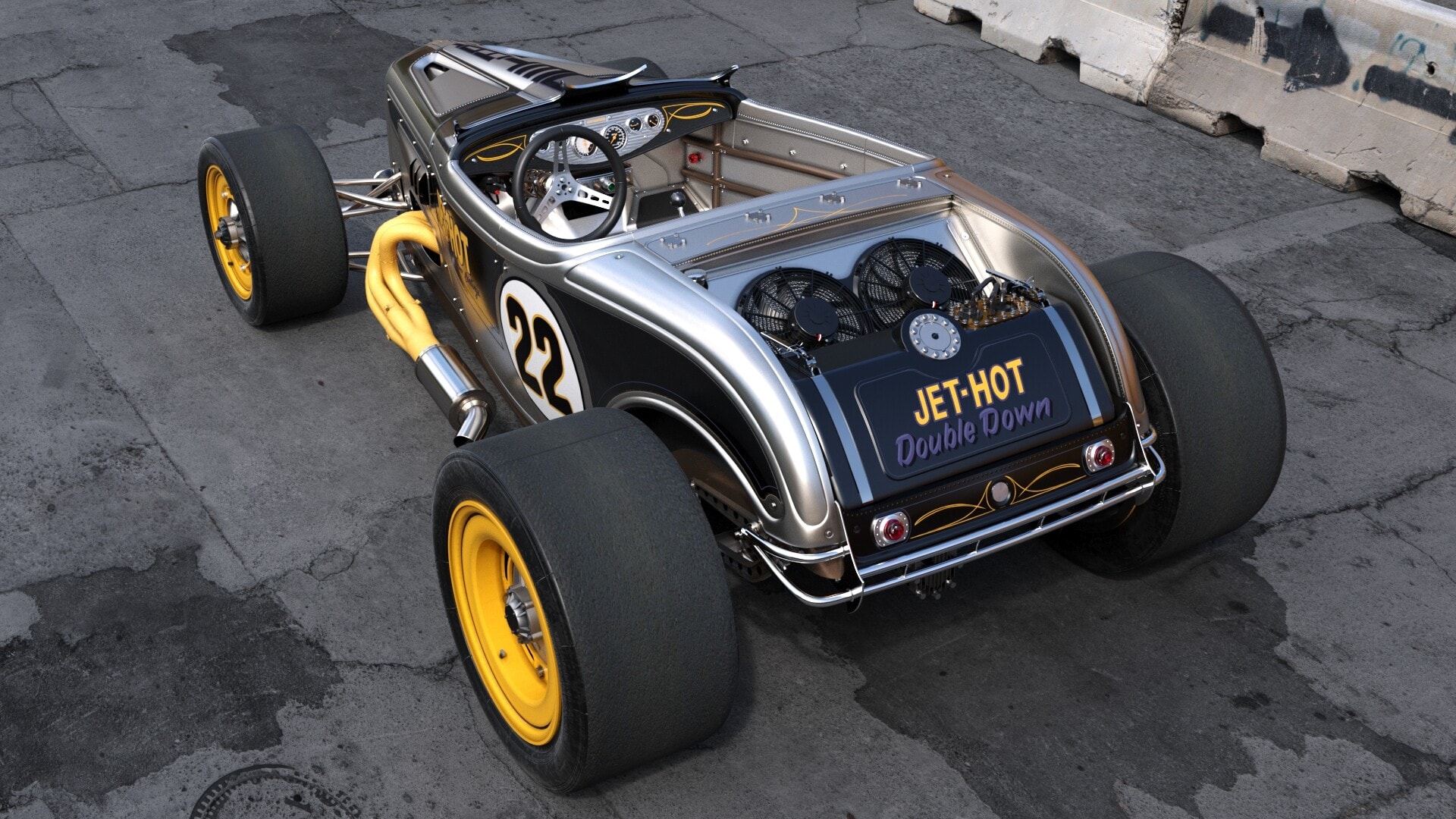 Afin d’obtenir les 825cv jusqu’à l’asphalte, le Hot-Rod a été équipé de jantes en aluminium “Real Racing” chaussées de pneus slicks de course “Goodyear” de 14 pouces de large ! Jet-Hot avait stipulé que ce Hot-Rod Double Down devait être capable de participer à des courses de rue, de dragsters-strips, d’auto- cross, et autres folies en ce compris, éventuellement, d’un voyage dans les marais salants de Bonneville pour une course de vitesse de pointe appropriée !