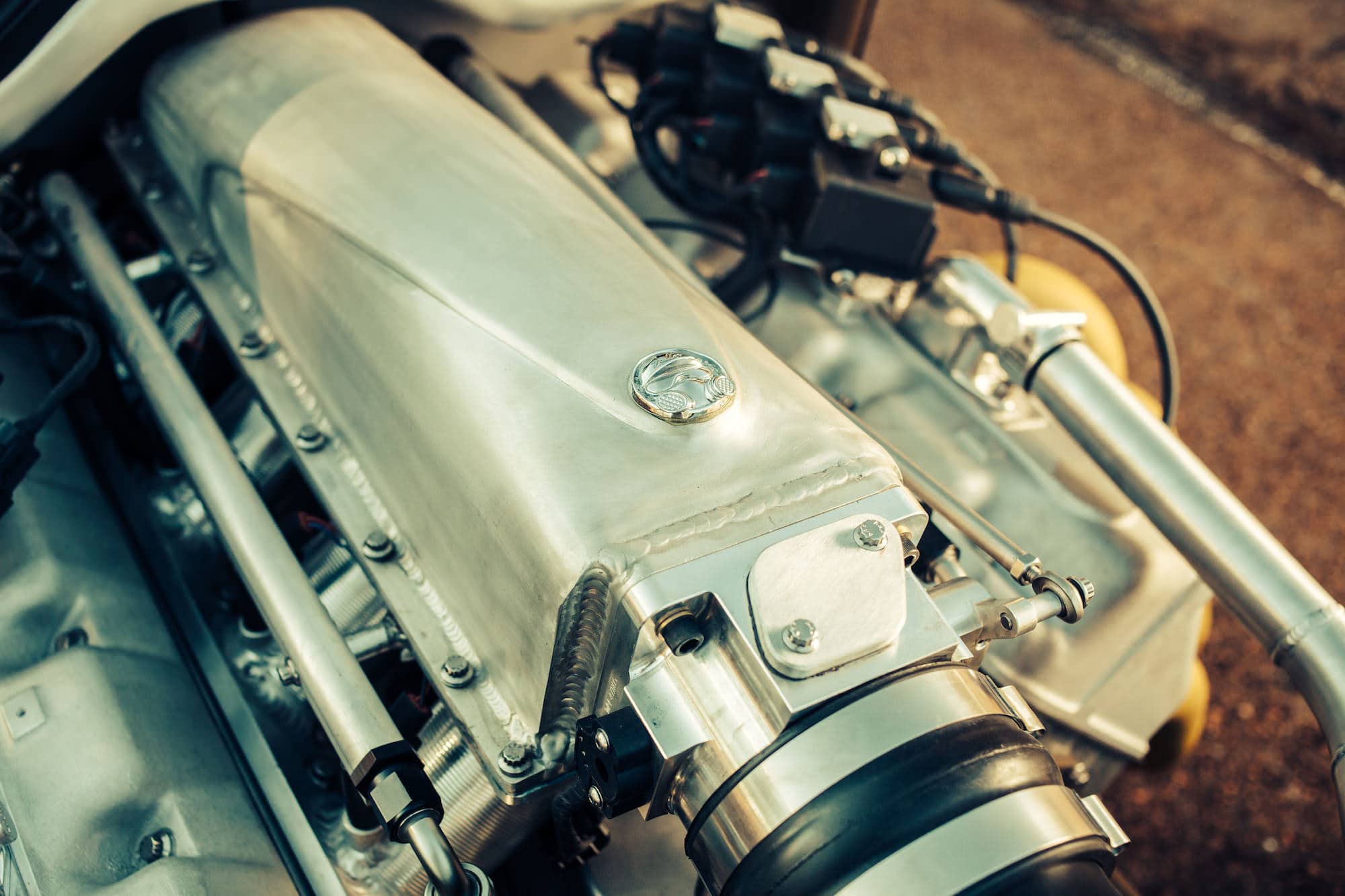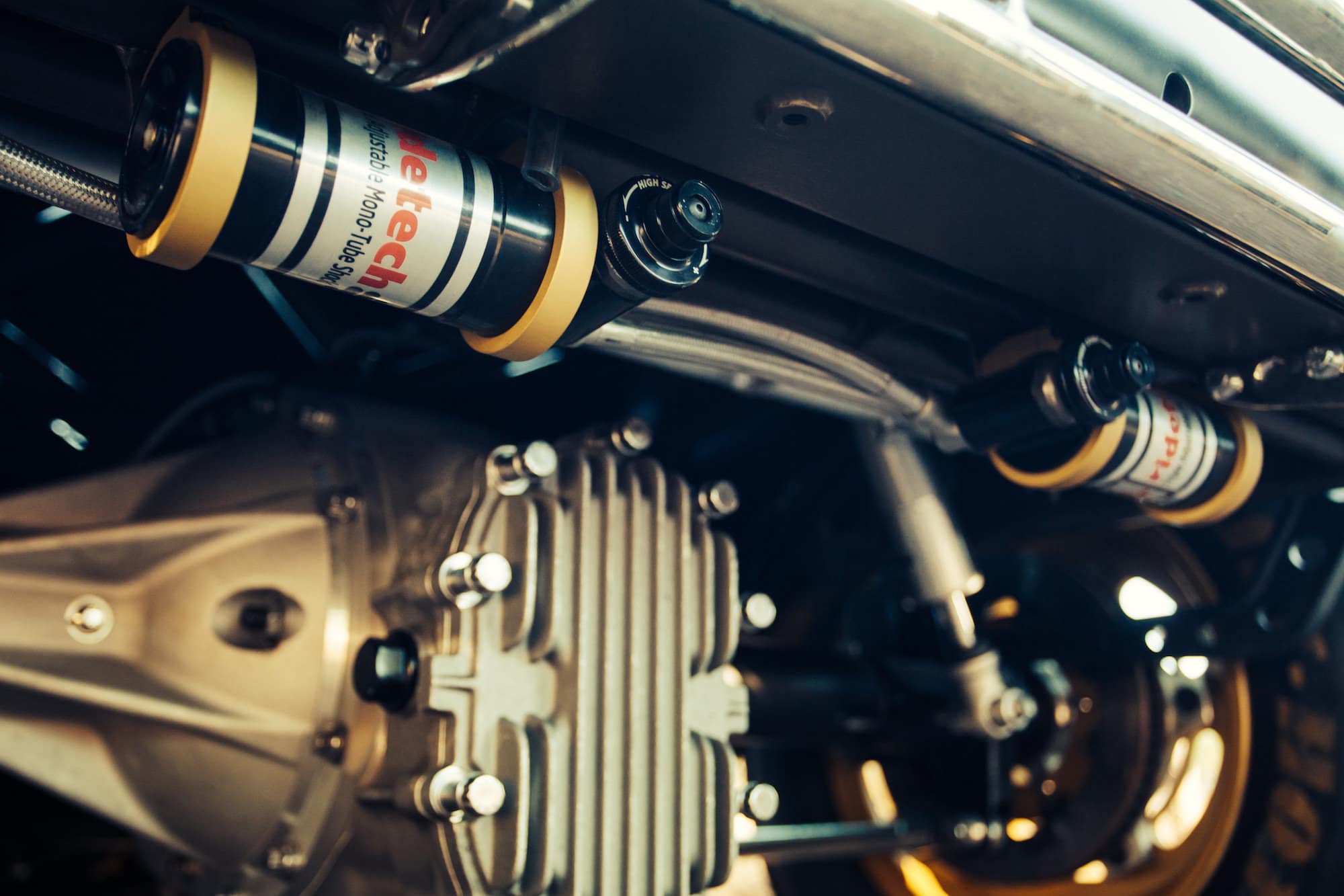 La traction intégrale est réalisée avec un Quickchange indépendant à l’avant, un Quickchange à quatre maillons à l’arrière, tandis qu’un boîtier de transfert en magnésium GM NP 149 positionne au “centre-milieu”. Tout cela est alimenté par une transmission G-Force 5 vitesses. En raison de la taille du moteur et de l’emplacement du Quickchange avant, le radiateur (de marque Griffin) a été installé à l’arrière. L’avant se caractérisant par les doubles prises d’air qui canalisent l’air dans le moteur de 9.400 cc.