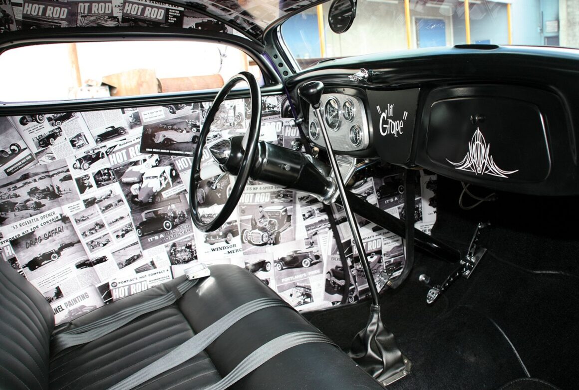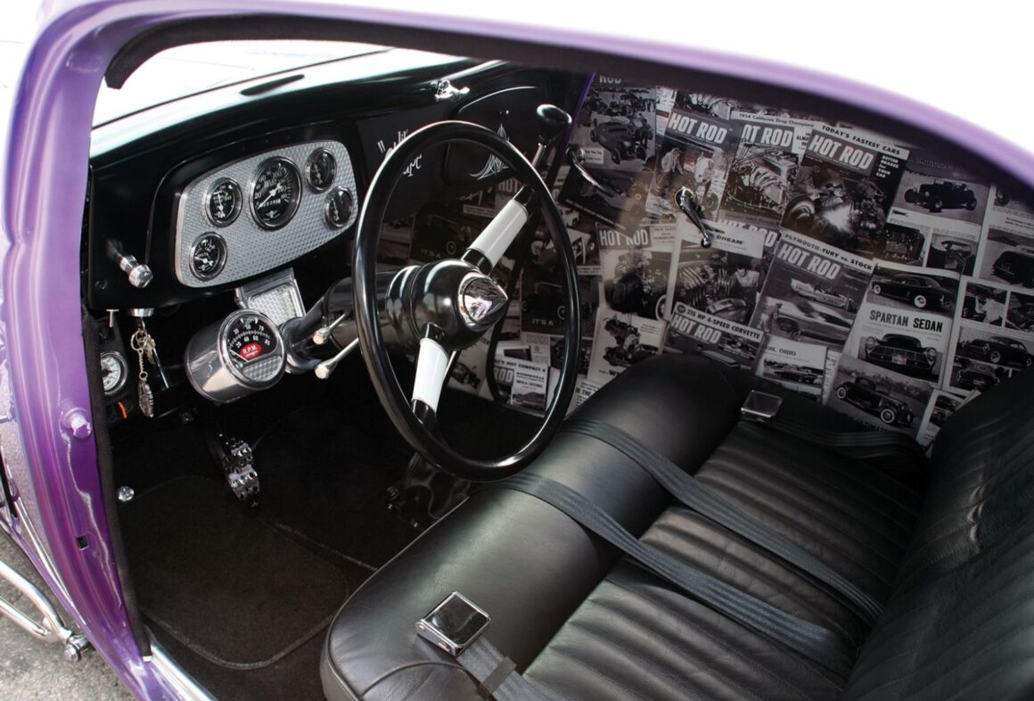 Sous le capot se cache un V8 Small Block Chevrolet (SBC), un choix que certains pourraient juger banal, mais qui est en réalité parfaitement cohérent avec l’esprit de Foxley : “Dans le monde des Hot Rod’s de Canada, l’important c’est la voiture, pas le moteur”… Foxley me précise que le choix du moteur a été déterminé par plusieurs facteurs : “Je m’étais fixé un délai assez court pour la construction et le châssis était déjà prévu pour un SBC. J’aime les moteurs traditionnels, mais en termes de rapport qualité-prix, rien ne vaut un SBC, et je connais bien ce moteur. De plus, j’avais déjà un V8 383ci (6,3 L) robuste dans mon atelier, et les SBC étaient disponibles au début des années ’60”... Pour résumer, Foxley estime que son Lil’Grape n’a pas besoin d’un moteur extravagant. Après une heure de route dans un paysage qui ressemblait à une carte postale sous stéroïdes, on estarrivé devant un garage isolé, battu par le vent. Foxley a ouvert la porte et fait rentrer son Hot Rod Ford’34 trois fenêtres, violet bonbon, brillant comme un bijou extraterrestre tombé dans la neige. Foxley a sourit et m’a dit : “Ouin, hein ? Ça, c’est pas un char. C’est une religion”… Foxley s’est alors appuyé sur l’aile du Hot Rod : “J’ai eu ça en 2008. Une coque de Ford ’34 pis un tas de pièces. J’ai échangé ma Pontiac ’55 pis ma Chevy ’55 pour ça. Les gens disaient que j’étais fou. Ils avaient pas tort. J’voulais un chop extrême, comme les Piersen Brothers pis Alex Xydias. Un coupé Lakes, mais poussé au maximum. J’ai coupé ça jusqu’à ce que je me demande si j’allais encore pouvoir m’asseoir dedans”.
