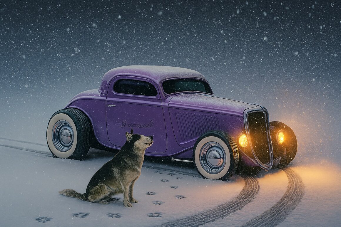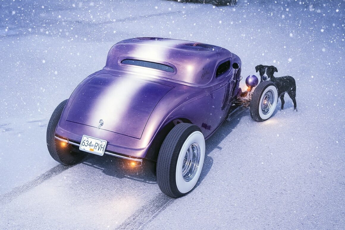 Il m’a alors montré la ligne du toit. : “C’est bas. Très bas… Pis mon Pat, la peinture… Ah ça, mon gars… c’est du Winfield pur. Gene Winfield. Le maître. Avant son décès en 2025, il m’a fait un fade comme y’en aura plus jamais. 50 couches de base. 10 couches de vernis. Des perles House of Kolor. Pis un peu de magie, j’pense”… Il a baissé la voix pour se confesser ; “La première version était laide en tabarnak. Un mélange de rose pis d’aubergine. Moi j’aimais pas ça. Lui, il trouvait ça réussi. On s’est obstinés. On a mélangé des couleurs. Pis bang : le Lil’Grape est né”… On senait la fierté dans sa voix et j’ai compris que ce Hot Rod n’était pas juste une machine. C’était une histoire. Foxley m’a alors lancé les clés : “Monte. Patrice. On va rouler”… Le moteur SBC a démarré avec un rugissement qui faisait vibrer la neige. On est parti sur une route blanche, droite, infinie. Foxley parlait fort pour couvrir le bruit du V8 : “Le moteur, c’est un SBC. Simple. Fiable. Il démarre même à –40. Les Français aiment ça compliqué. Nous autres, on veut que ça roule”… J’ai commencé à comprendre l’esprit du pays. Soudain, un caribou a traversé. Foxley a crié, hurlé : “TABARNAK, REGARDE DEVANT !”... Le caribou nous a regardé passer comme si on était un documentaire. Foxley m’a regardé avec un sourire dangereux. J’ai senti mon âme quitter mon corps. Le Hot Rod tremblait. Le moteur grondait. La neige tombait… “OK, mon Pat’ là, pèse su’l gaz… mais pas trop… juste assez”... Le Hot Rod a bondit comme un lynx sous Red Bull. À partir d’ici, la réalité s’est déchirée…. Le joual a explosé. La logique est morte.