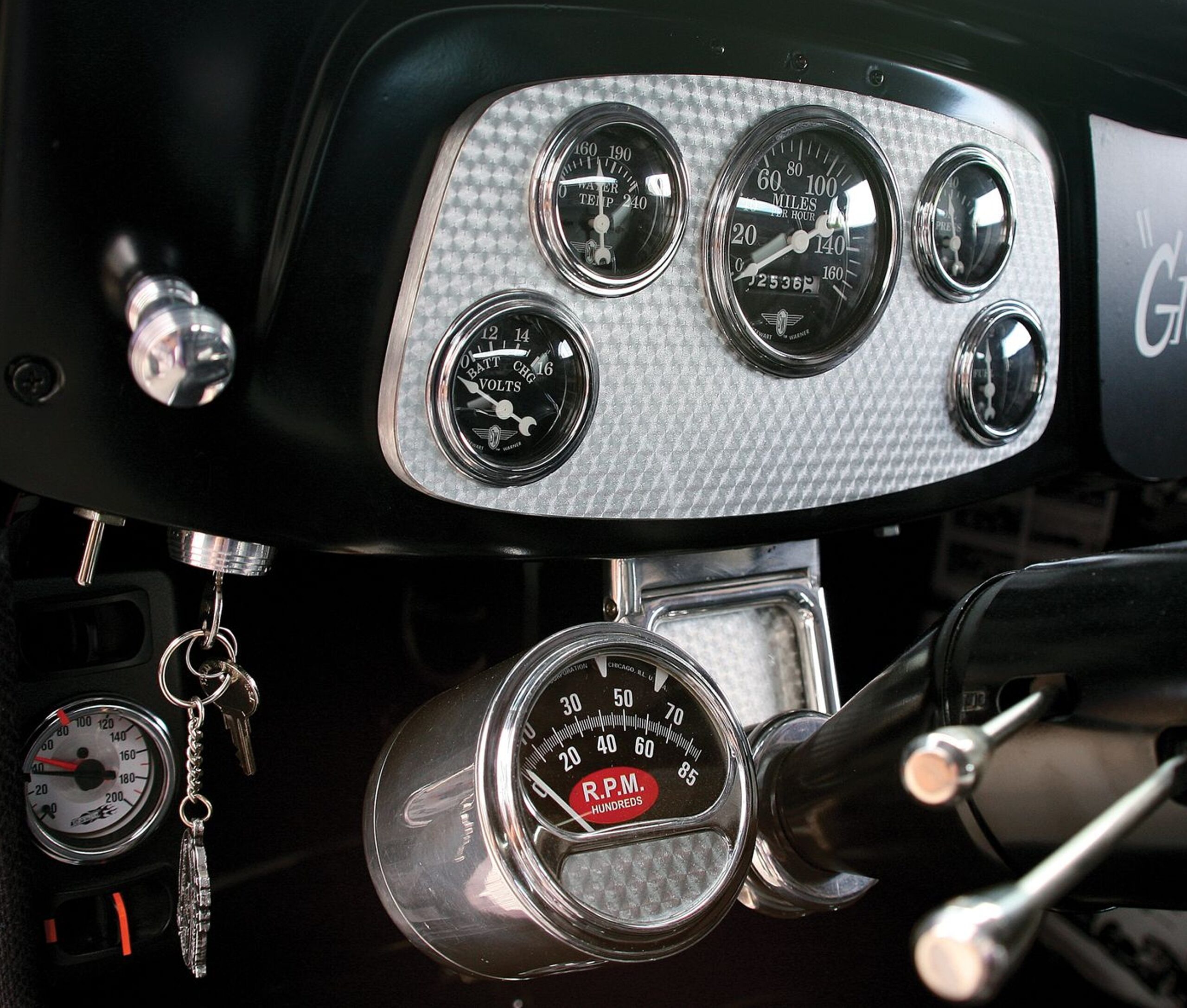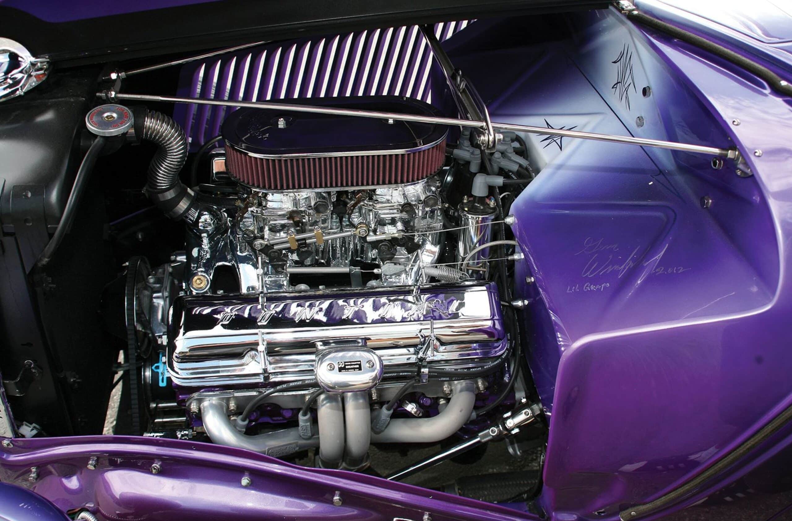 Sous le capot se cache un V8 Small Block Chevrolet (SBC), un choix que certains pourraient juger banal, mais qui est en réalité parfaitement cohérent avec l’esprit de Foxley : “Dans le monde des Hot Rod’s de Canada, l’important c’est la voiture, pas le moteur”… Foxley me précise que le choix du moteur a été déterminé par plusieurs facteurs : “Je m’étais fixé un délai assez court pour la construction et le châssis était déjà prévu pour un SBC. J’aime les moteurs traditionnels, mais en termes de rapport qualité-prix, rien ne vaut un SBC, et je connais bien ce moteur. De plus, j’avais déjà un V8 383ci (6,3 L) robuste dans mon atelier, et les SBC étaient disponibles au début des années ’60”... Pour résumer, Foxley estime que son Lil’Grape n’a pas besoin d’un moteur extravagant. Après une heure de route dans un paysage qui ressemblait à une carte postale sous stéroïdes, on estarrivé devant un garage isolé, battu par le vent. Foxley a ouvert la porte et fait rentrer son Hot Rod Ford’34 trois fenêtres, violet bonbon, brillant comme un bijou extraterrestre tombé dans la neige. Foxley a sourit et m’a dit : “Ouin, hein ? Ça, c’est pas un char. C’est une religion”… Foxley s’est alors appuyé sur l’aile du Hot Rod : “J’ai eu ça en 2008. Une coque de Ford ’34 pis un tas de pièces. J’ai échangé ma Pontiac ’55 pis ma Chevy ’55 pour ça. Les gens disaient que j’étais fou. Ils avaient pas tort. J’voulais un chop extrême, comme les Piersen Brothers pis Alex Xydias. Un coupé Lakes, mais poussé au maximum. J’ai coupé ça jusqu’à ce que je me demande si j’allais encore pouvoir m’asseoir dedans”.