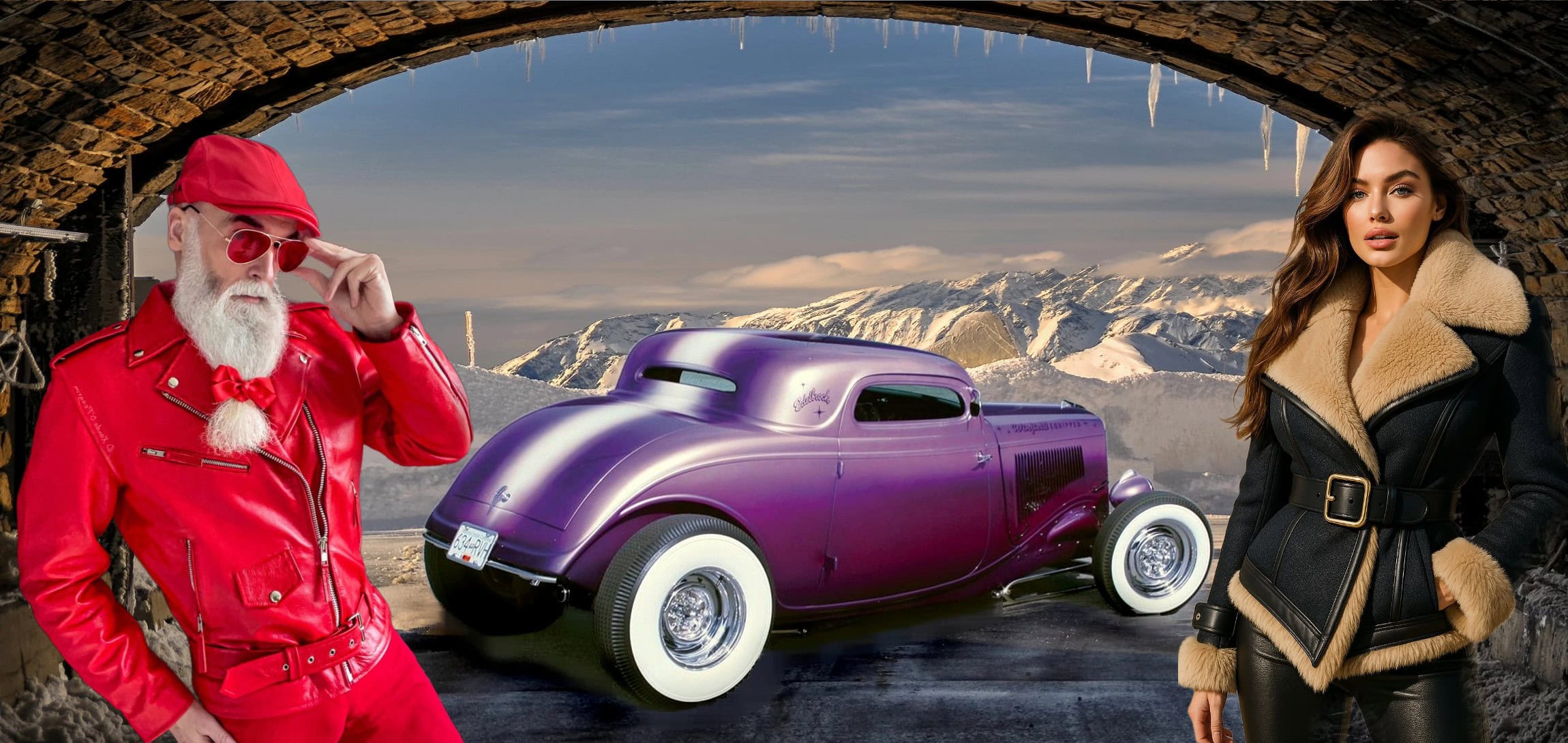 Il m’a alors montré la ligne du toit. : “C’est bas. Très bas… Pis mon Pat, la peinture… Ah ça, mon gars… c’est du Winfield pur. Gene Winfield. Le maître. Avant son décès en 2025, il m’a fait un fade comme y’en aura plus jamais. 50 couches de base. 10 couches de vernis. Des perles House of Kolor. Pis un peu de magie, j’pense”… Il a baissé la voix pour se confesser ; “La première version était laide en tabarnak. Un mélange de rose pis d’aubergine. Moi j’aimais pas ça. Lui, il trouvait ça réussi. On s’est obstinés. On a mélangé des couleurs. Pis bang : le Lil’Grape est né”… On senait la fierté dans sa voix et j’ai compris que ce Hot Rod n’était pas juste une machine. C’était une histoire. Foxley m’a alors lancé les clés : “Monte. Patrice. On va rouler”… Le moteur SBC a démarré avec un rugissement qui faisait vibrer la neige. On est parti sur une route blanche, droite, infinie. Foxley parlait fort pour couvrir le bruit du V8 : “Le moteur, c’est un SBC. Simple. Fiable. Il démarre même à –40. Les Français aiment ça compliqué. Nous autres, on veut que ça roule”… J’ai commencé à comprendre l’esprit du pays. Soudain, un caribou a traversé. Foxley a crié, hurlé : “TABARNAK, REGARDE DEVANT !”... Le caribou nous a regardé passer comme si on était un documentaire. Foxley m’a regardé avec un sourire dangereux. J’ai senti mon âme quitter mon corps. Le Hot Rod tremblait. Le moteur grondait. La neige tombait… “OK, mon Pat’ là, pèse su’l gaz… mais pas trop… juste assez”... Le Hot Rod a bondit comme un lynx sous Red Bull. À partir d’ici, la réalité s’est déchirée…. Le joual a explosé. La logique est morte.