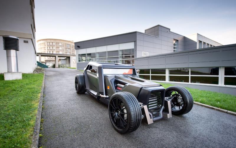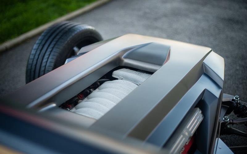Lorsque j’ai parlé à Anthony, un enseignant de l’ESPERA Sbarro, il m’a expliqué que presque tous les groupes motopropulseurs utilisés dans les projets des étudiants proviennent d’épaves de voitures qui, autrement, seraient jetées. Pour le budget relativement faible de ces constructions, c’est tout à fait logique. Mais donner une nouvelle vocation à ces moteurs, c’est incroyablement cool. Avec l’extrémité avant du concept EIGHT bourrée de l’intercooler, le V8 aspire de l’air frais à travers des écopes en aluminium situées en dessous, dont les filtres à air se trouvent de chaque côté de la voiture. Il expire par l’intermédiaire d’échappements latéraux personnalisés fixés directement aux turbos, de sorte que le son n’est qu’une violence pure et non diluée, crachant de grandes quantités de carburant non brûlé et produisant des flammes sur le dépassement. En l’absence de toit ou de vitres scellées sur l’EIGHT, vous pouvez entendre le V8 hurlant et les turbos sifflants plus clairement que jamais lorsque vous tirez dessus, pneus arrière en feu (Michelin Pilot Sports 245/40ZR19 AV et Bridgestone Potenza RE050A 305/35ZR20 AR montés sur jantes OZ Racing Ultraleggera)…