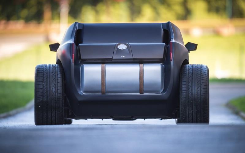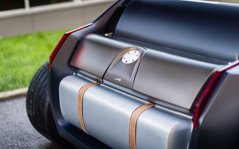 Avec chaque modèle, les élèves essaient d’expérimenter avec les matériaux et les constructions. C’est la première fois que je vois du plastique renforcé de fibres naturelles. Certains composants de l’EIGHT, tels que le boîtier du rétroviseur extérieur, utilisent du lin comme base qui est incrustée dans la résine. L’une des choses que j’aime vraiment à propos de l’école de design, c’est la façon dont elle implique non seulement les étudiants actuels qui travaillent sur le projet, mais aussi les anciens élèves. Composites 21 est une entreprise fondée par deux anciens étudiants de l’ESPERA Sbarro, spécialisée dans le travail du composite et du cuir. Ils ont fait toute la sellerie à l’intérieur du concept EIGHT. Le réservoir de carburant repose sous un capot en fibre de verre à l’arrière de la voiture et une partie du boîtier est maintenue par des sangles en cuir de la même finition que les sièges. Des dalles de plexiglas coloré avec des LED intégrées à l’intérieur agissent comme des blocs de feux arrière à l’aspect futuriste. Dans le petit espace le long des côtés du nez se trouvent des bandes de plastique translucide, sous lesquelles se trouvent des LED qui agissent comme des phares.