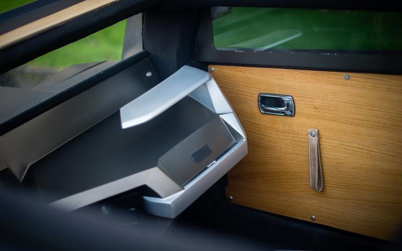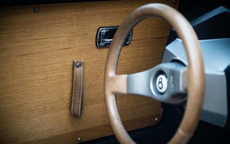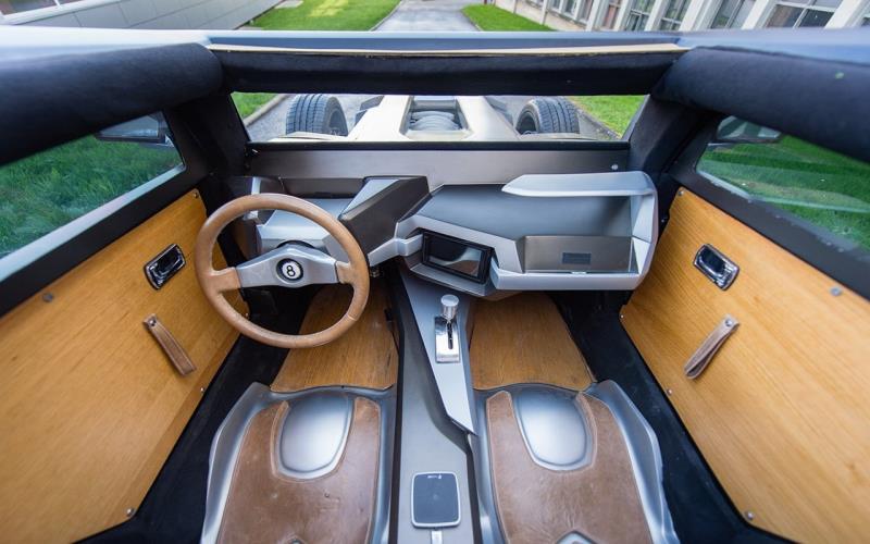 L’école de design travaille avec AVO depuis près d’une décennie et est donc bien consciente des délais d’exécution de ces projets fous. À l’intérieur, c’est une autre histoire. Les panneaux de porte, par exemple, sont fabriqués en bois véritable avec des sangles de traction en cuir au lieu de poignées conventionnelles. À l’instar de la Sbarro Grand Prix, les sièges de l’EIGHT sont des bases en fibre de verre recouvertes d’un rembourrage asymétrique en cuir cousu main qui remplace les coussins d’assise. Il n’y a pas beaucoup d’isolation des éléments dans l’habitacle, qui est un mélange de fibre de verre, de cuir et de bois. Les vitres latérales fixes et le pare-brise sont en plexiglas haute résistance. Comme il se doit, le volant est une unité personnalisée recouverte de cuir avec une boule Magic 8 au milieu. Comme cette voiture a été conçue dans le cadre d’un cocktail de démonstration technologique par Orange, il y a des supports sur le tableau de bord pour les tablettes qui peuvent être utilisés pour la télémétrie, la navigation et le divertissement. Et cette petite boîte noire au milieu est un chargeur à induction pour appareils mobiles. L’aspect haché des hot rods classiques a été conservé, bien que dans une configuration extrêmement inclinée.