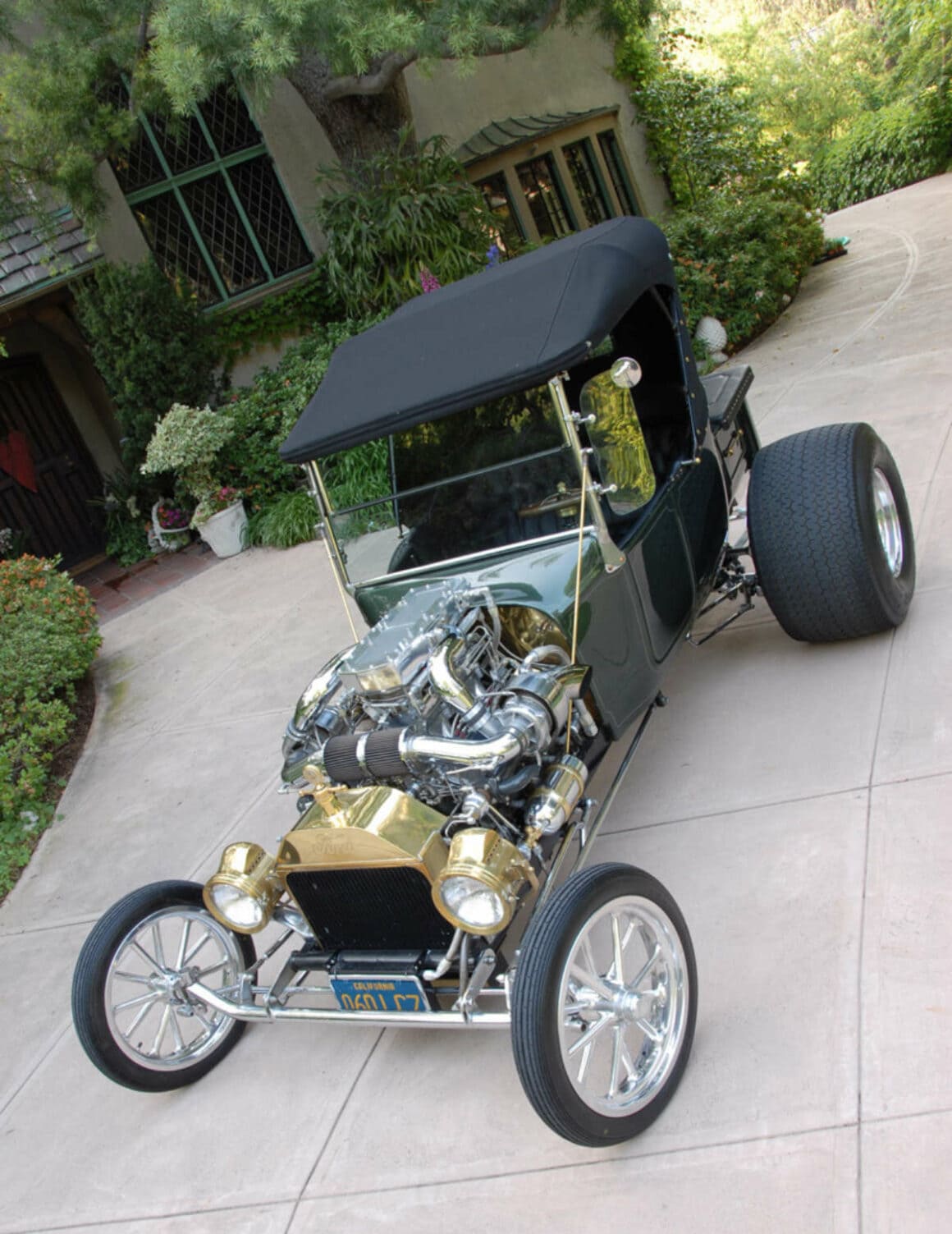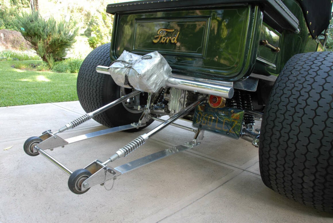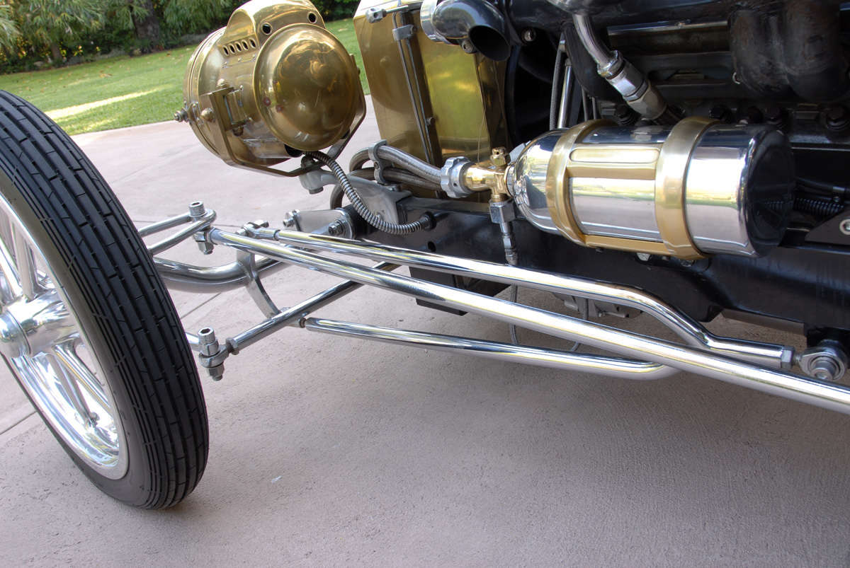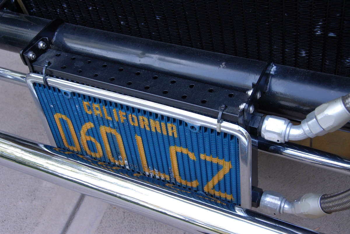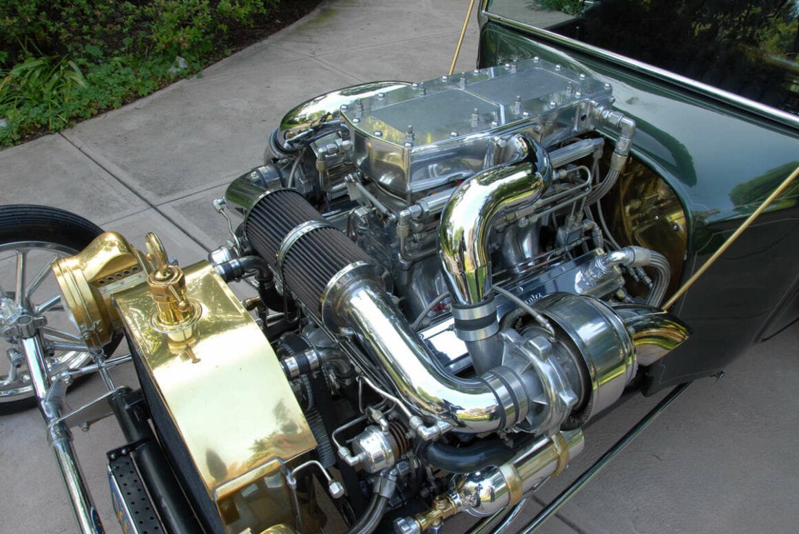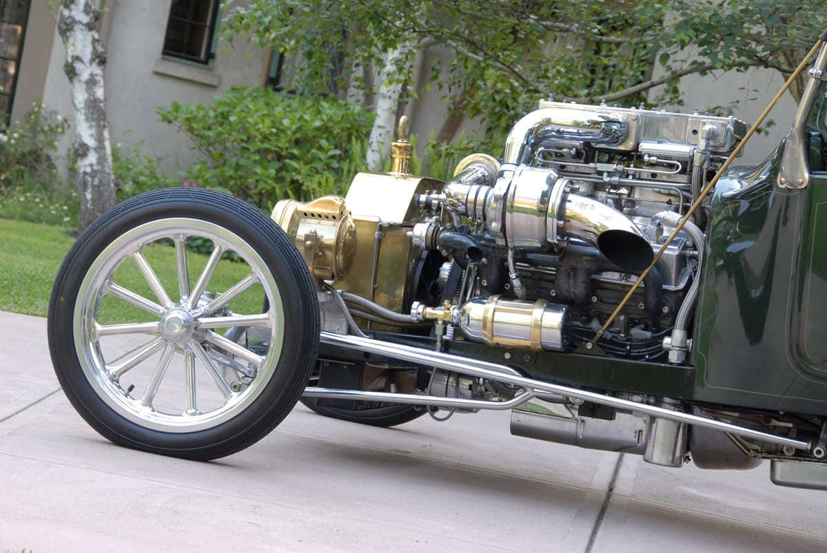 Un refroidisseur d’huile y aide, intelligemment peint pour ressembler à une plaque d’immatriculation. Lee a également encastré le pare-feu et découpé la porte passager dans la baignoire en fibre de verre de ce Rod repro ’23 T. Auparavant, le V8 Chevrolet ’78 355ci de Sklar était armé d’un compresseur 6-71 surmonté de quatre carbus DCOE 45 Weber. Banks Power a modernisé ce broyeur pour le T avec un allumage Unilite et un Accel EFI. Même avec le réglage informatisé, vous ne pouvez pas repérer l’électronique tout de suite, car le voyant du moteur de contrôle et le port de l’ordinateur portable sont cachés sous le siège en peluche.