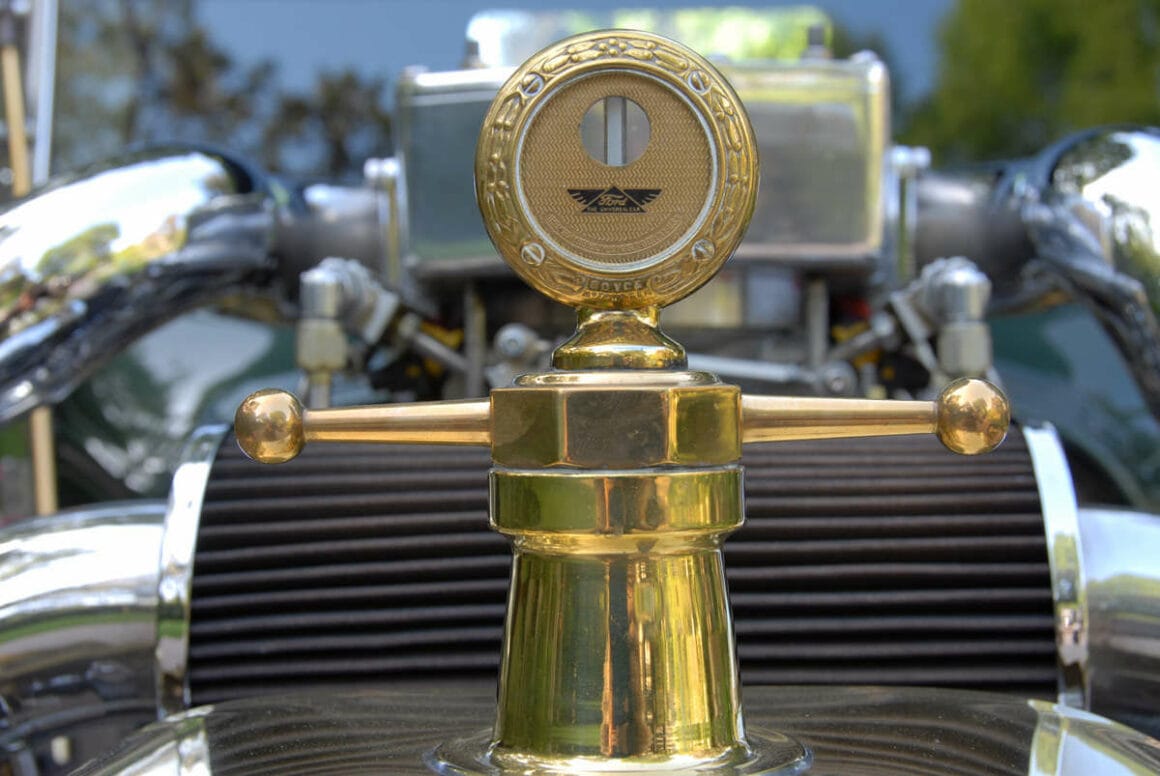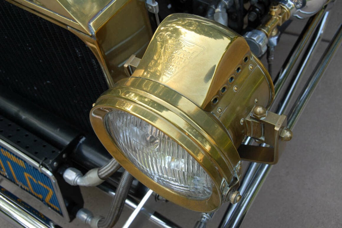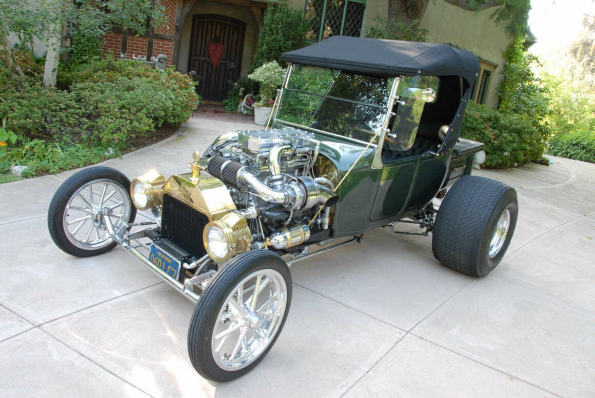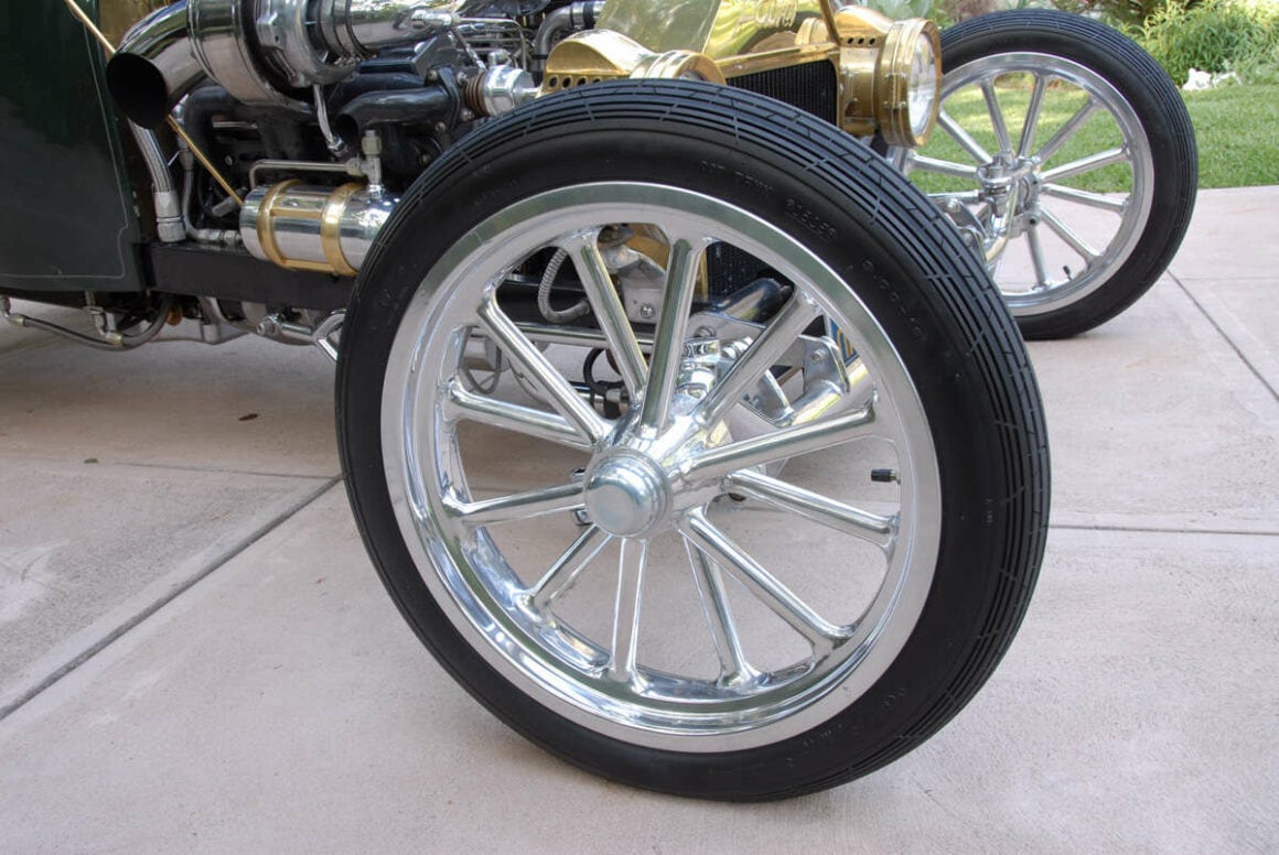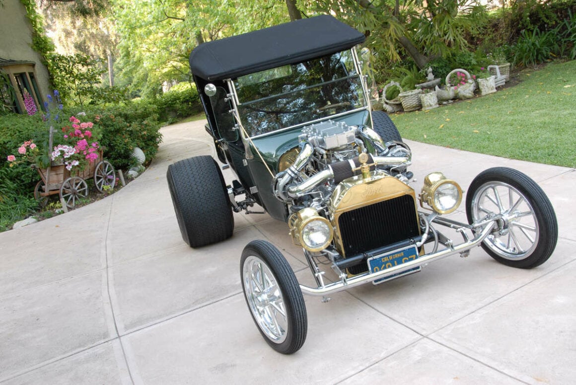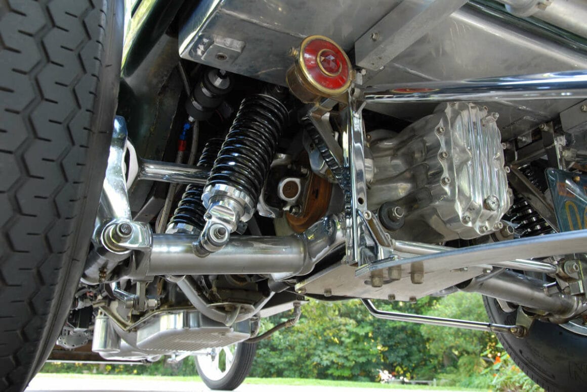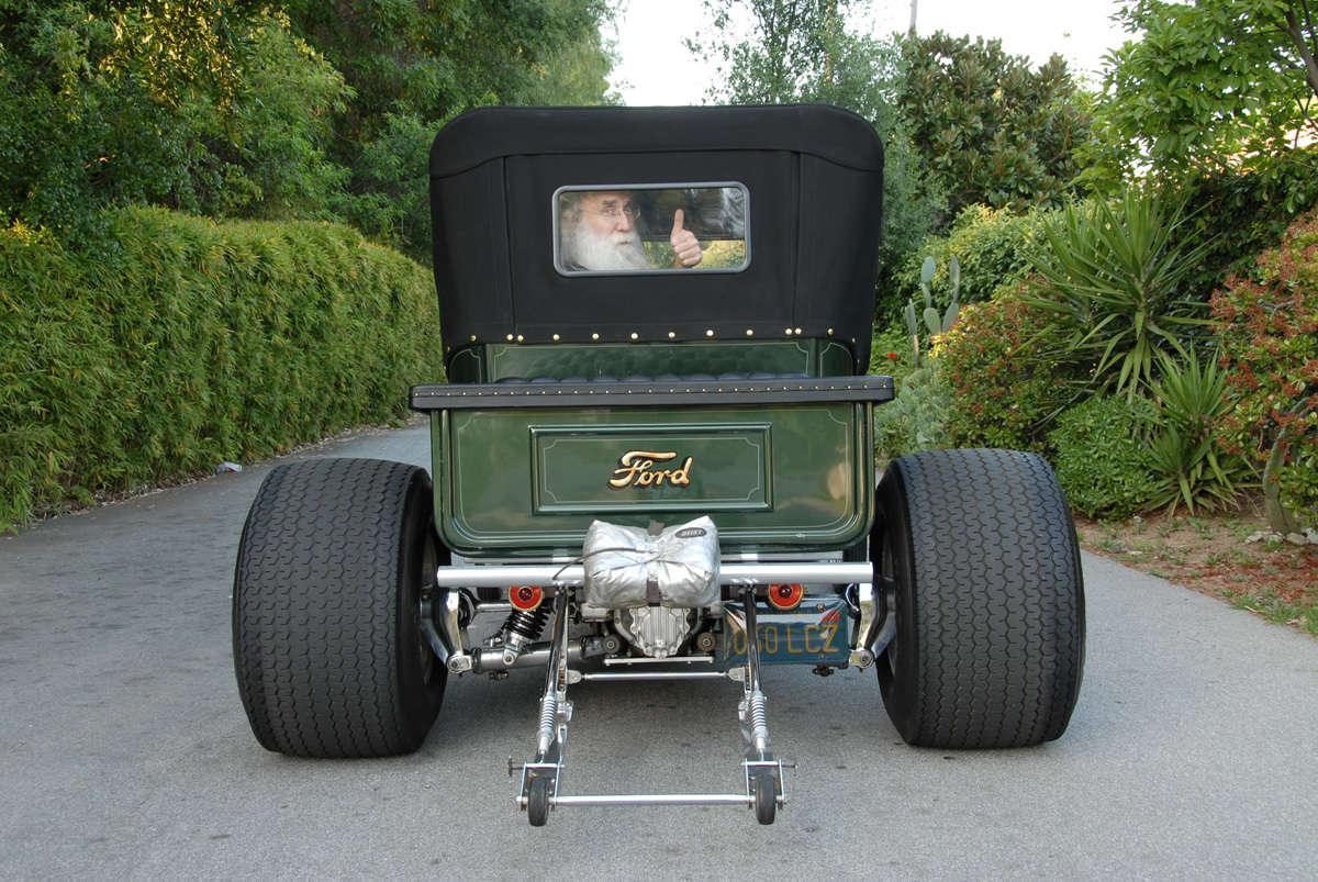 Un refroidisseur d’huile y aide, intelligemment peint pour ressembler à une plaque d’immatriculation. Lee a également encastré le pare-feu et découpé la porte passager dans la baignoire en fibre de verre de ce Rod repro ’23 T. Auparavant, le V8 Chevrolet ’78 355ci de Sklar était armé d’un compresseur 6-71 surmonté de quatre carbus DCOE 45 Weber. Banks Power a modernisé ce broyeur pour le T avec un allumage Unilite et un Accel EFI. Même avec le réglage informatisé, vous ne pouvez pas repérer l’électronique tout de suite, car le voyant du moteur de contrôle et le port de l’ordinateur portable sont cachés sous le siège en peluche.