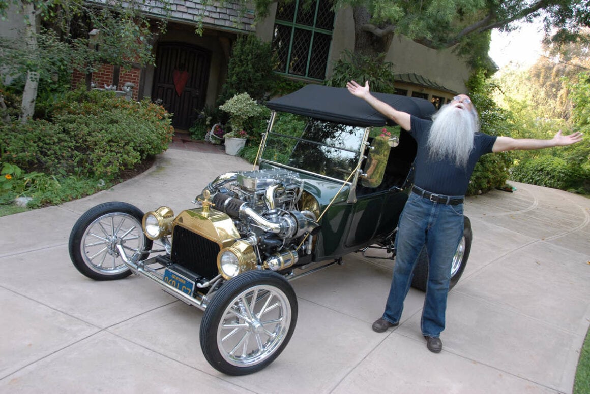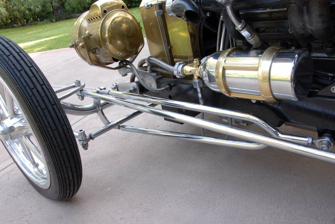 Faut être cinglé pour apprécier ! J’adore ! Ce Hot-Rod T’Bucket n’est pas seulement un chef-d’œuvre de puissance de force brute, mais c’est également une œuvre d’art en sa multitude de pièces uniques en aluminium poli et en laiton, et au refroidisseur de transmission monté à l’avant qui est peint pour ressembler à la plaque d’immatriculation californienne réelle. Le châssis de ce flyer flexible ne pèse qu’un peu plus qu’une croustille. À l’avant, il est habillé d’épingles à cheveux et de jantes Radir réservées à la course. (Mais pas de freins, conformément au dicton du vieux rodder : “Vous savez d’abord comment aller vite, puis vous vous inquiétez de vous arrêter”.). À l’arrière, le pont Jaguar V12 est amorti par des TCI et habillé d’un couvercle Quick-Change de Mr. Roadster.
