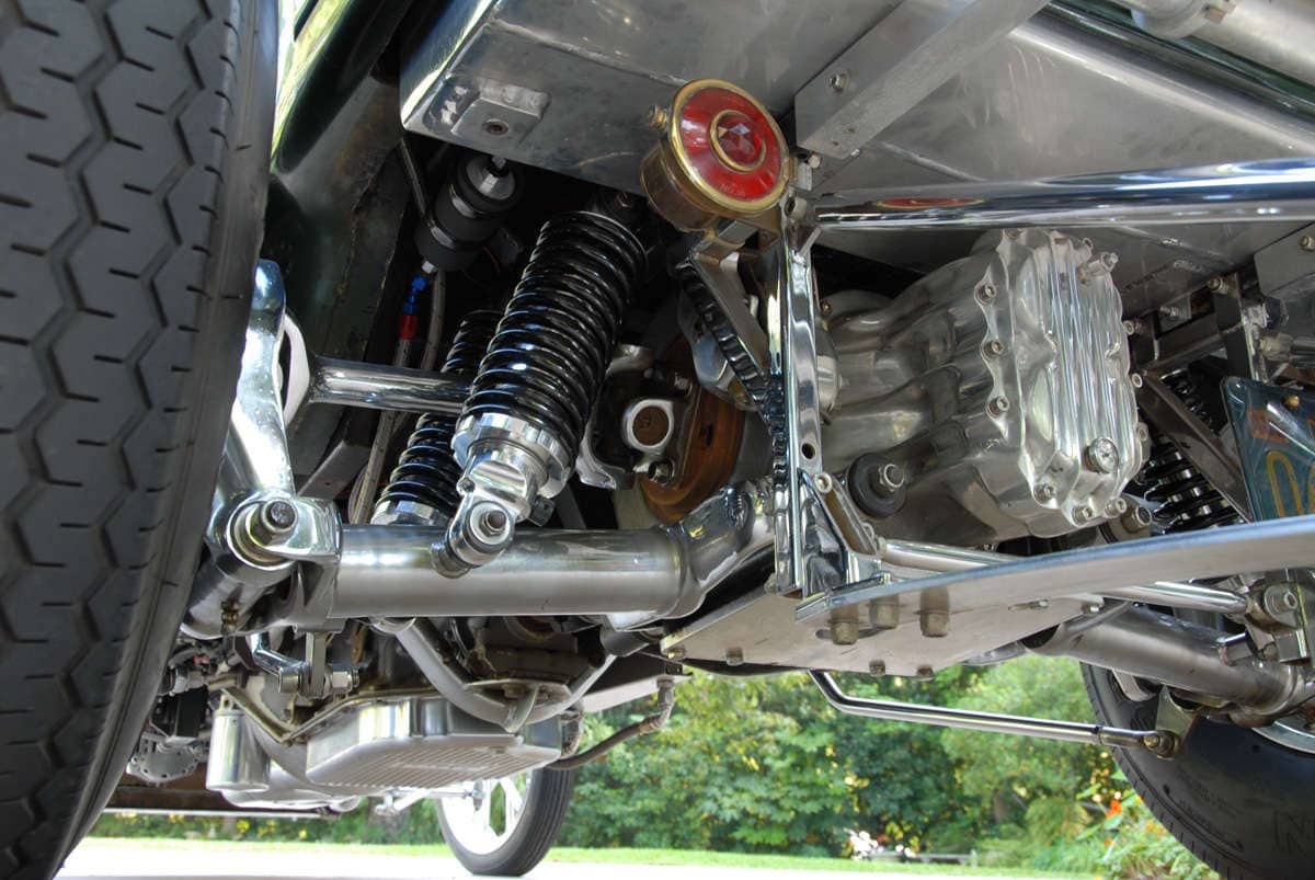Alors que les Hot-Rods et la grande puissance sont généralement synonymes, le T ’23 de Lee est plus moteur que voiture. Bénéficiant d’un petit bloc 350ci biturbocompressé performant qui dépose une puissance à peine contrôlable de 900CV sur la chaussée, il n’y a rien pour retenir cette bête. Le taux de compression du moteur n’est que de 7,5: 1, donc à 15 psi de boost, le moteur performant 350ci agit davantage comme un moteur de 700ci… Si ce potentiel de puissance n’est pas assez effrayant, ces chiffres peuvent passer au niveau suivant, car le moteur peut être alimenté en bouteille (sic !) avec une explosion injectée d’oxyde nitrique. La puissance est canalisée par une transmission automatique Turbo 400 et un pont arrière de Jaguar V12 d’un rapport de 4.10 Dana. Les freins à disque font de leur mieux pour ralentir le monstre. Il n’y a pas de freins avant pour le fun de l’esthétique…