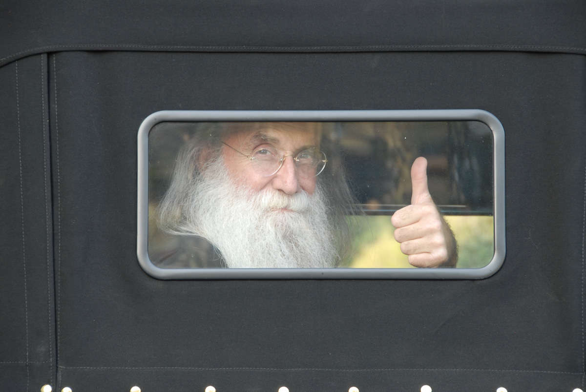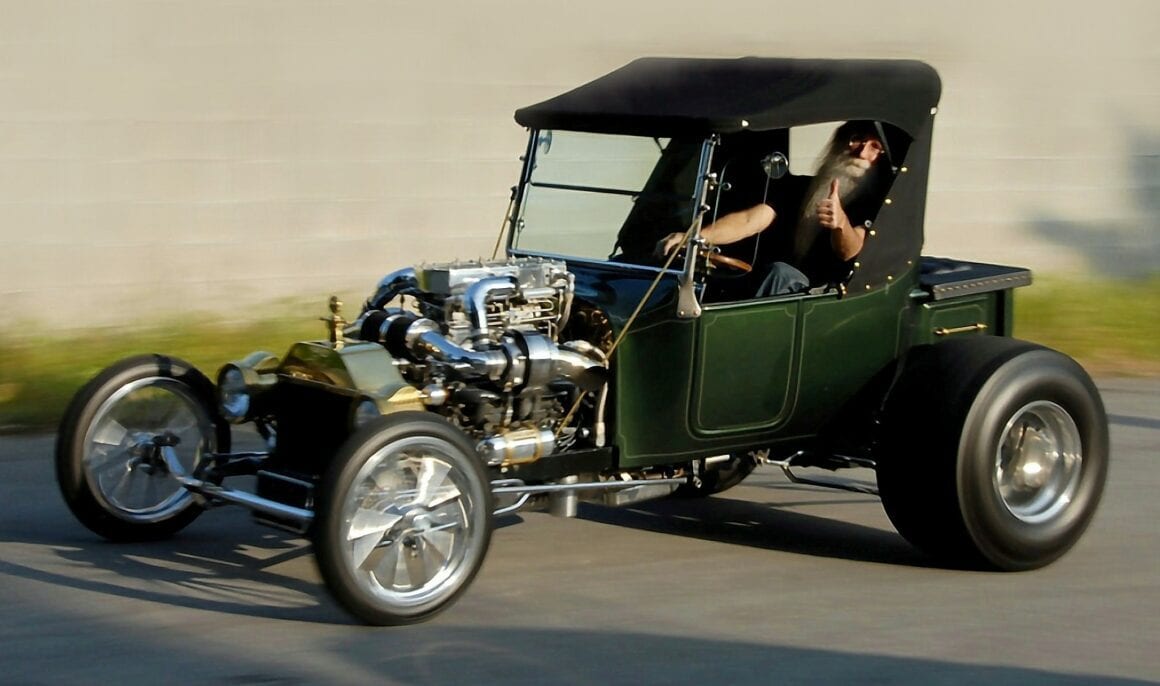 Le Hot-Rod de style 1923 Twin Turbo T’Bucket de Lee Sklar’s fait partie des petits poucets ayant balancé pas mal sans jamais avoir eu de réelle résonnance. Ce jeune pépère de 80 ans aurait pu rester dans l’ombre, à l’instar des millions d’anonymes fanatiques de Hot-Rod’s toujours aussi productifs depuis les années ’50/’60. Personnellement, je n’avais jamais entendu parler de ce gars et de son T’Bucket qui aurait pu rester (à tort) dans la masse des nainonymes. Déboulant au volant de son Hot-Rod dans divers show’s et rassemblements de Hot-Rodders, affublé d’un drapeau américain taillé en gilet sur le dos, ce diable de Lee Sklar’s m’a violé les rétines tant il est une sorte de croisement vivant entre le Old’Style et une digression Cyberpunk façon troisième âge en crise existentielle. Il a ainsi réussi à connecter mon système neuronal à des souvenirs aux relents nostalgiques.