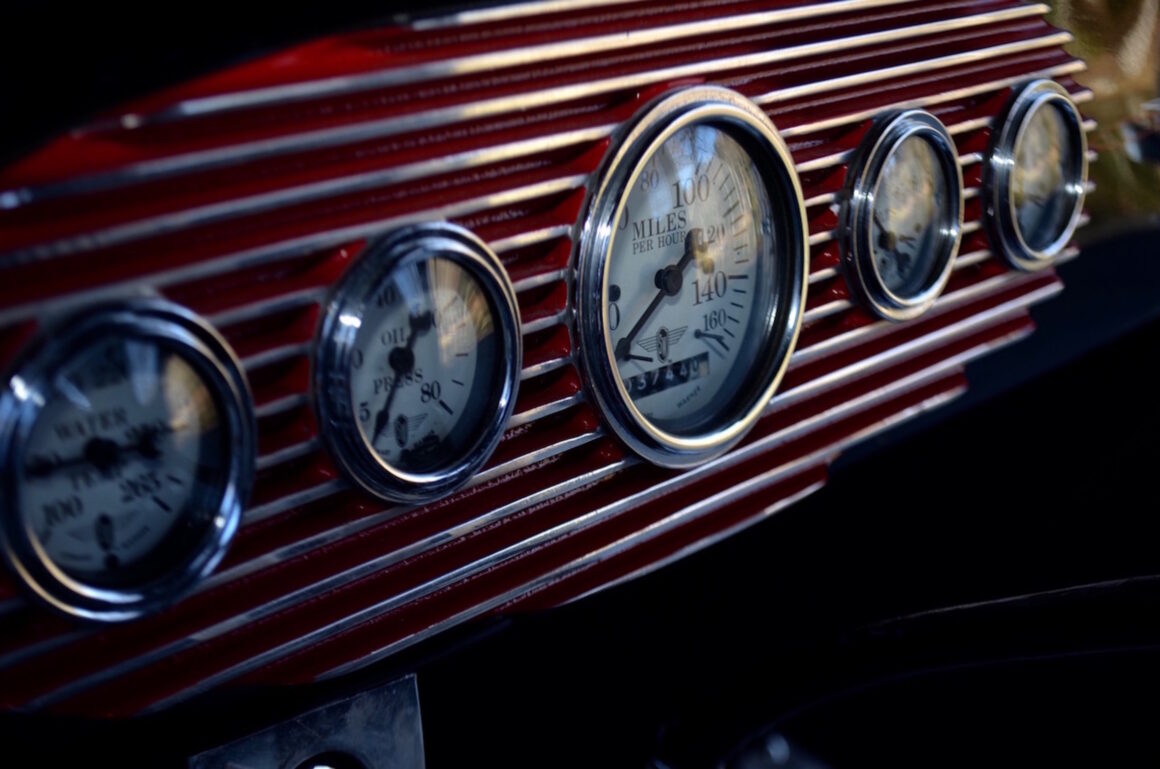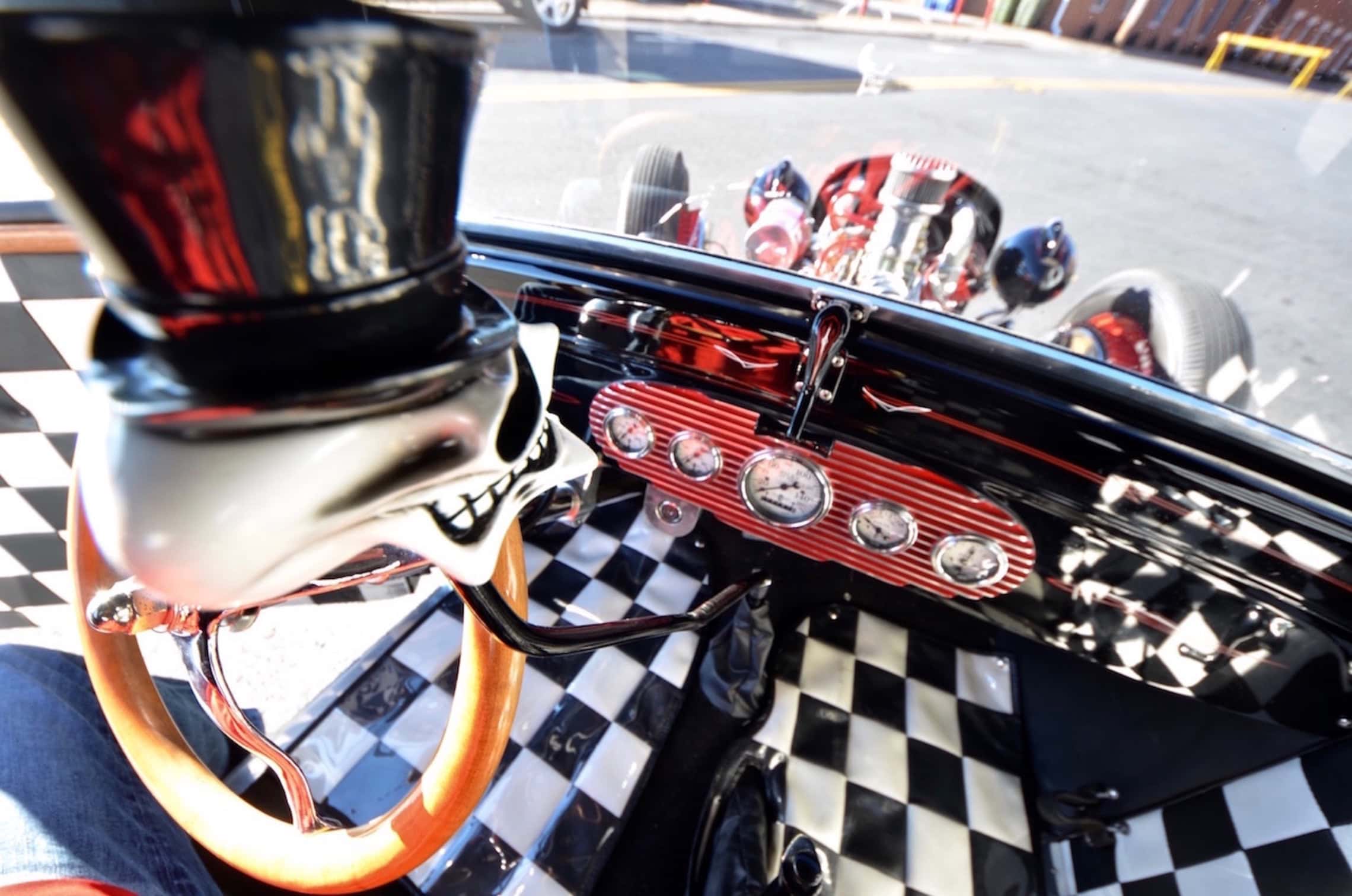 Comme mentionné plus avant, il avait été déterminé qu’il y avait trop de surfaces vitrées pour un Hot Rod Coupe’T, il a donc été emmené chez “Custom Works” où Michael Blanton s’est occupé des modifications de carrosserie. Ce qui est “rafraîchissant”, c’est la retenue utilisée dans la construction globale. Ouiiii ! Retenue !!! Les poignées des portes et les charnières d’origine sont toujours en place et bien que le pare-feu ait été lissé, il est de la même couleur que la carrosserie. Un changement subtil qui passe souvent inaperçu est l’abréviation du pare-soleil. Lorsque les panneaux étaient droits au laser, la peinture noire DuPont Chroma Premier a été posée par John Smith. Mark Peters a donné à la carrosserie et au châssis cette touche finale de détails inédits que je vous laisse découvrir. À l’intérieur, le Coupé est “pur des HotRod’s des années 50” avec un motif à carreaux noir et blanc pour l’intérieur.